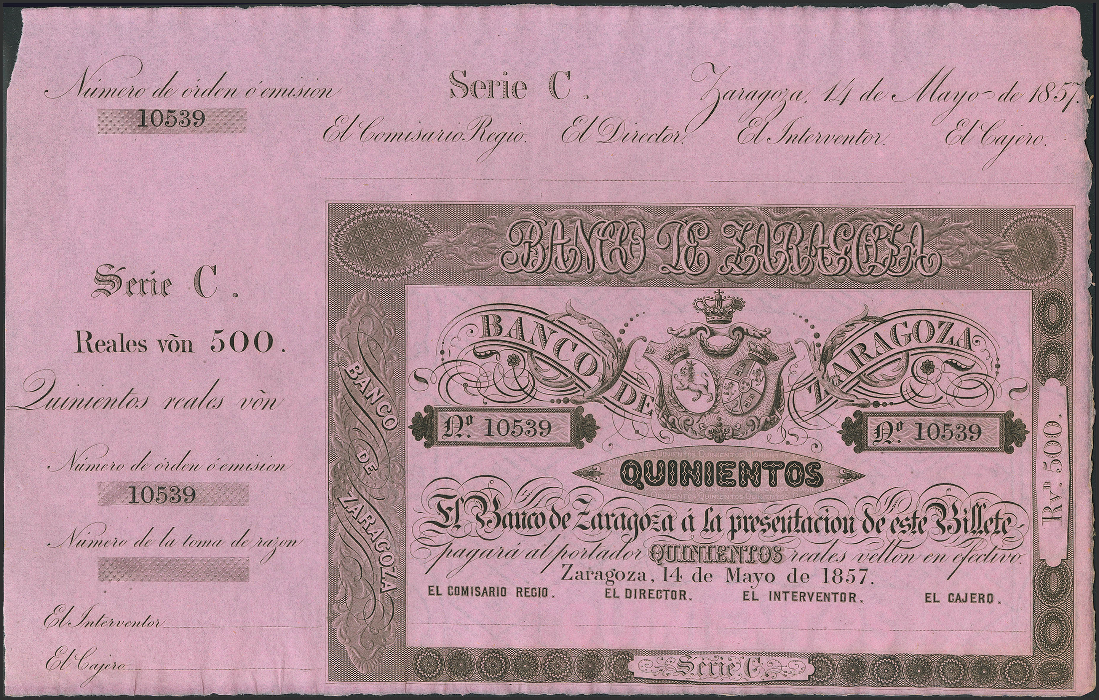500 Reales. 14 de Mayo de 1857. Banco de Zaragoza. Serie C y con matriz. (Edifil 2021: 128B). Apresto original. SC-.