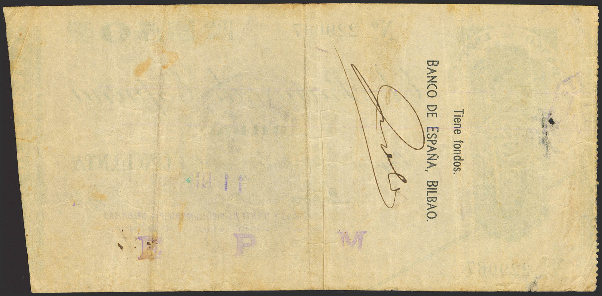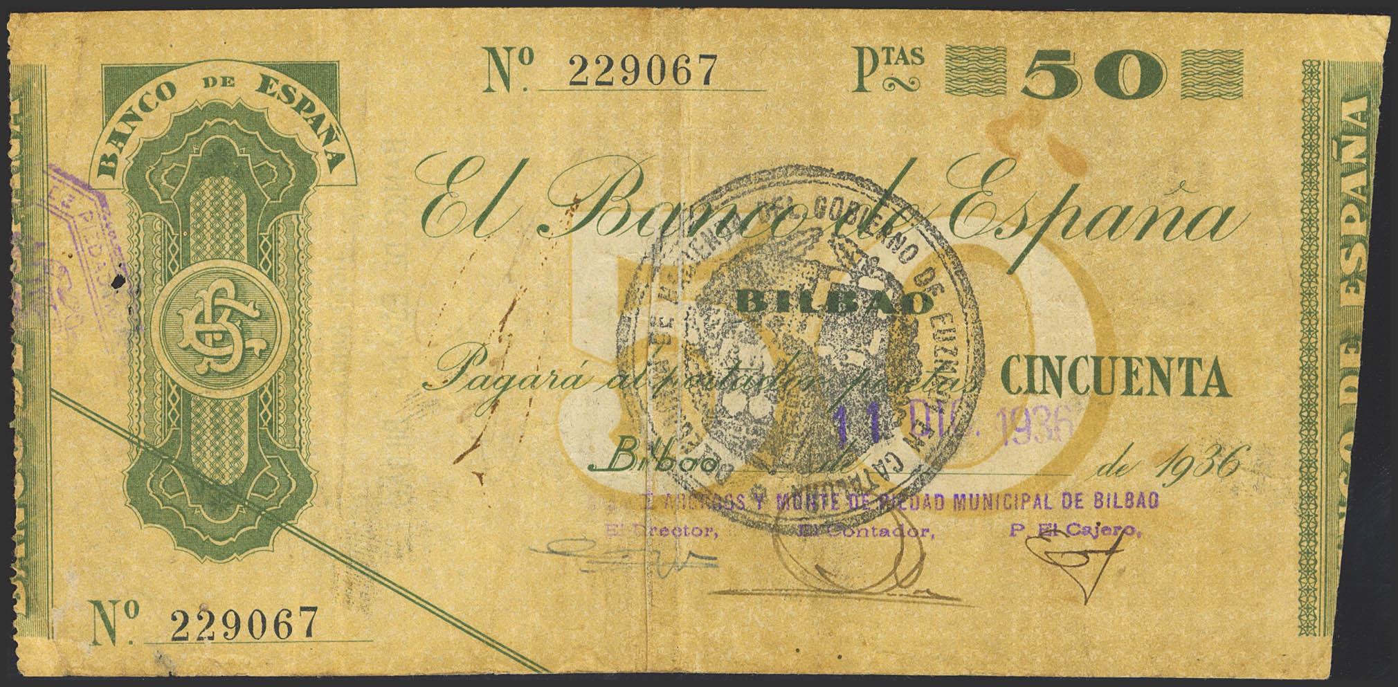 50 Pesetas. 1936. Sin serie. Sucursal de Bilbao y antefirma Caja de Ahorros y Monte de Piedad Municipal de Bilbao y en el anverso tampón GOBIERNO DE EUZKADI / EUZKADIKO JAURIARITZA / HACIENDA, en negro, magnífica estampación. (Edifil 2023: 370f). Rarísimo, ligera erosión sin importancia. MBC-.