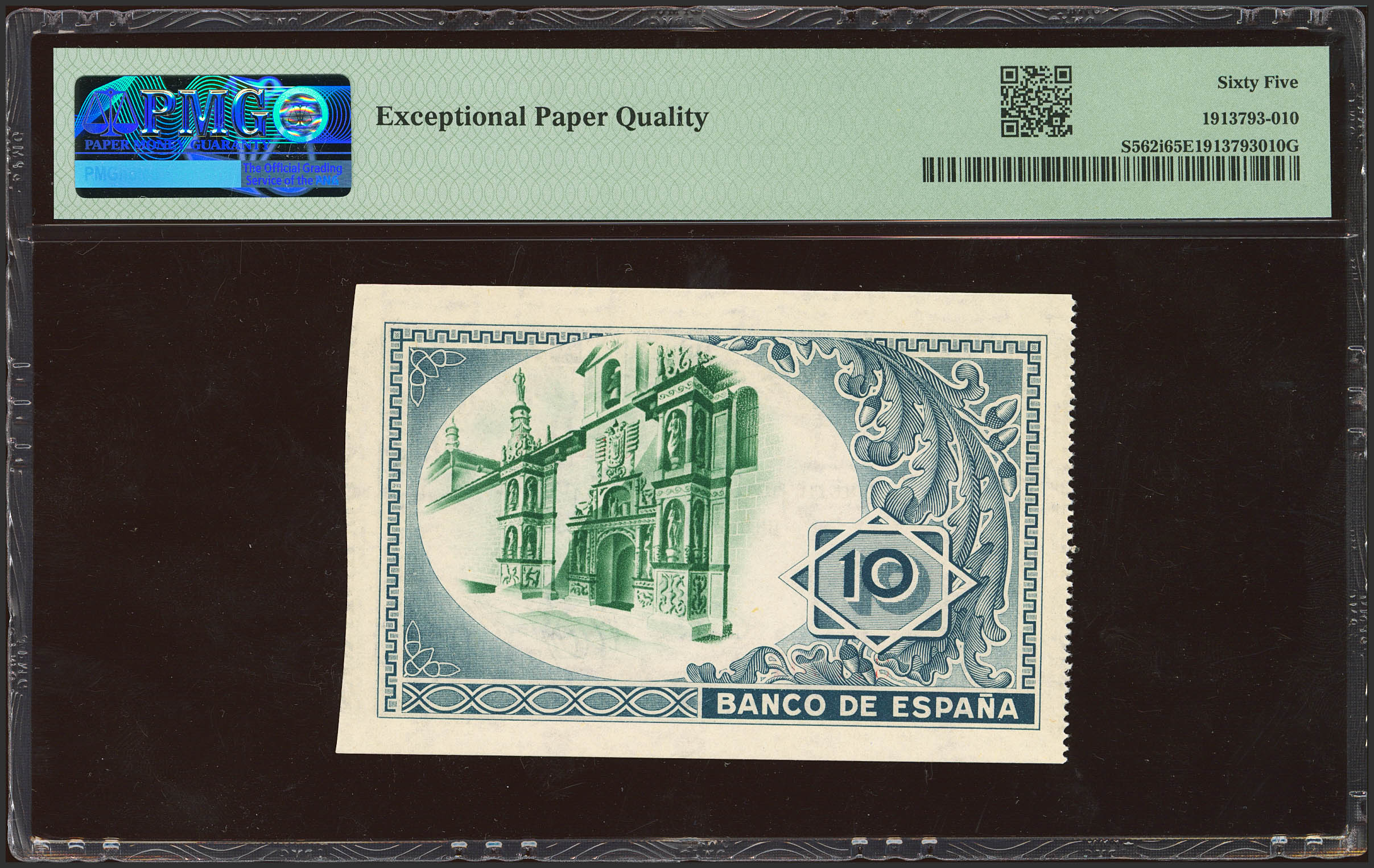 10 Pesetas. 1 de Enero de 1937. Sucursal de Bilbao, antefirma Banco Central. Sin serie, con numeración y sin matrices. (Edifil 2023: 387c, Pick: S562i). Apresto original. SC. Encapsulado PMG65EPQ.