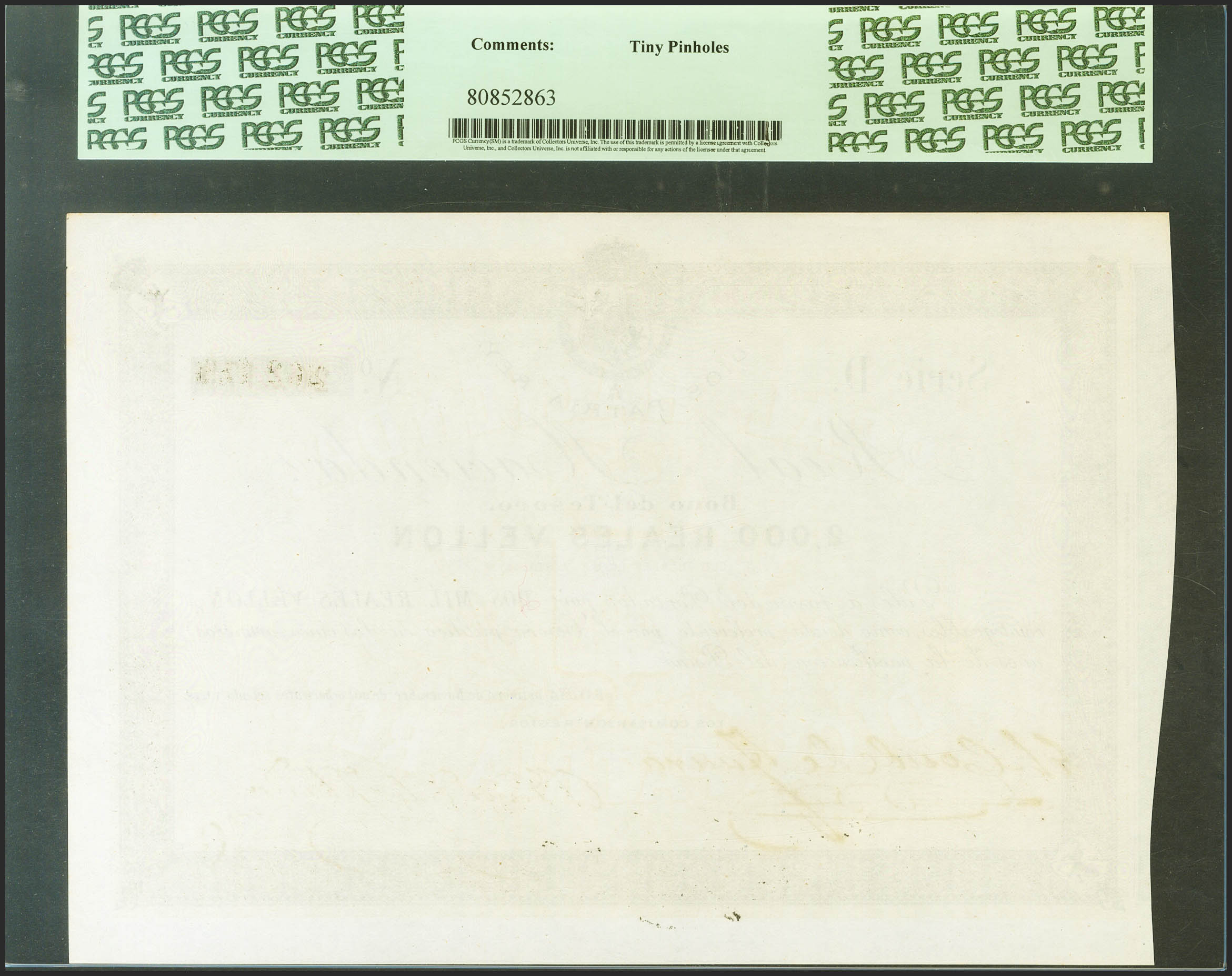 2000 Reales de Vellón. 1 de Noviembre de 1873. Real Hacienda. Serie D. (Edifil 2021: 213). Inusual en esta calidad. SC. Encapsulado PCGS63 (tiny pinholes).