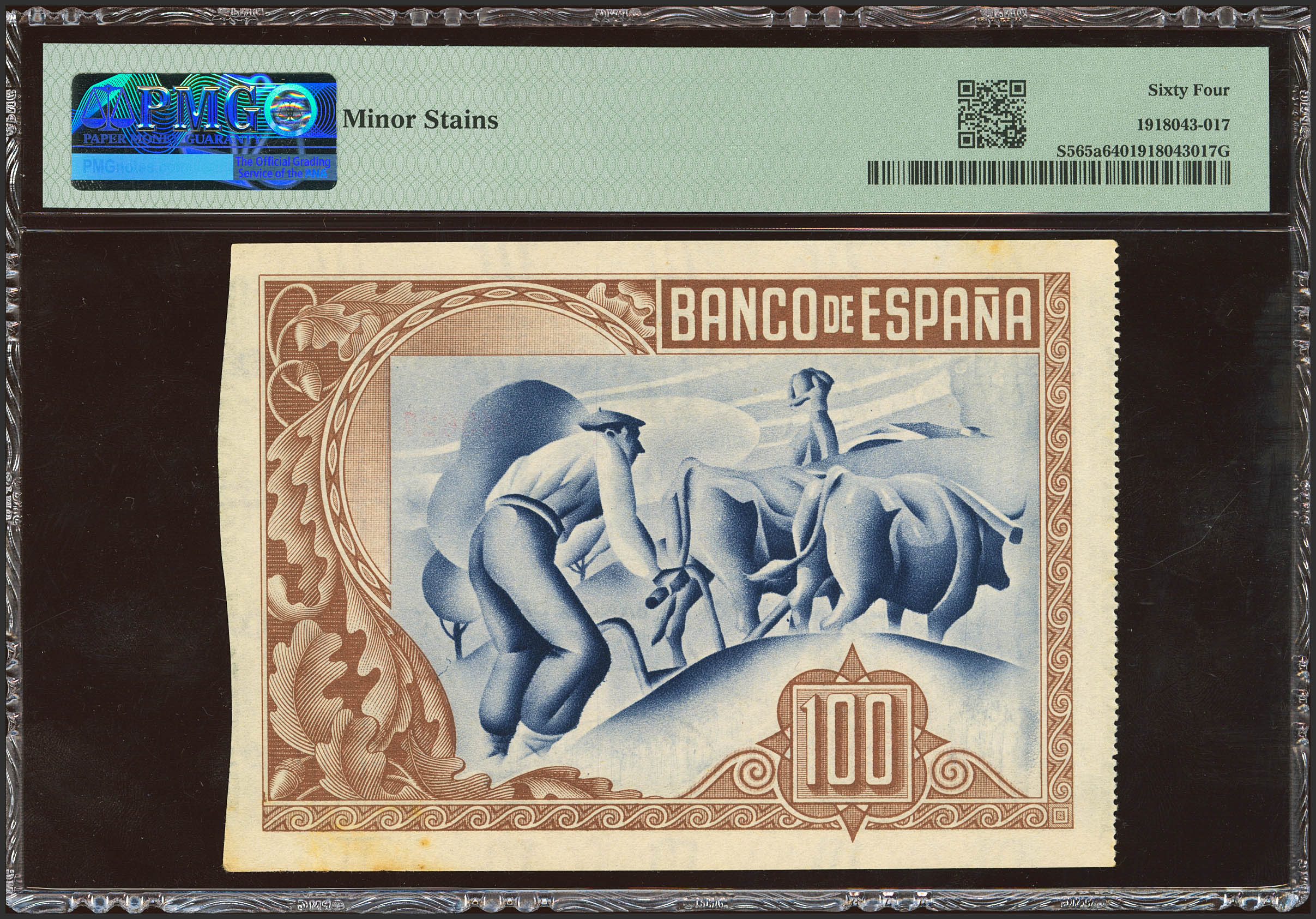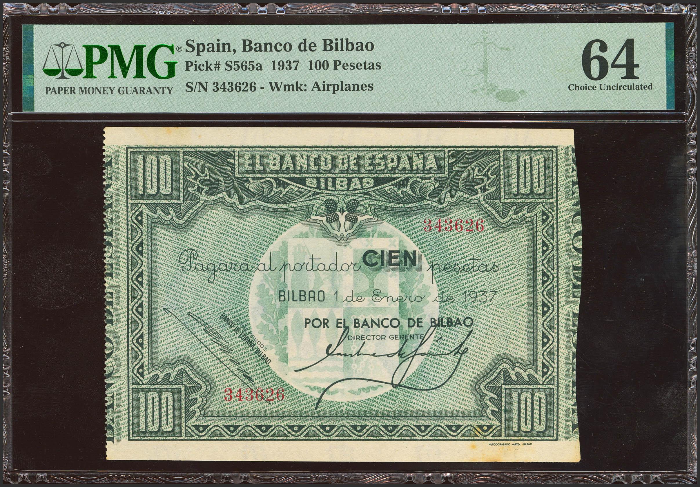 100 Pesetas. 1 de Enero de 1937. Sucursal de Bilbao, antefirma Banco de Bilbao. (Edifil 2023: 390a, Pick: S565a). Rarísimo en esta excepcional calidad, manchitas del tiempo habituales. SC-. Encapsulado PMG64 (minor stains)(para hacernos idea de la rareza, a fecha 1 de Junio de 2024, este billete es el séptimo mejor calificado junto a otros cuatro billetes en PMG)