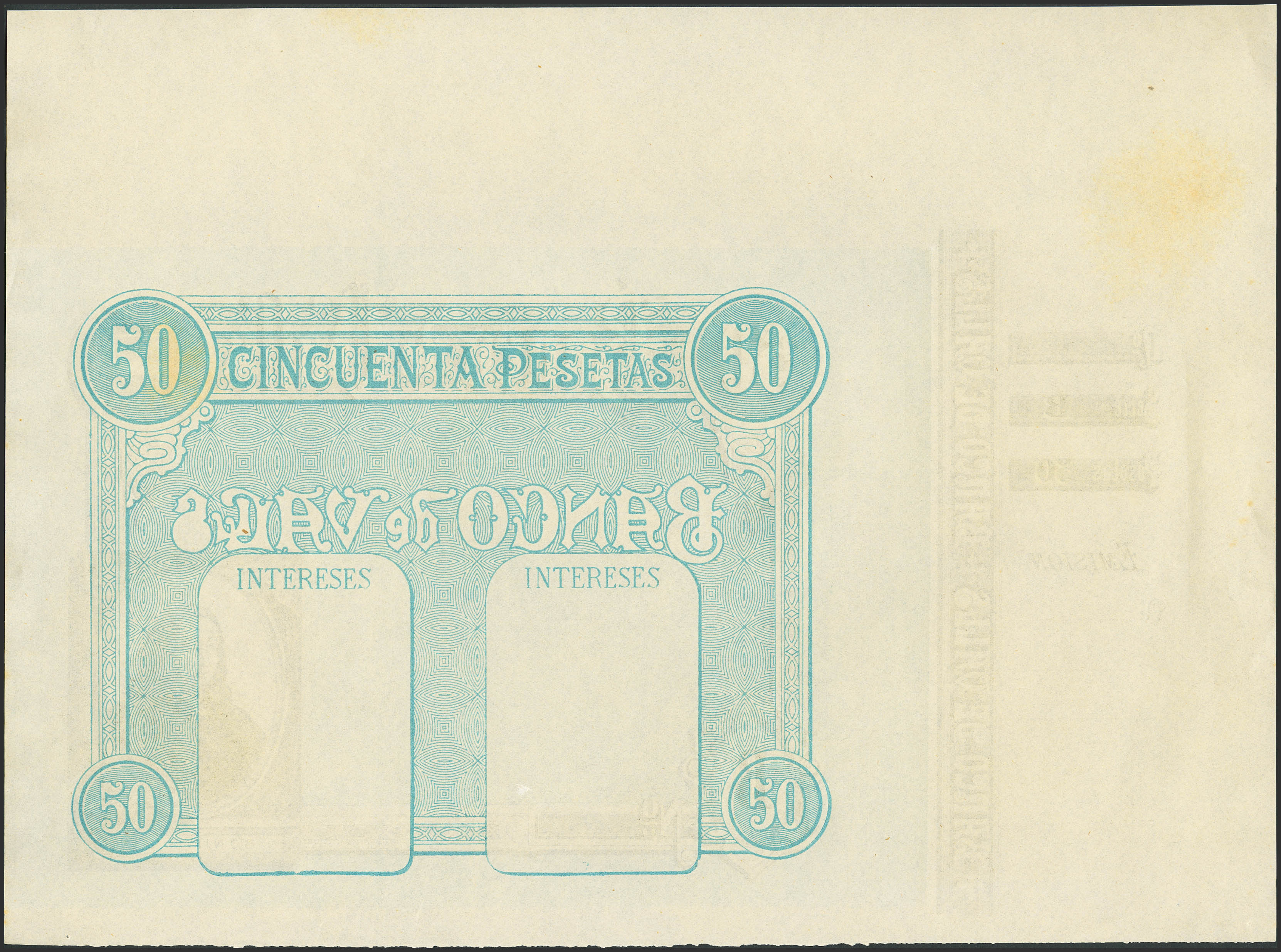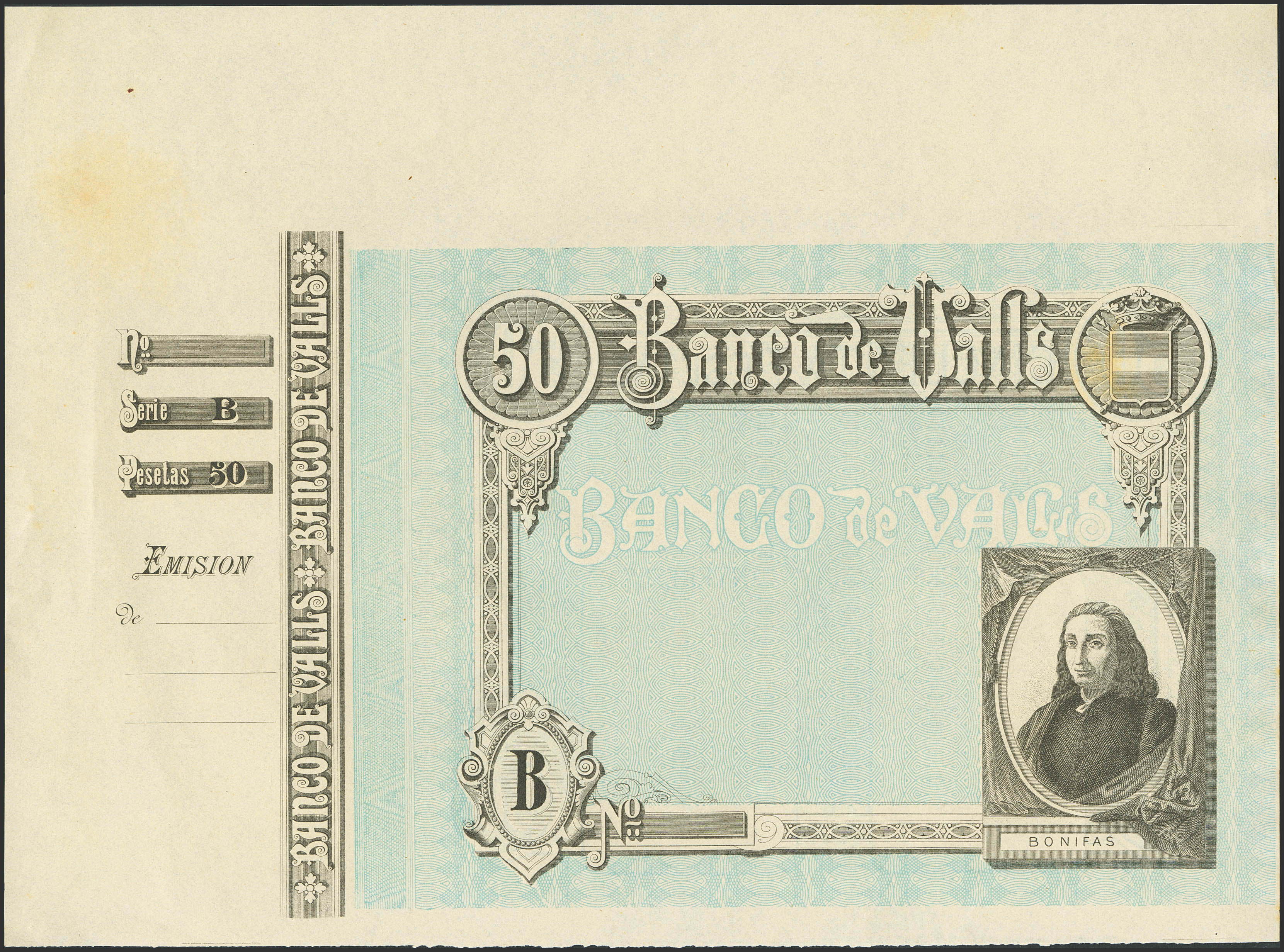 50 Pesetas. (1892ca). Banco de Valls. Prueba de Impresión, con matriz a la izquierda y sin texto. Serie B. (Ruíz y Alentorn: 931). Manchitas del tiempo. SC--.