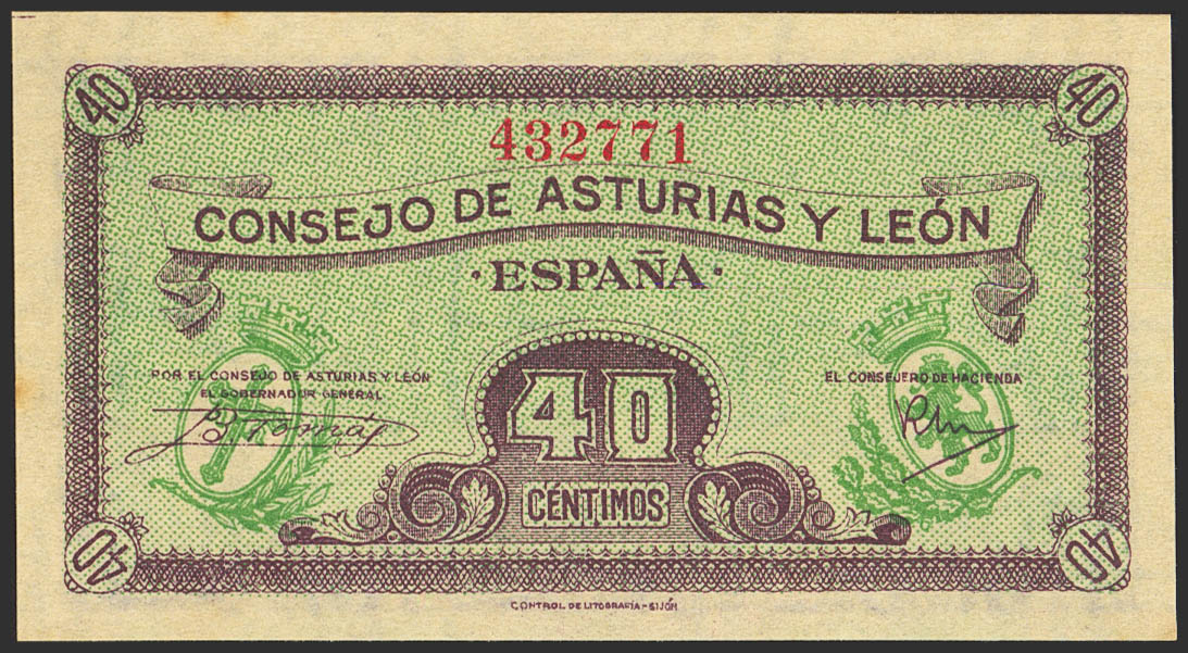 40 Céntimos. 1937. Asturias y León. Sin serie. (Edifil 2023: 395). Apresto original, habituales manchitas del tiempo. SC-.