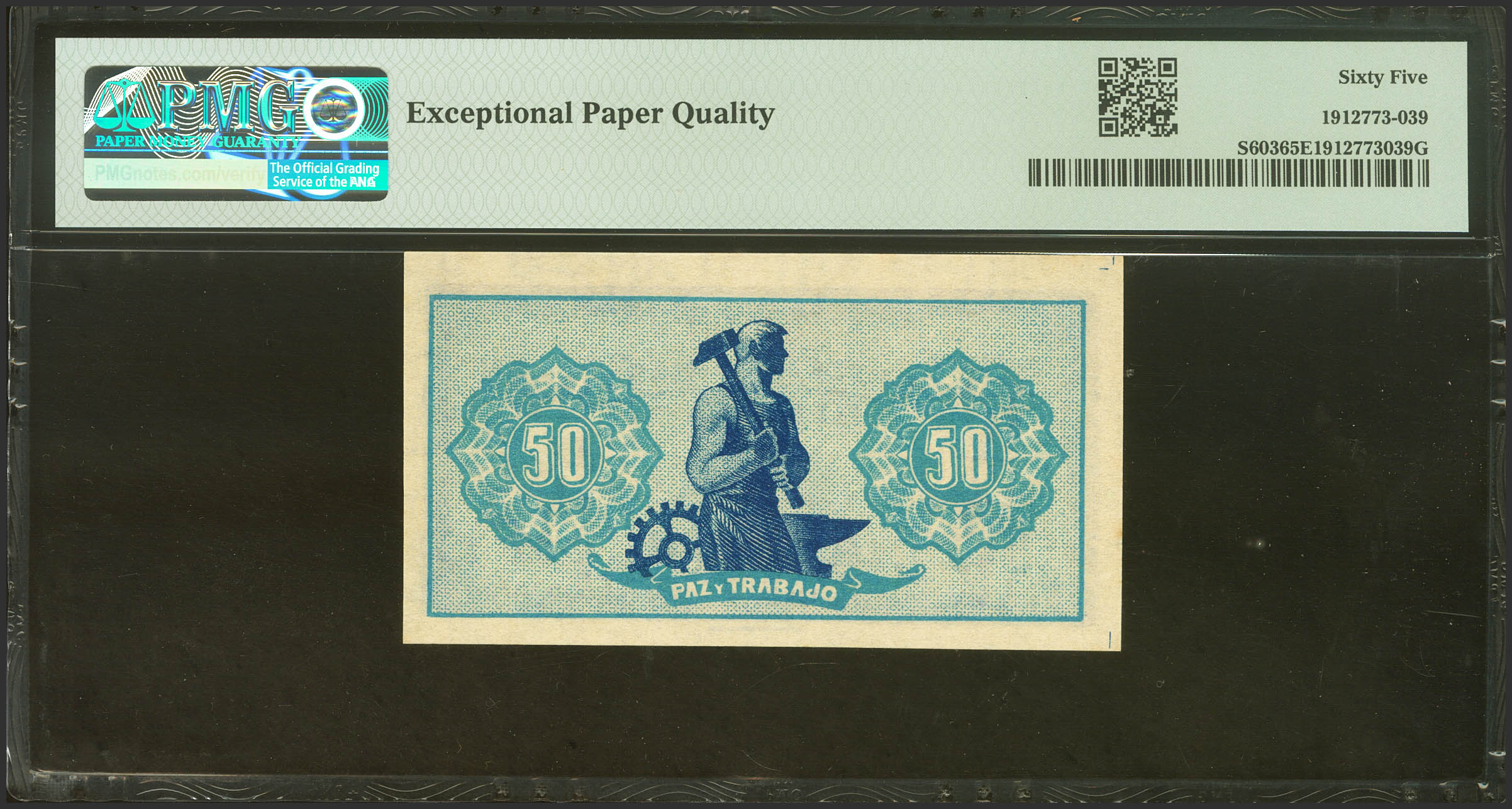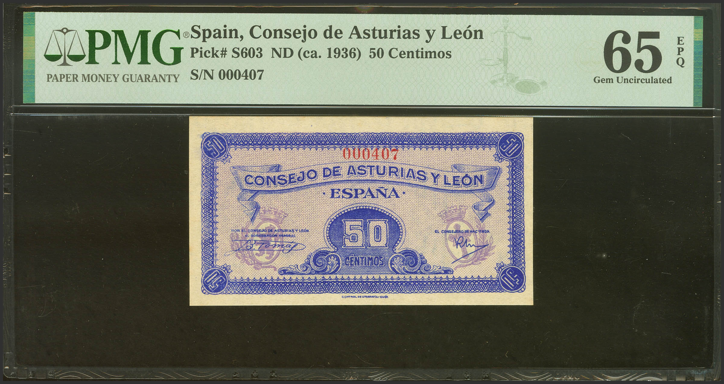 50 Céntimos. 1937. Asturias y León. Sin serie y numeración bajísima. (Edifil 2021: 396, Pick: S603). Rarísimo, especialmente en esta excepcional calidad, apresto original. SC. Encapsulado PMG65EPQ.