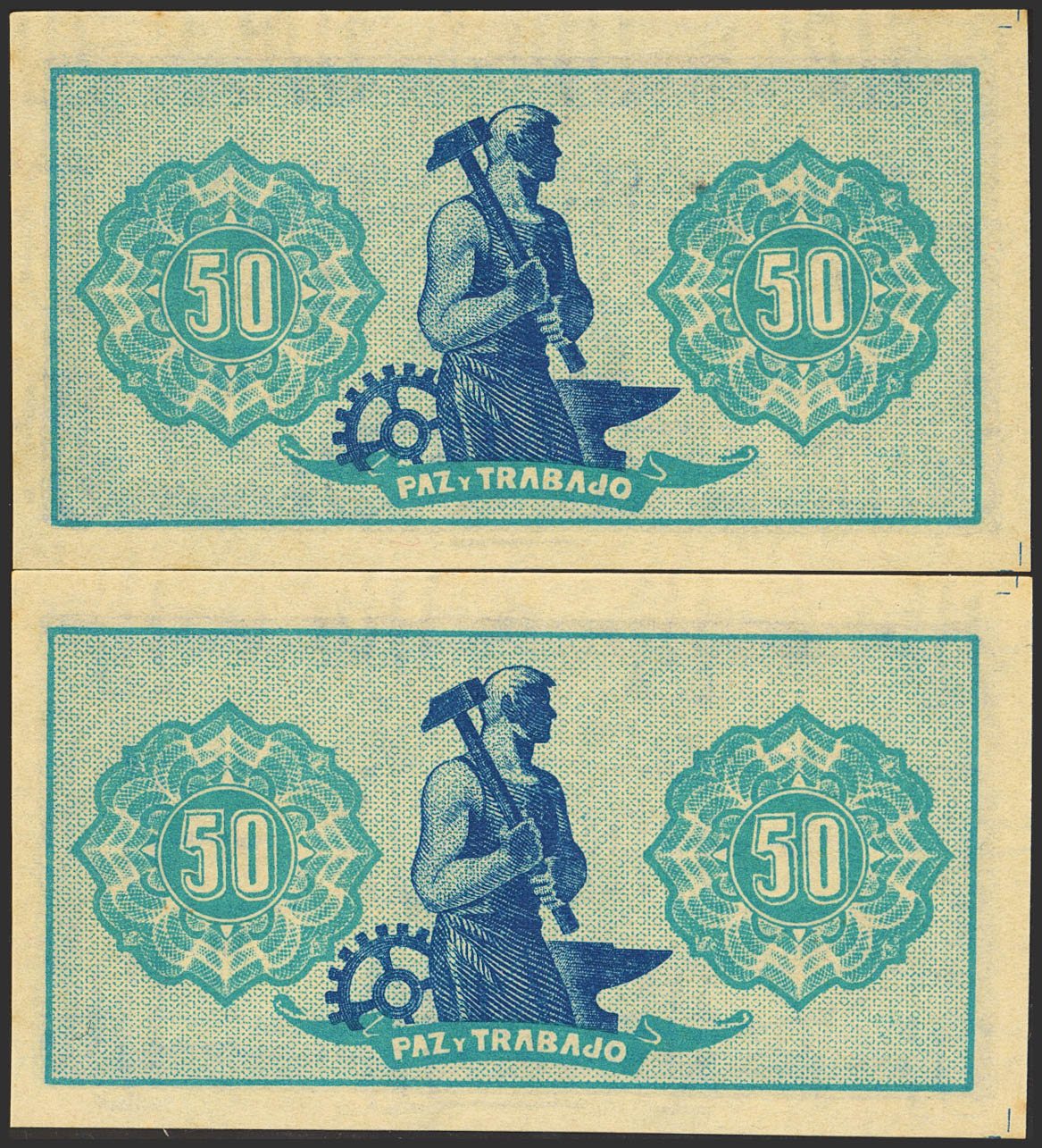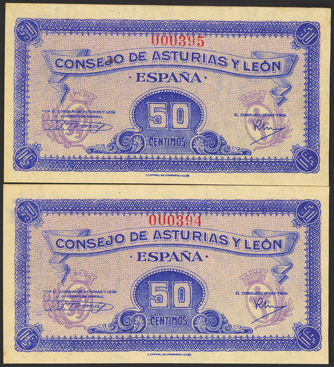 50 Céntimos. 1937. Asturias y León. Pareja correlativa. Sin serie y numeración bajísima (Nº000395/394). (Edifil 2023: 396). Muy raro en esta calidad, apresto original. SC.