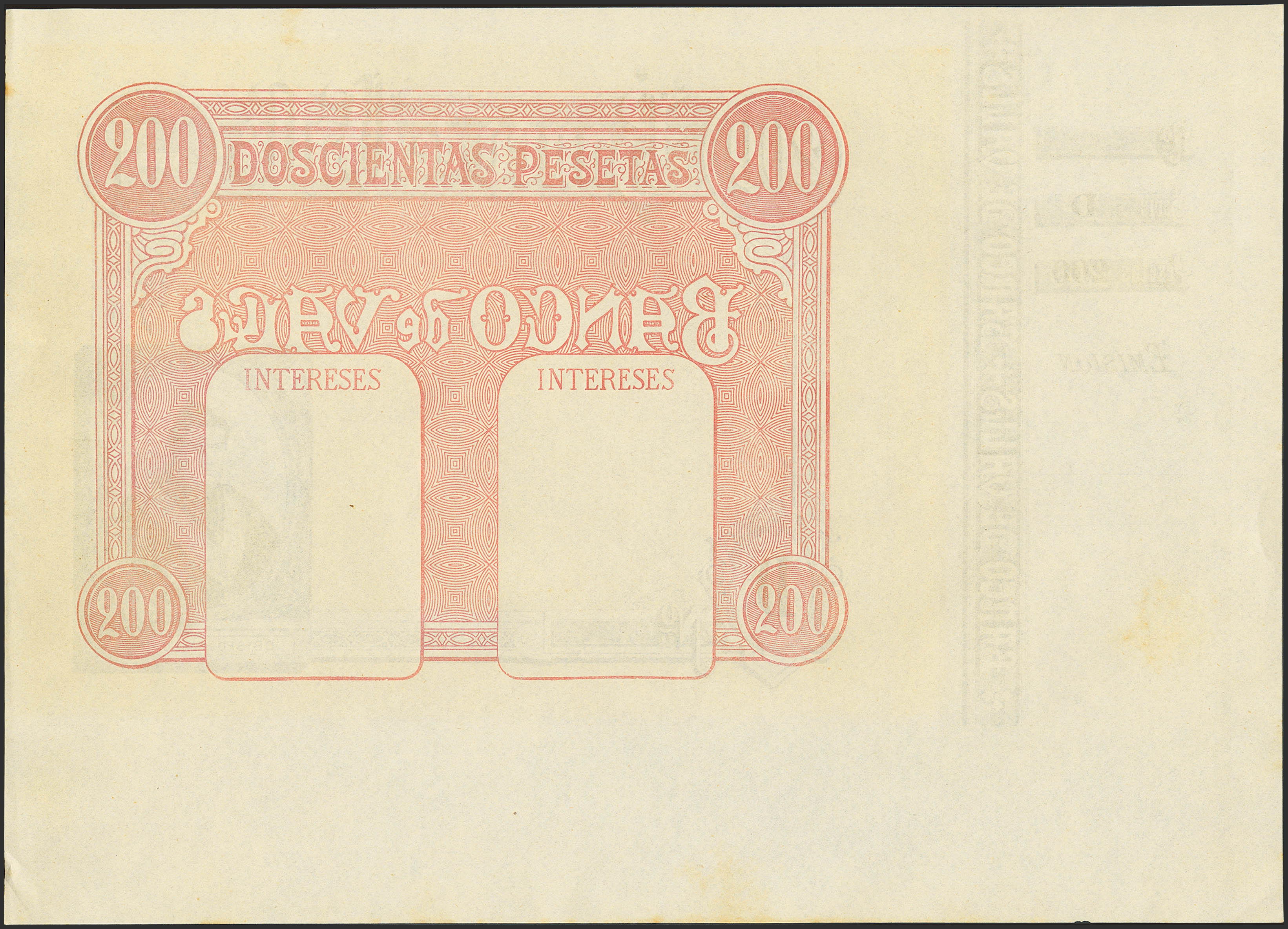 200 Pesetas. (1892ca). Banco de Valls. Prueba de Impresión, con matriz a la izquierda y sin texto. Serie D. (Ruiz y Alentorn: 933). Manchitas del tiempo. SC--.