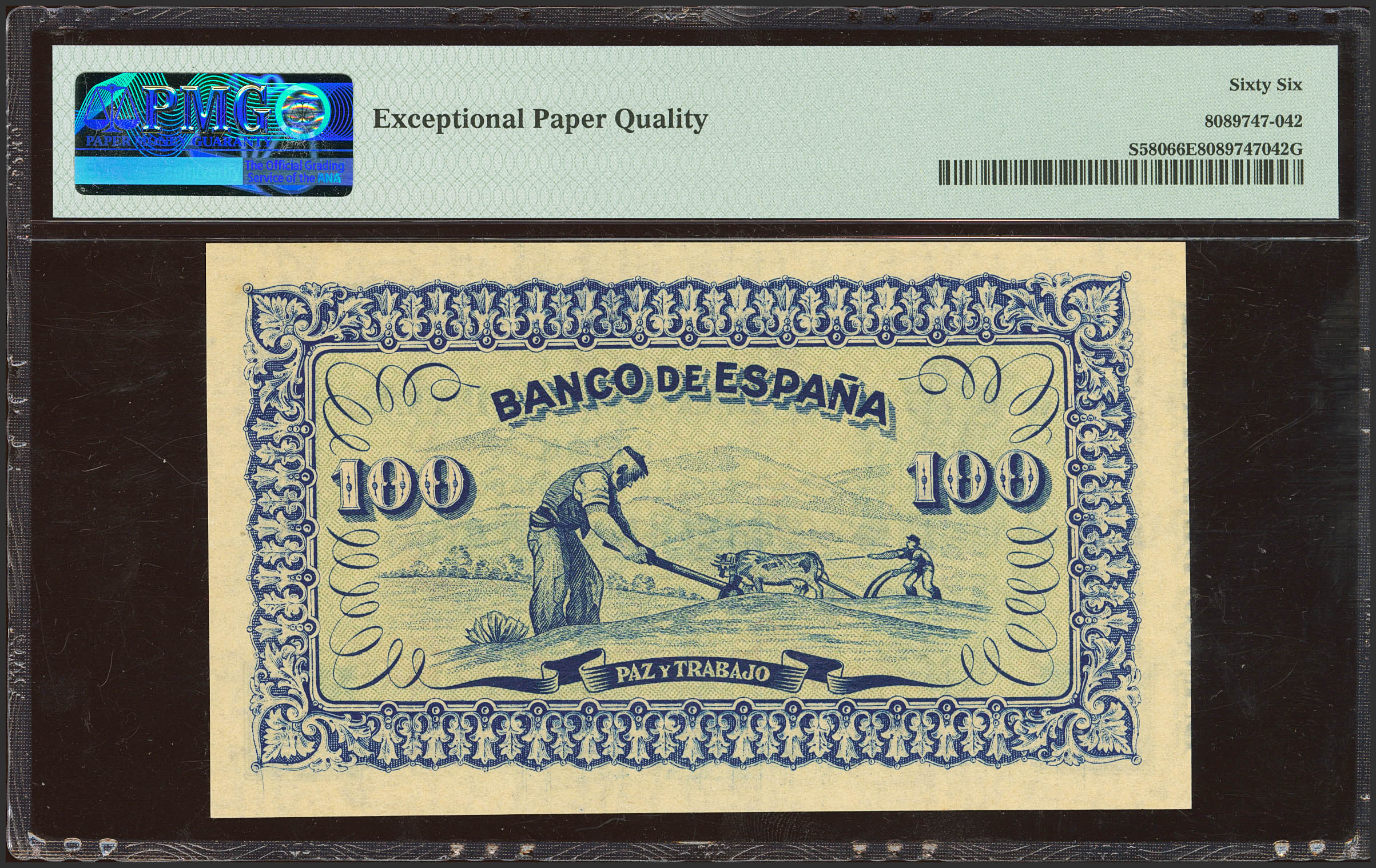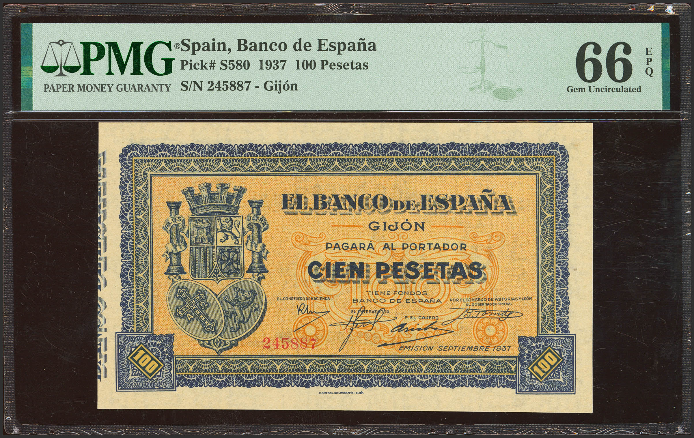 100 Pesetas. Septiembre 1937. Sucursal de Gijón. Sin serie. (Edifil 2023: 399, Pick: S580). Inusual en esta calidad, apresto original. SC. Encapsulado PMG66EPQ.