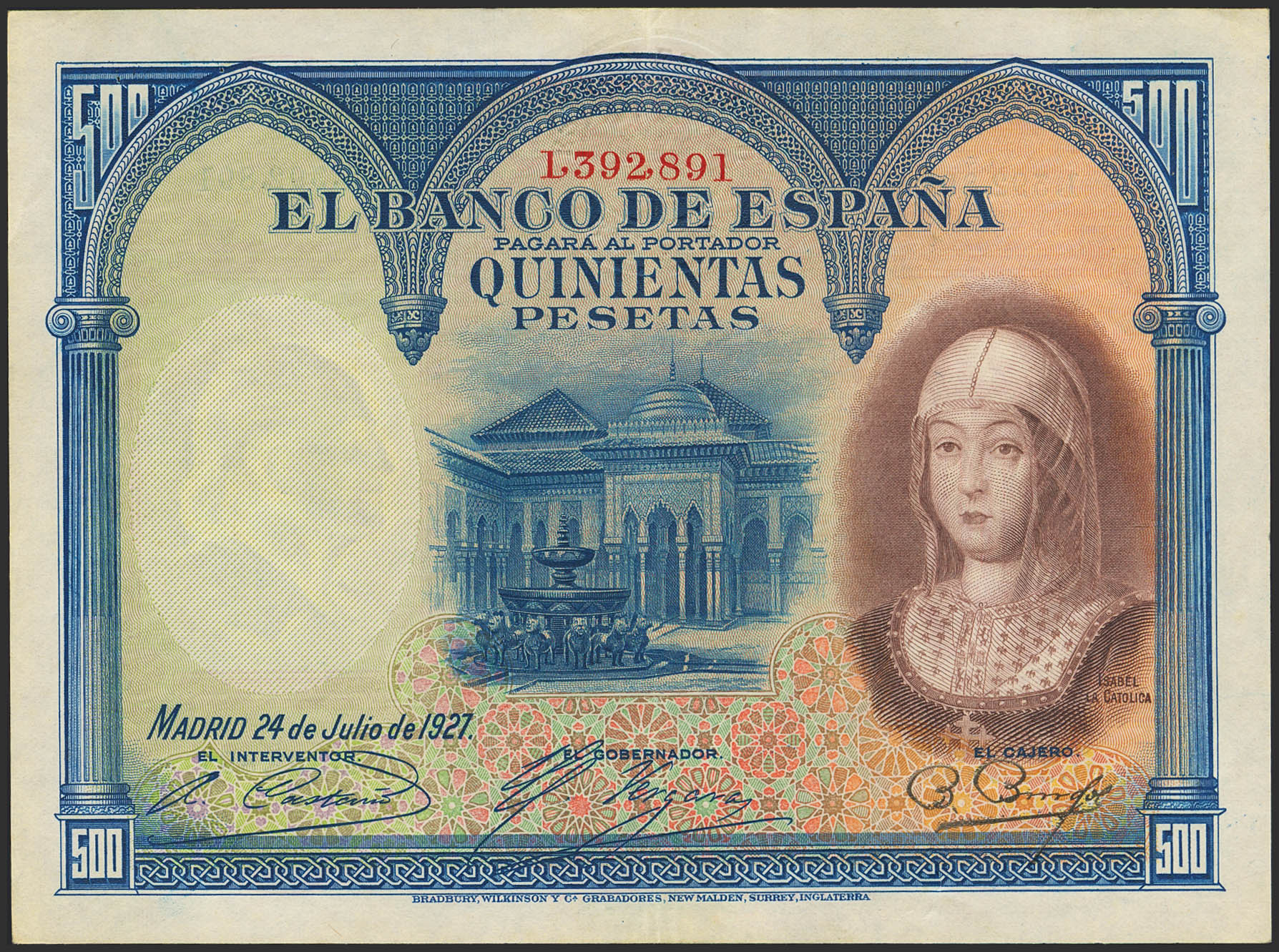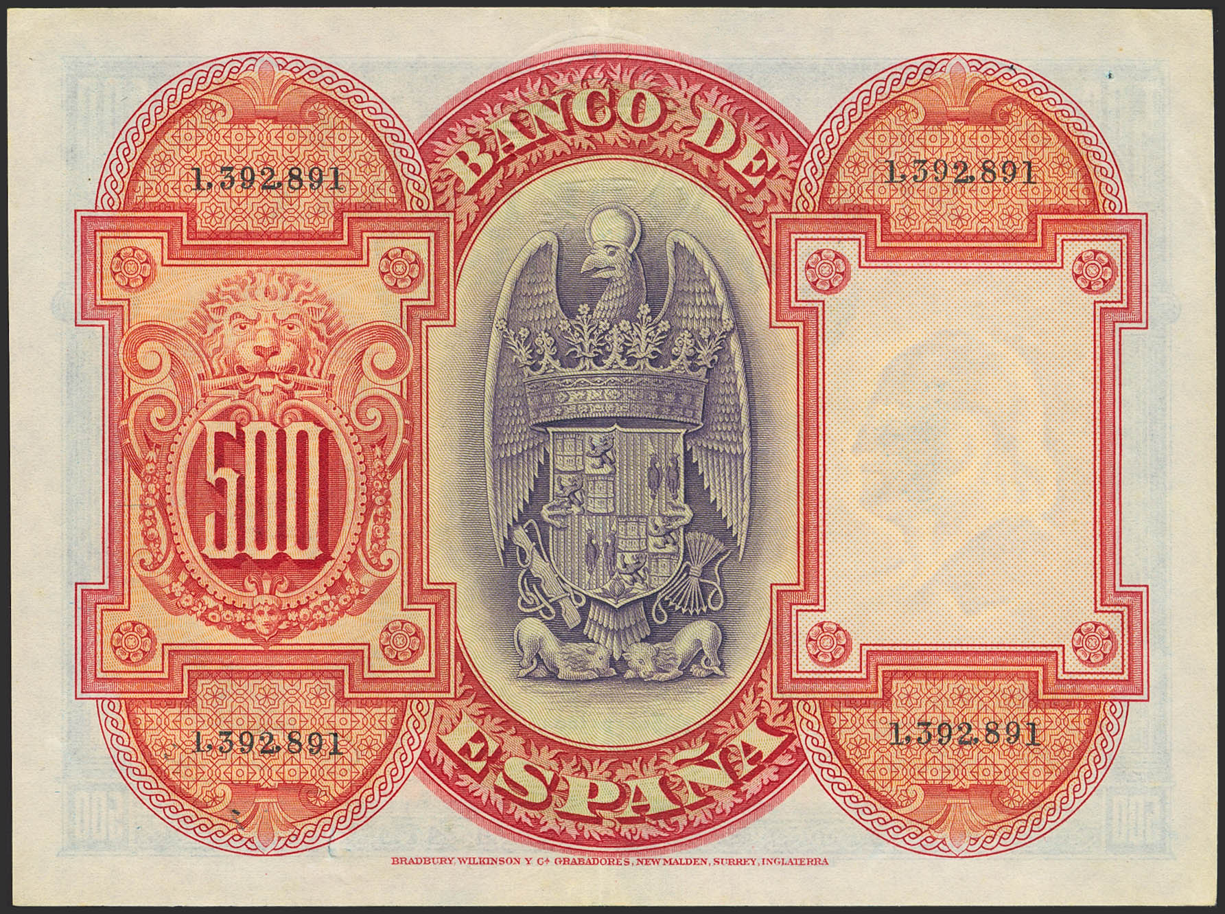 500 Pesetas. 24 de Julio de 1927. Sin serie y anterior a la numeración 1602000, con el sello en seco ESTADO ESPAÑOL / BURGOS (excepcionalmente estampado). (Edifil 2023: 413). Conserva gran parte de su apresto original, puntitos de grapa. EBC.