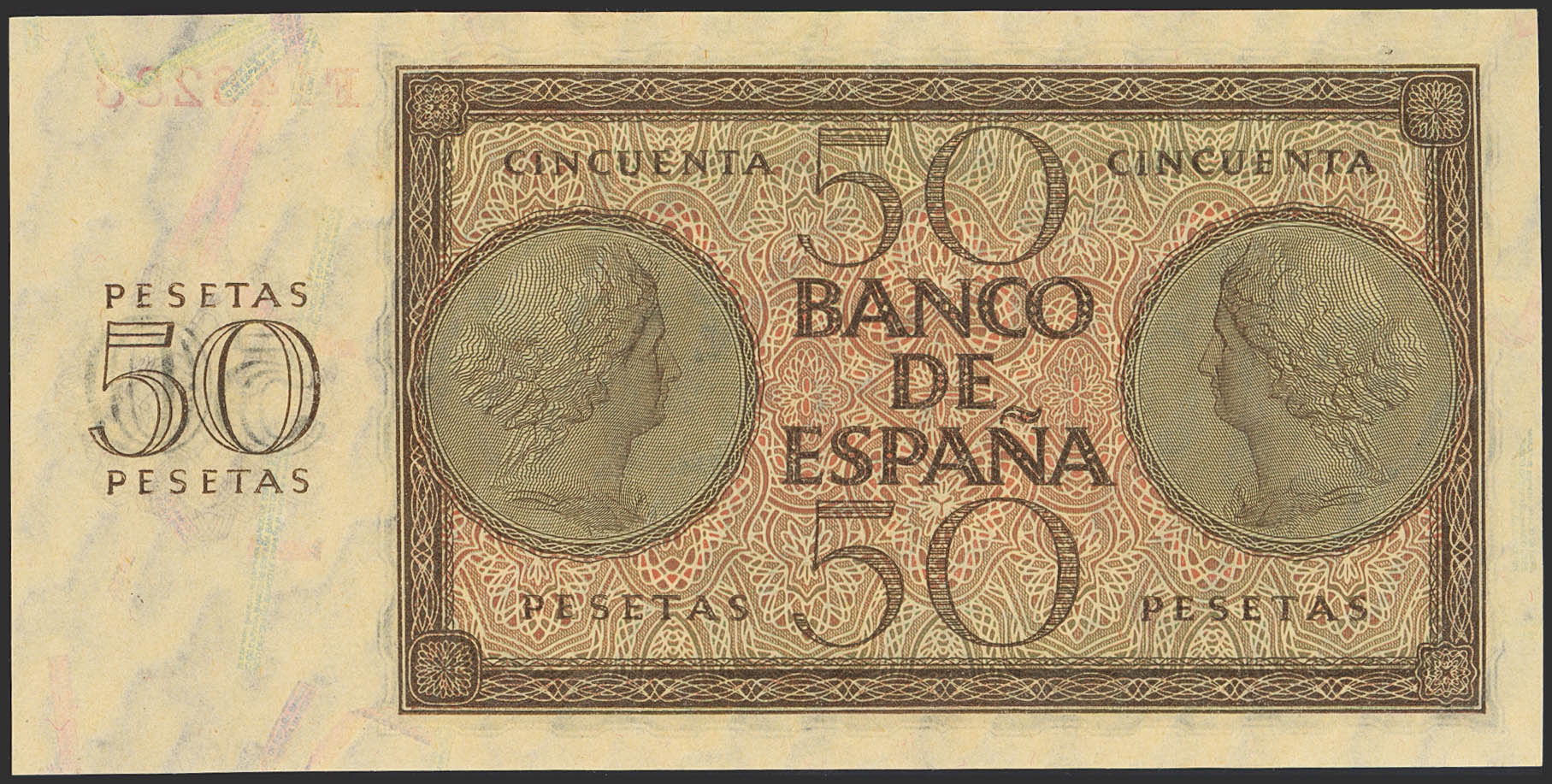 50 Pesetas. 21 de Noviembre de 1936. Serie F. (Edifil 2023: 420a). Raro en esta excepcional calidad, conserva parte de su apresto original. SC-.
