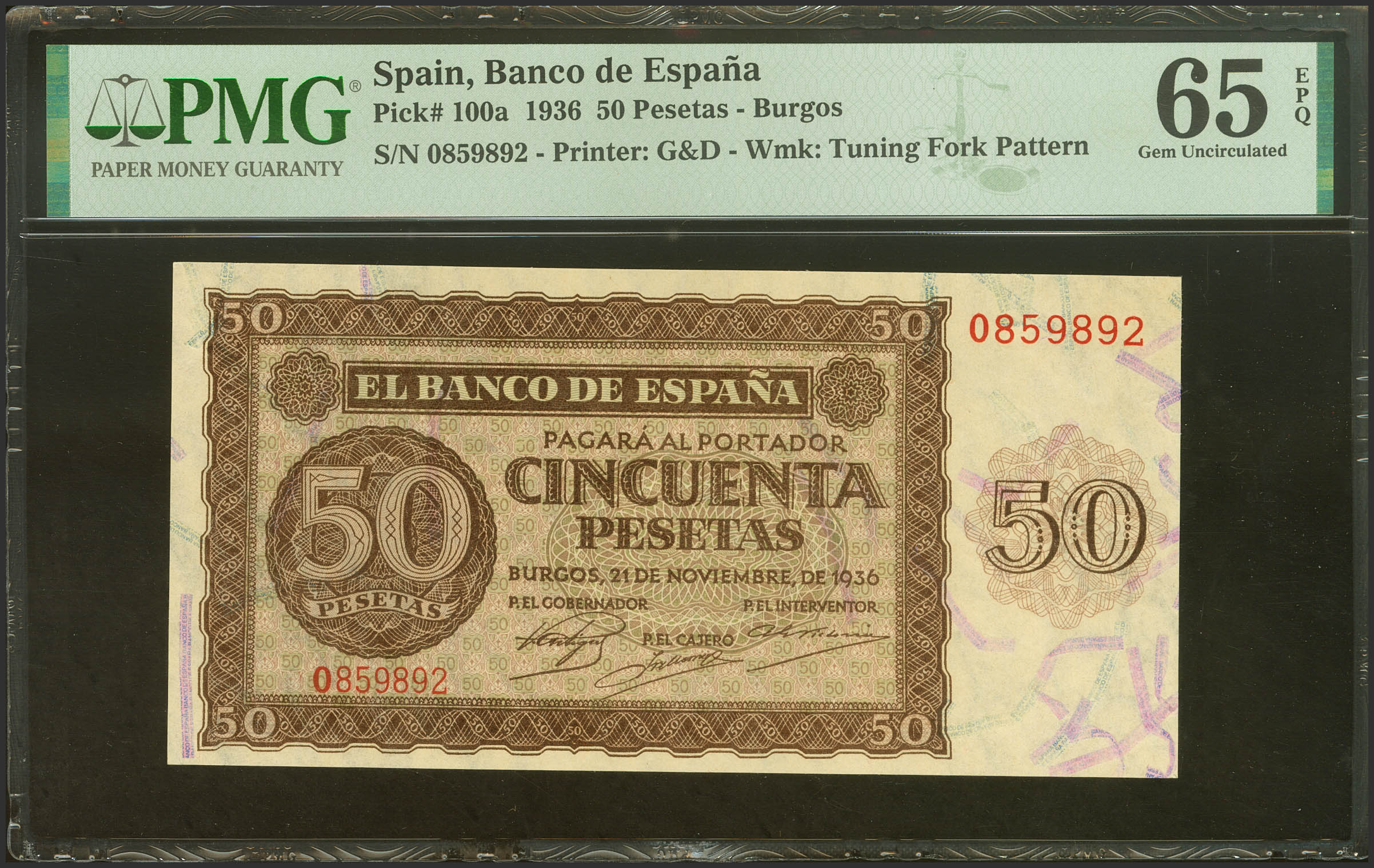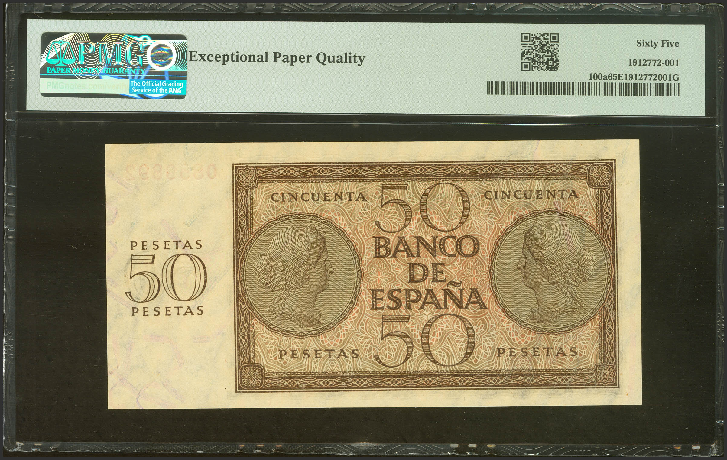 50 Pesetas. 21 de Noviembre de 1936. Serie O. (Edifil 2021: 420a, Pick 100a). Inusual en esta excepcional calidad, apresto original. SC. Encapsulado PMG65EPQ.