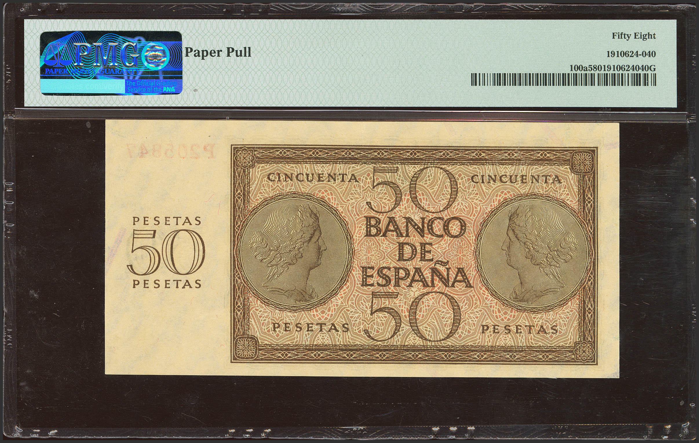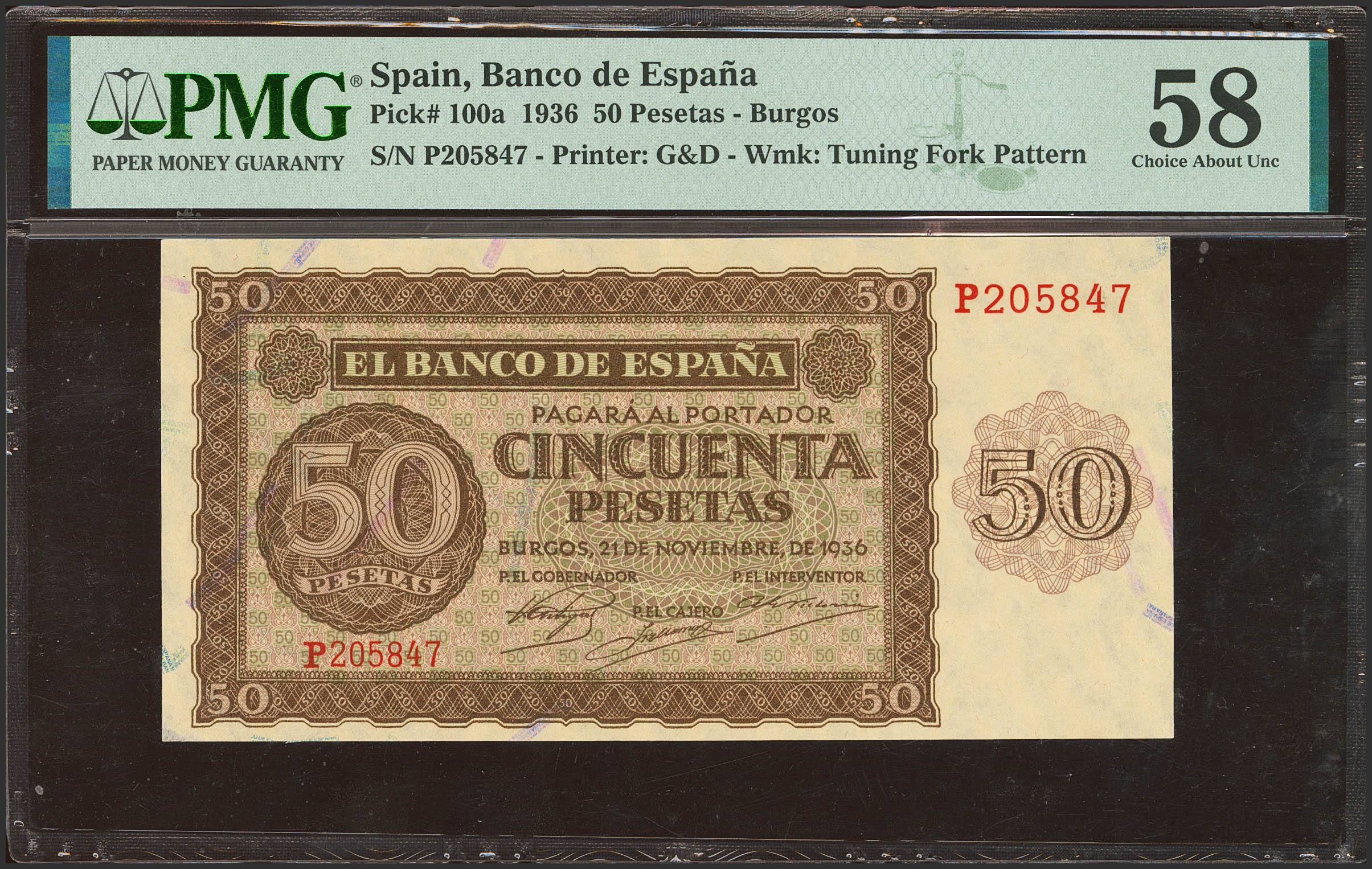 50 Pesetas. 21 de Noviembre de 1936. Serie P. (Edifil 2023: 420a, Pick: 100a). Conserva todo su apresto original. EBC++. Encapsulado PMG58 (paper pull).