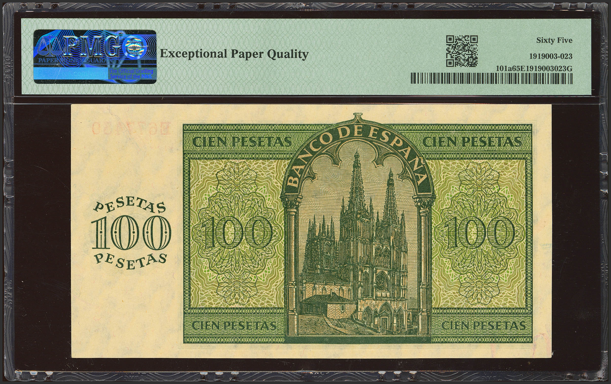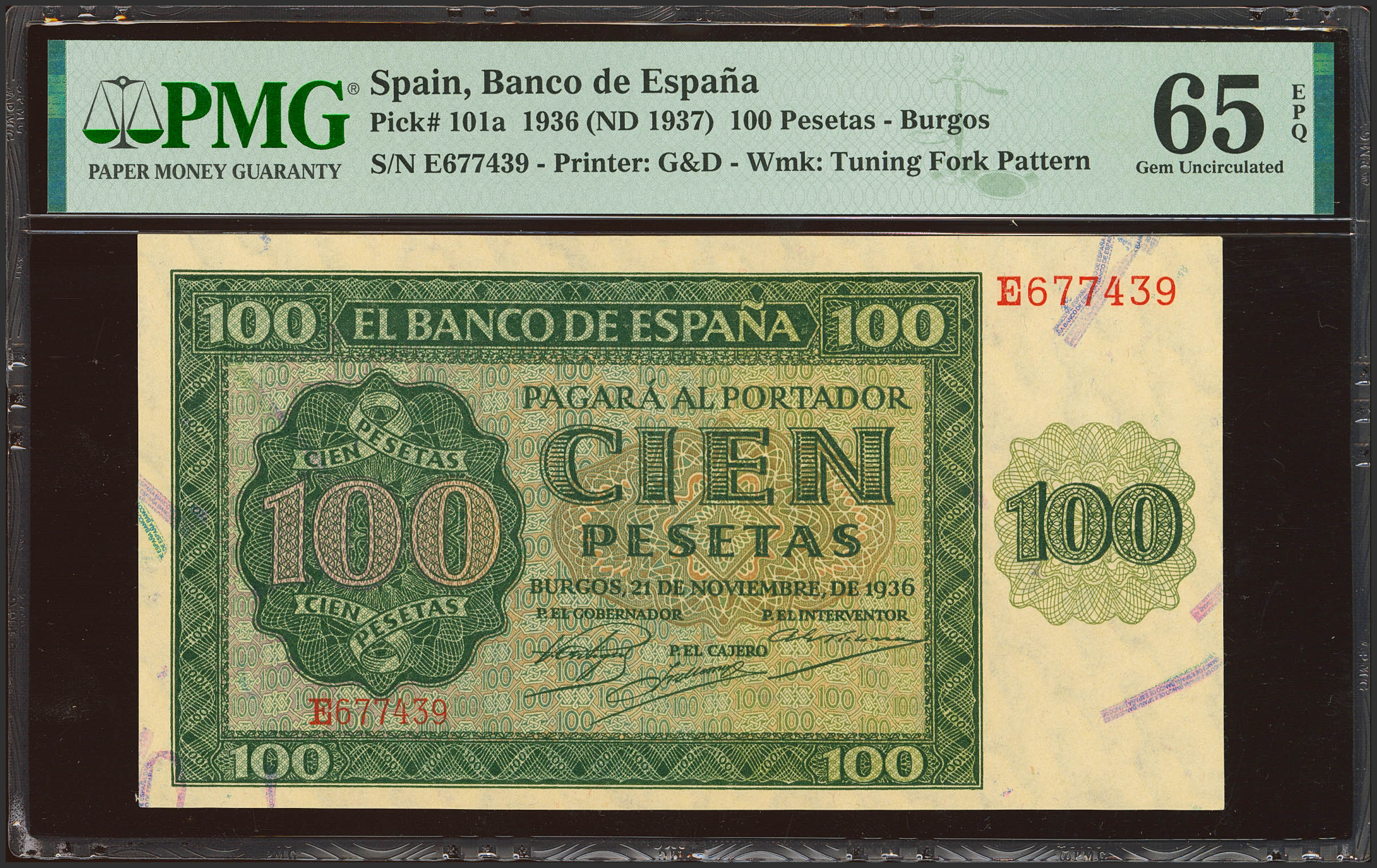 100 Pesetas. 21 de Noviembre de 1936. Serie E. (Edifil 2023: 421a, Pick: 101a). Raro en esta excepcional calidad, apresto original. SC. Encapsulado PMG65EPQ.