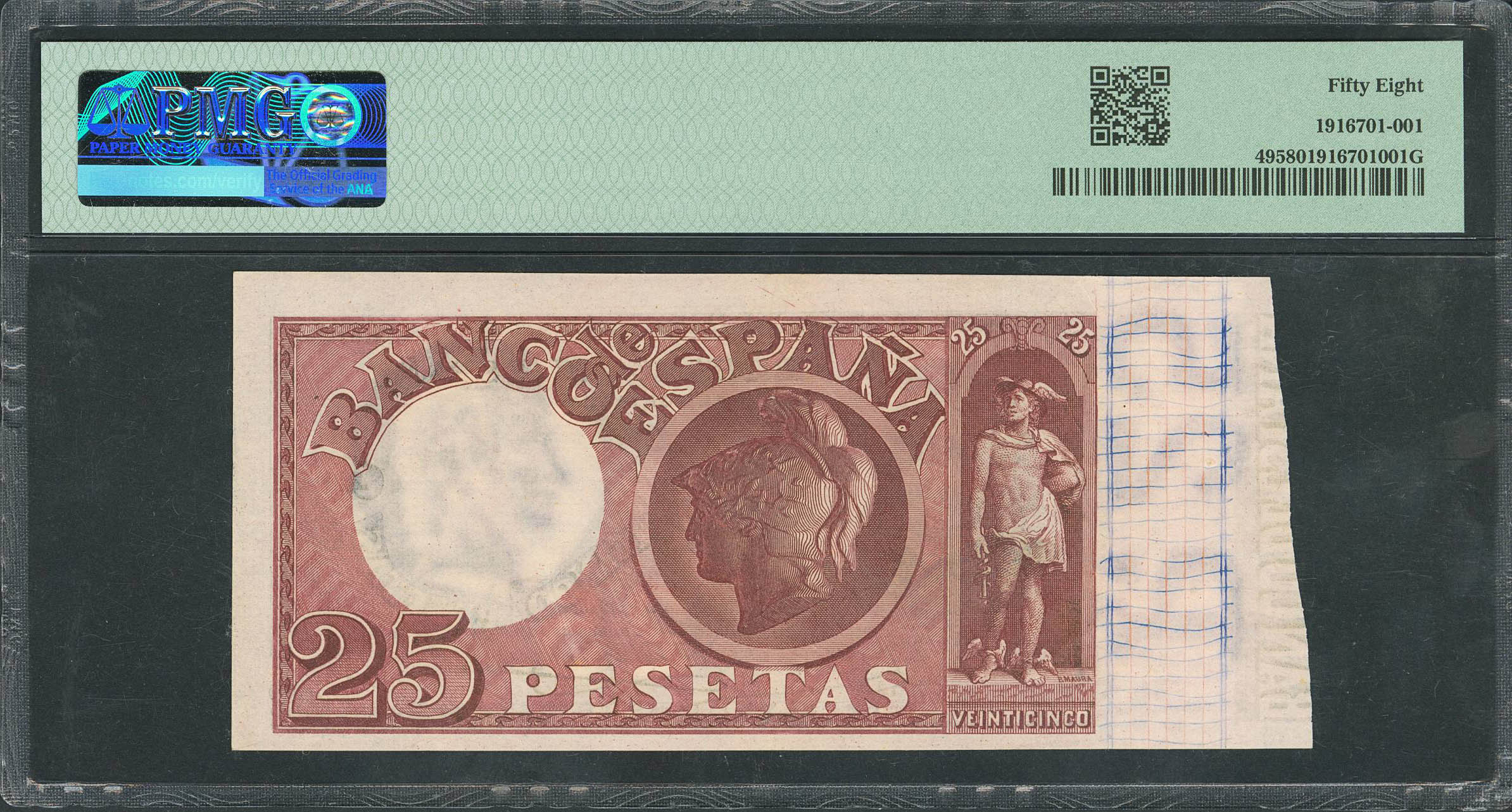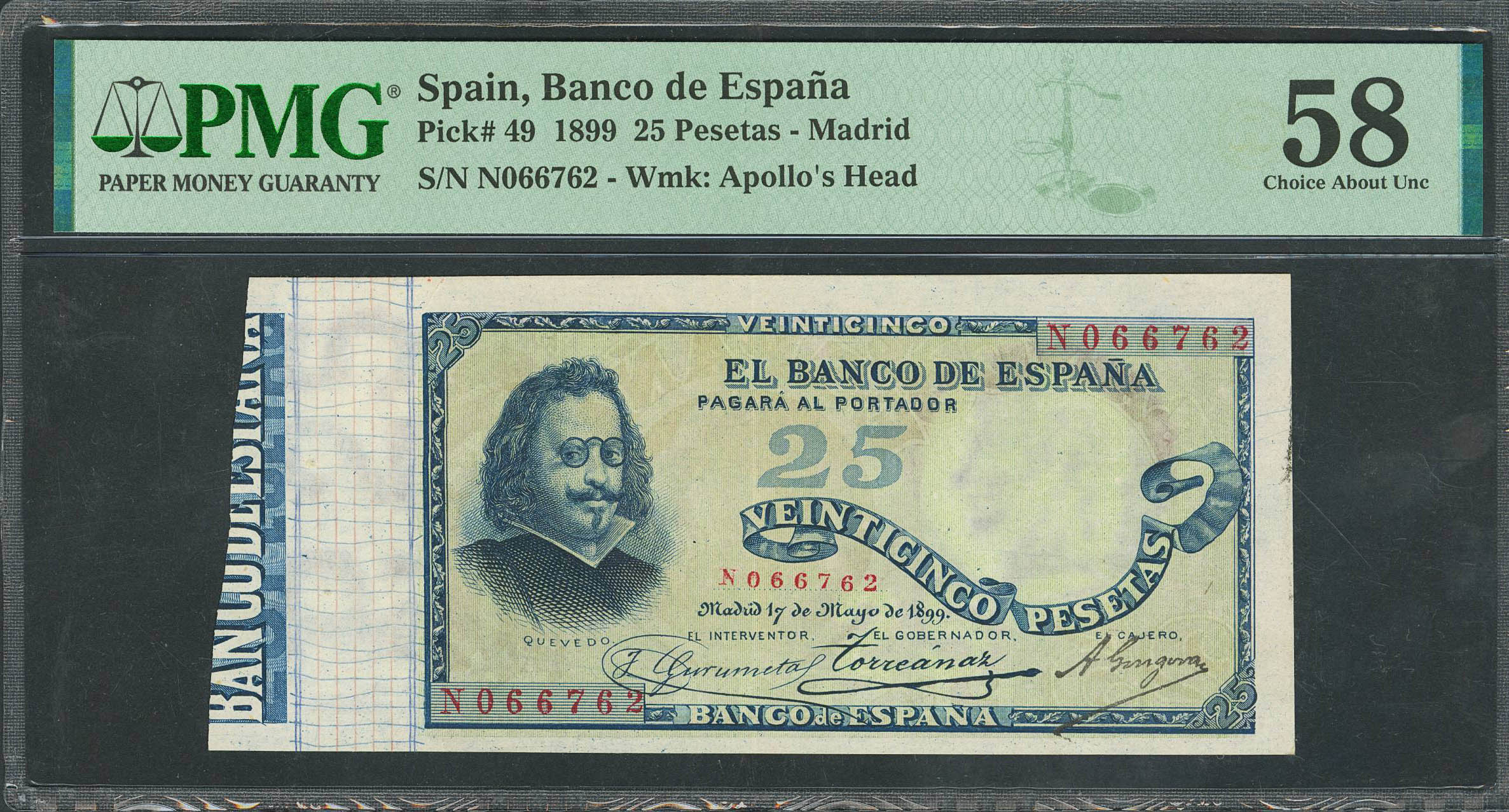 25 Pesetas. 17 de Mayo de 1899. Serie N. (Edifil 2023: 306a, Pick:49). Rarísimo en esta conservación, especialmente sin ningún tipo de reparaciones y conservando gran parte de su apresto original. EBC++. Encapsulado PMG58.