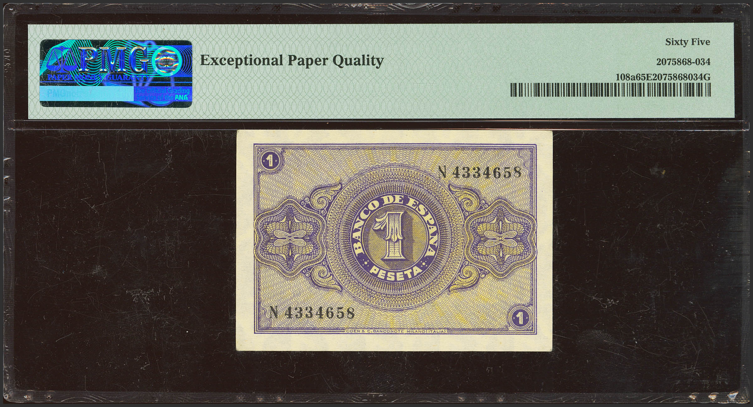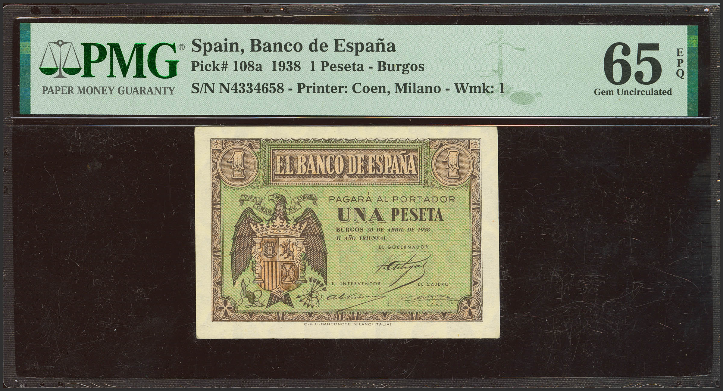 1 Peseta. 30 de Abril de 1938. Serie N, última serie emitida. (Edifil 2023: 428b, Pick: 108a). Apresto original. SC. Encapsulado PMG65EPQ.