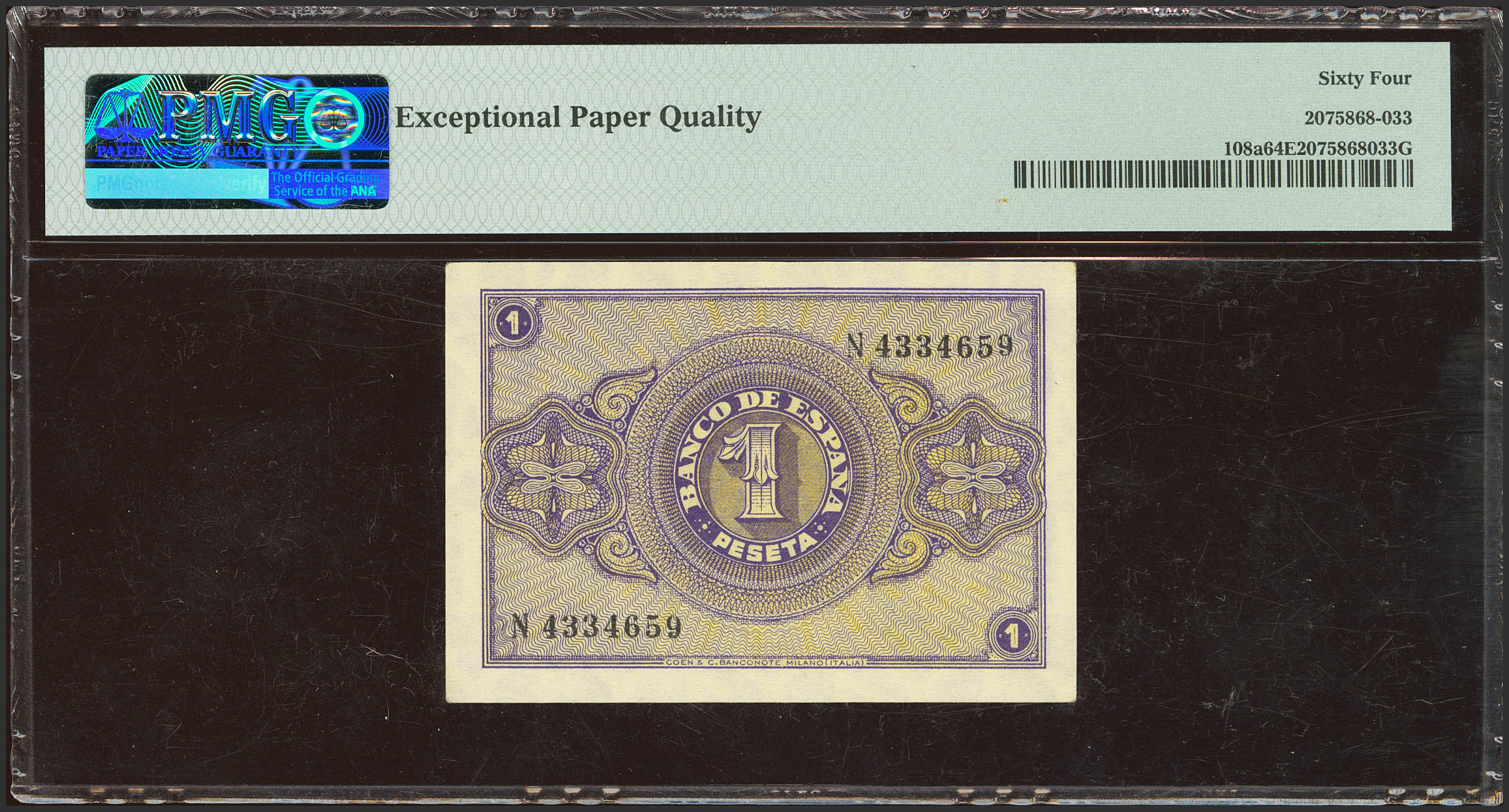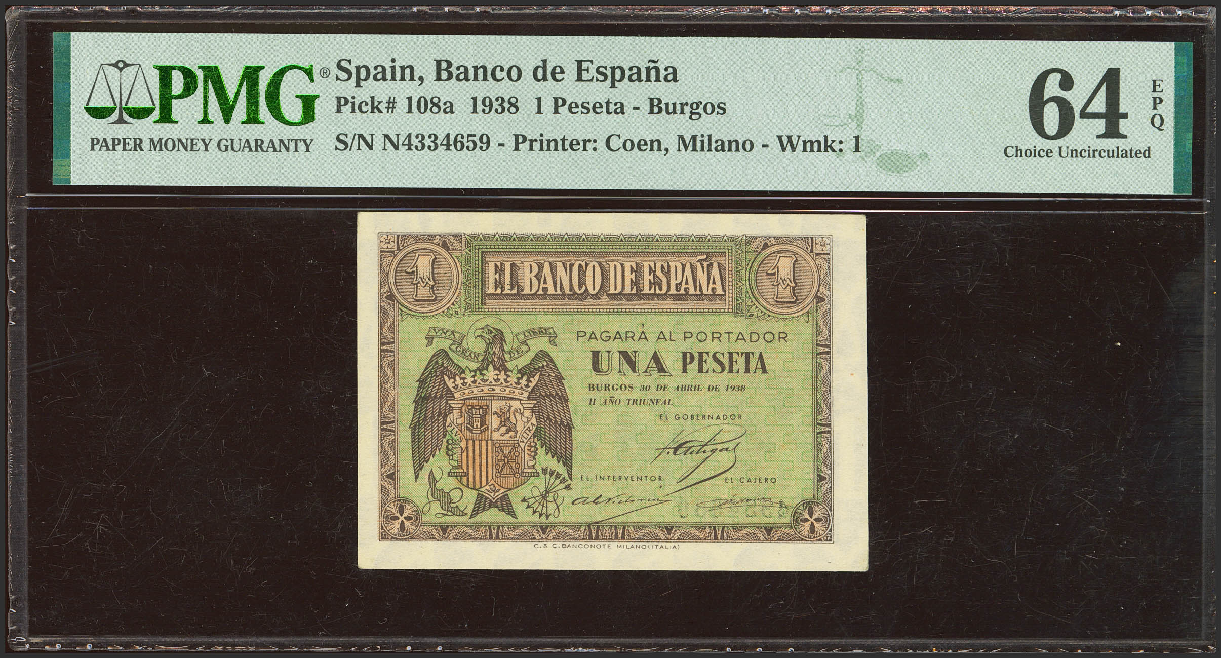 1 Peseta. 30 de Abril de 1938. Serie N, última serie emitida. (Edifil 2023: 428b, Pick: 108a). Apresto original. SC. Encapsulado PMG64EPQ.