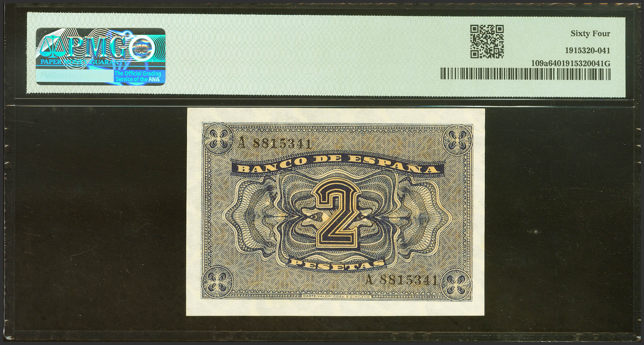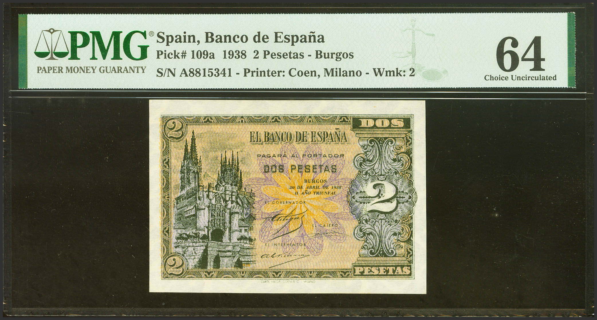 2 Pesetas. 30 de Abril de 1938. Serie A. (Edifil 2023: 429, Pick: 109a). SC. Encapsulado PMG64.