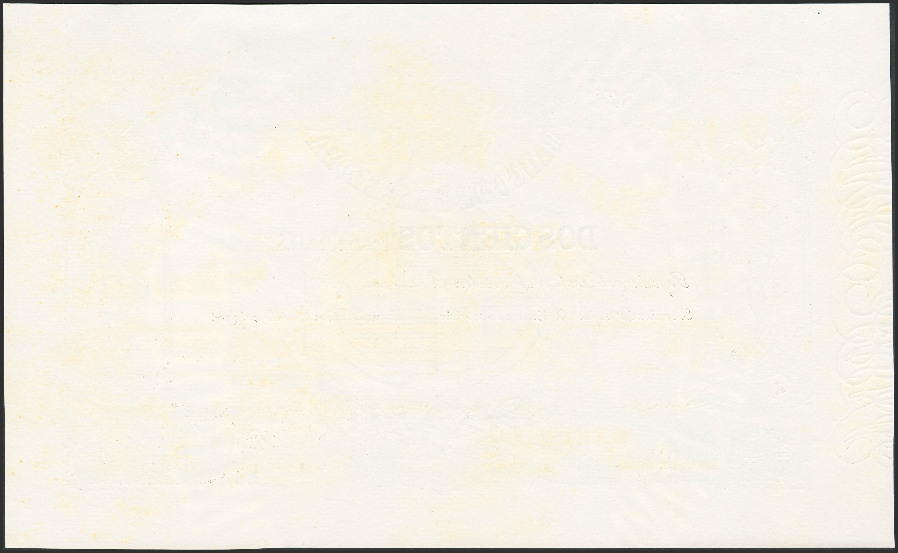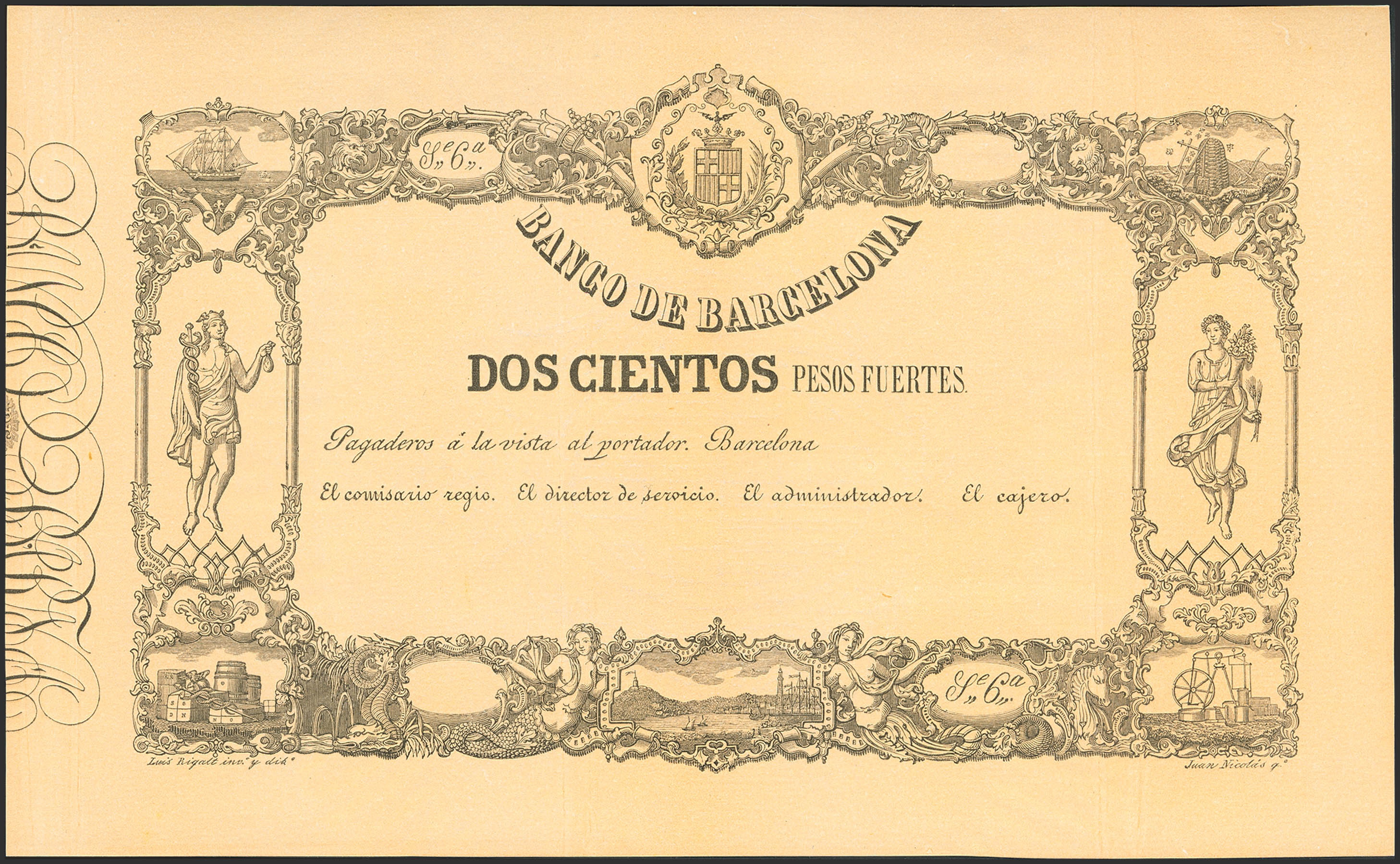 200 Pesos Fuertes. 1855. Banco de Barcelona. Sin firmas y sin numeración. (Edifil 2002: A50, Edifil 2023: no hace mención de este valor, nombra la emisión en la página 10)(emitido con posterioridad con las planchas originales, procede de un libro editado con posterioridad por el propio banco catalán en el siglo XIX, entendemos que tuvo acceso a las planchas originales, no se conocen de otra manera y toda la bibliografía conocida respecto a estos billetes emana del libro del banco). Apresto original. EBC+++.