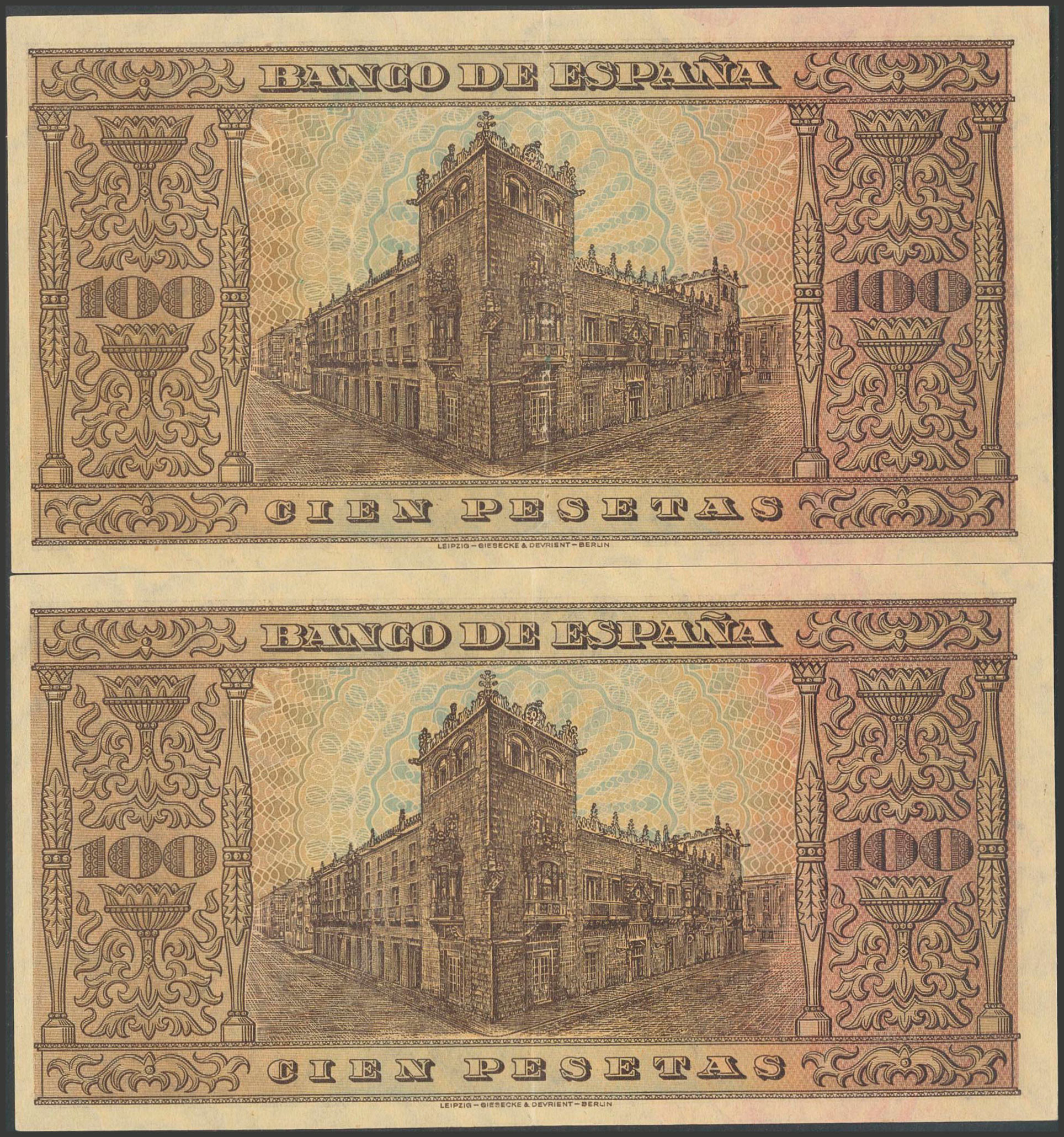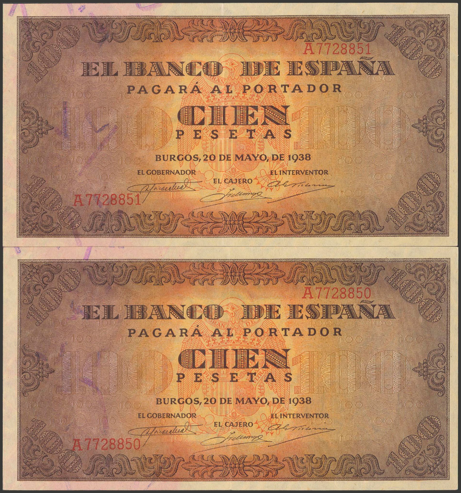 100 Pesetas. 20 de Mayo de 1938. Pareja correlativa. Serie A. (Edifil 2017: 432). Conserva parte del apresto original. EBC.