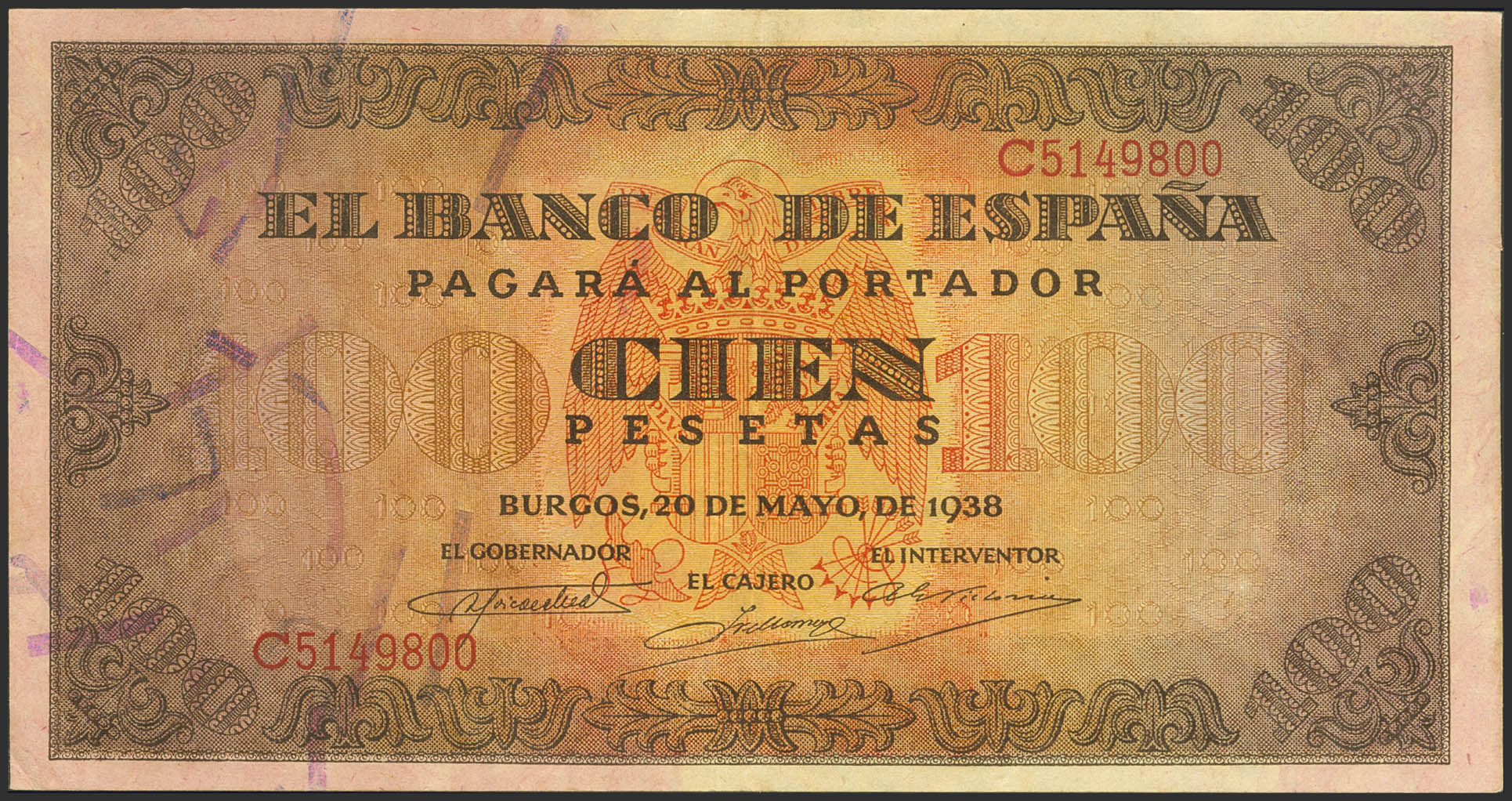 100 Pesetas. 20 de Mayo de 1938. Serie C. (Edifil 2021: 432a). Conserva gran parte de su apresto original. EBC-.