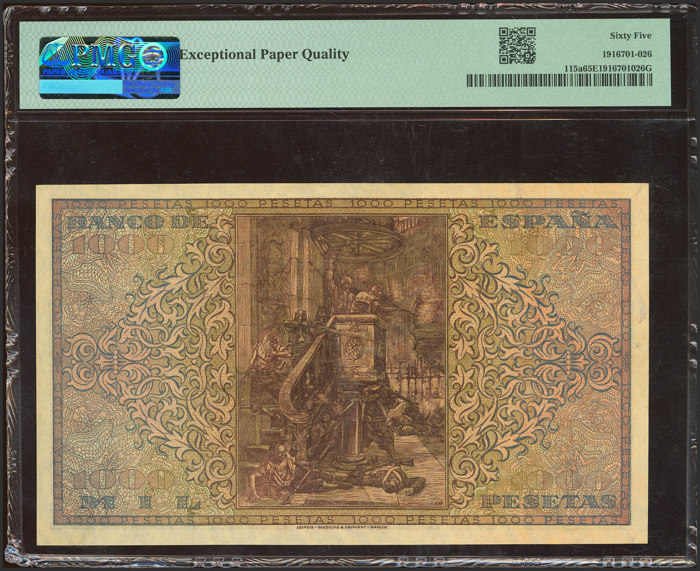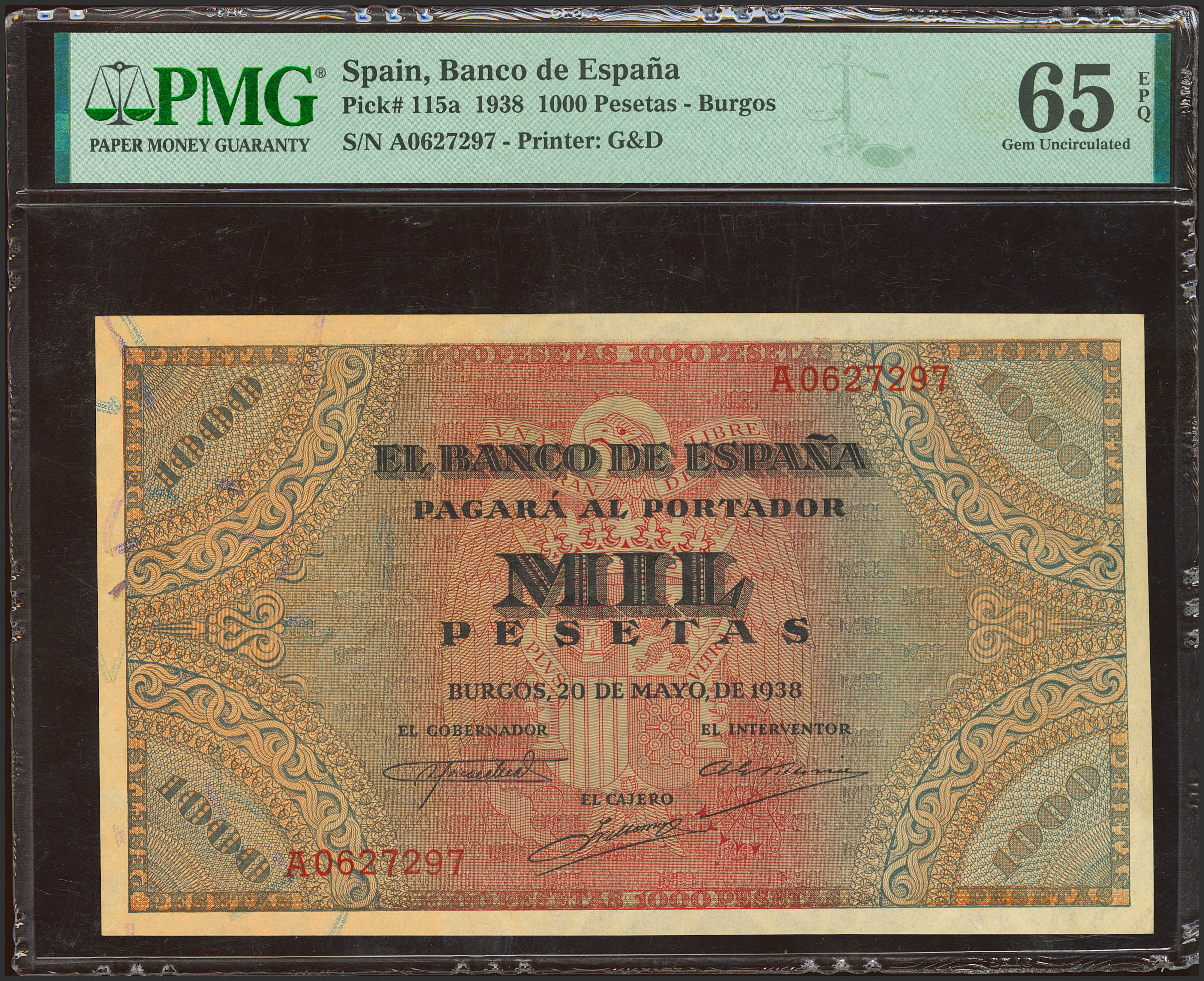 1000 Pesetas. 20 de Mayo de 1938. Serie A. (Edifil 2021: 434, Pick: 115a). Rarísimo en esta excepcional calidad, apresto original. SC. Encapsulado PMG65EPQ.