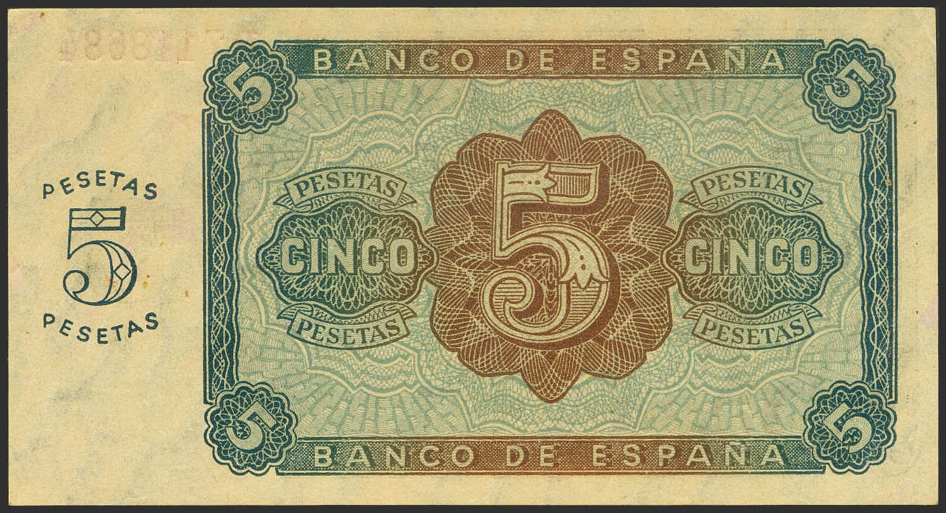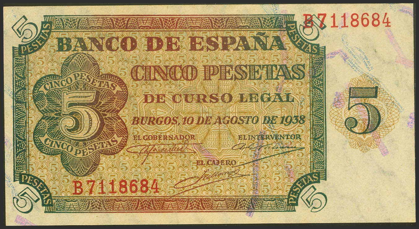 5 Pesetas. 10 de Agosto de 1938. Serie B. (Edifil 2023: 435a). Conserva todo su apresto original. SC.
