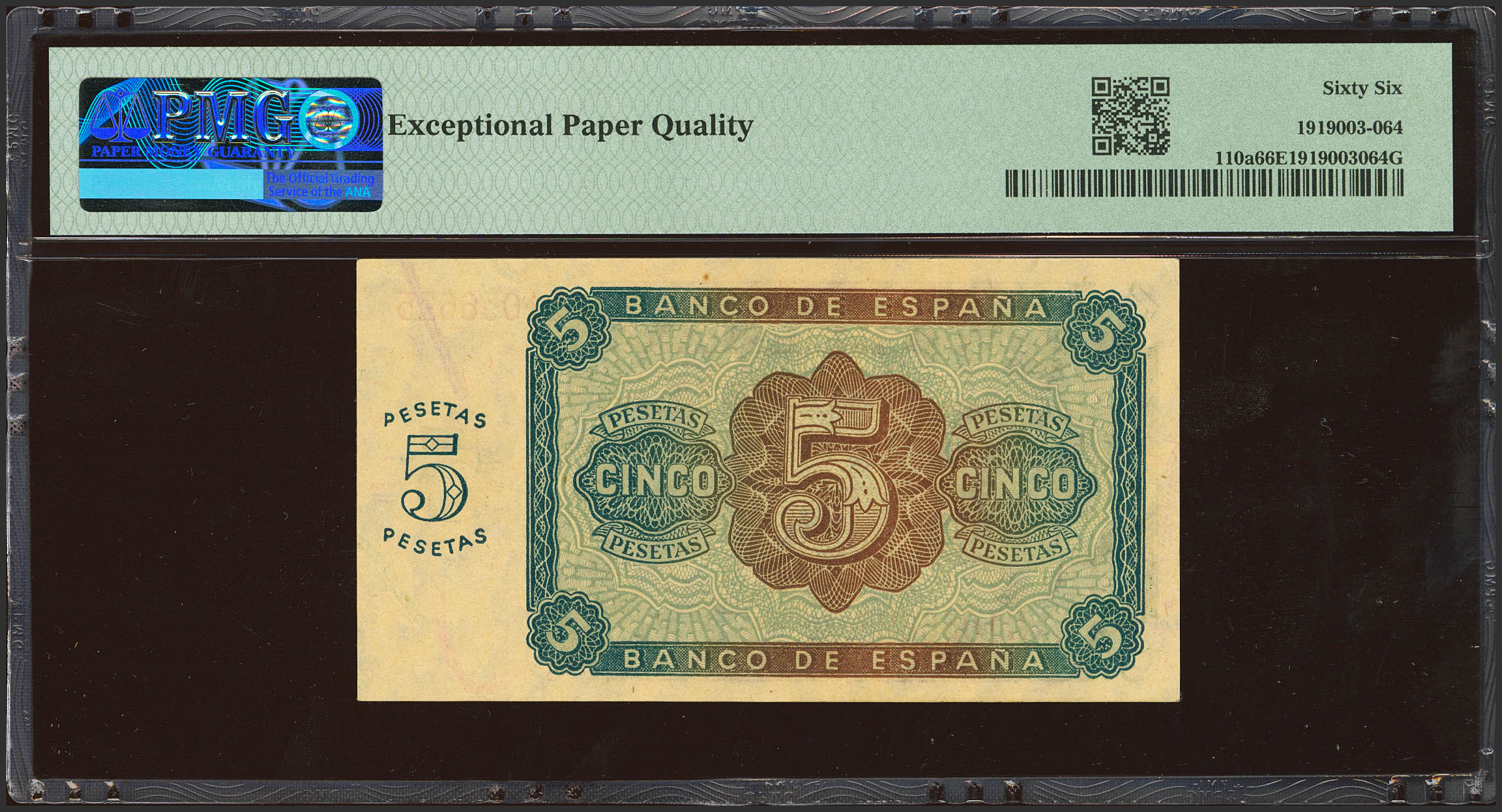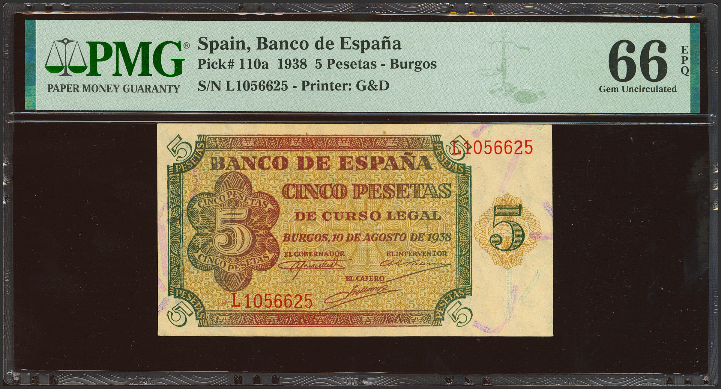 5 Pesetas. 10 de Agosto de 1938. Serie L. (Edifil 2023: 435a, Pick: 110a). Inusual en esta excepcional calidad, apresto original. SC. Encapsulado PMG66EPQ.