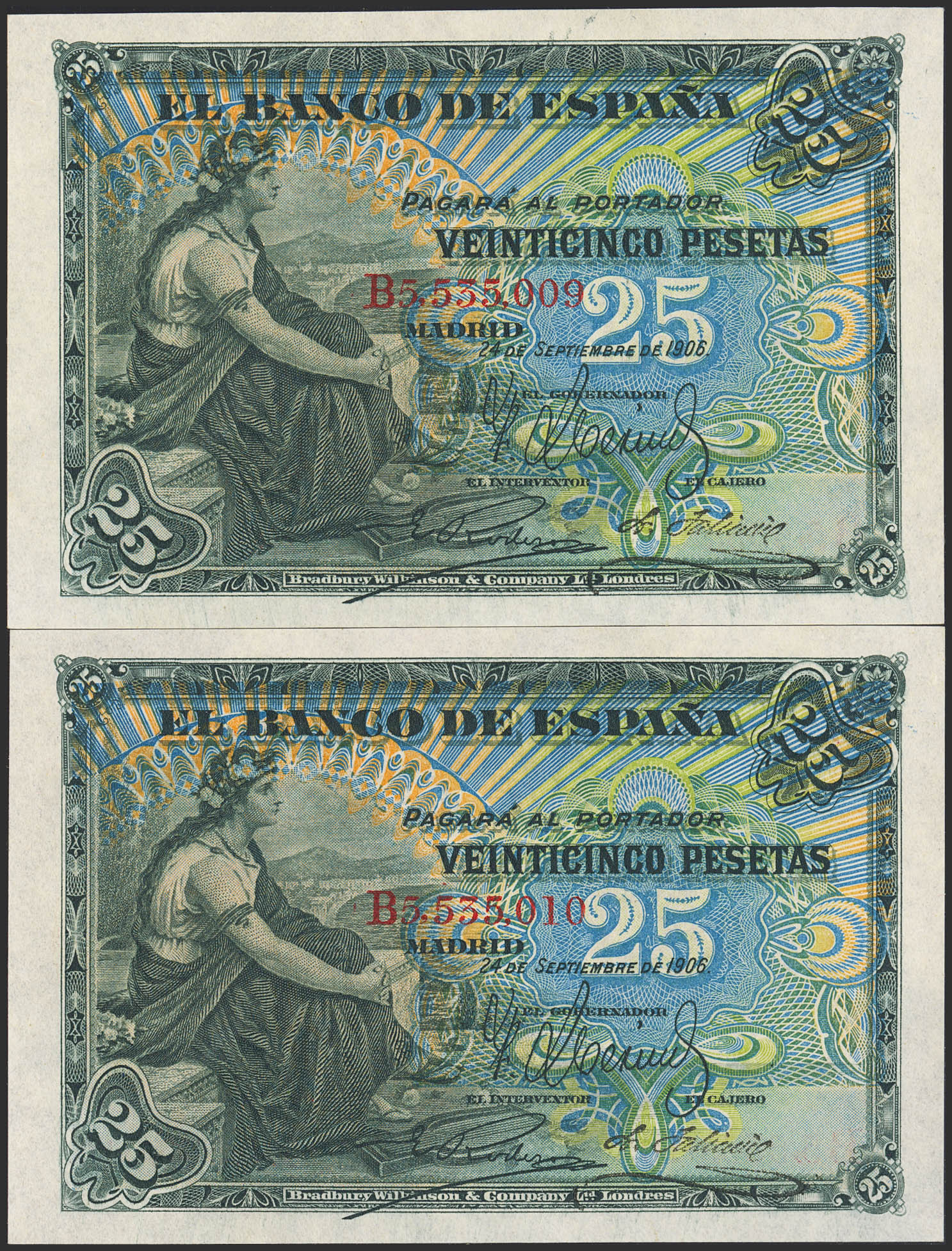 25 Pesetas. 24 de Septiembre de 1906. Pareja correlativa. Serie B. (Edifil 2023: 314a, Pick: 57a). Inusual en esta calidad, rarísima pareja. EBC+.