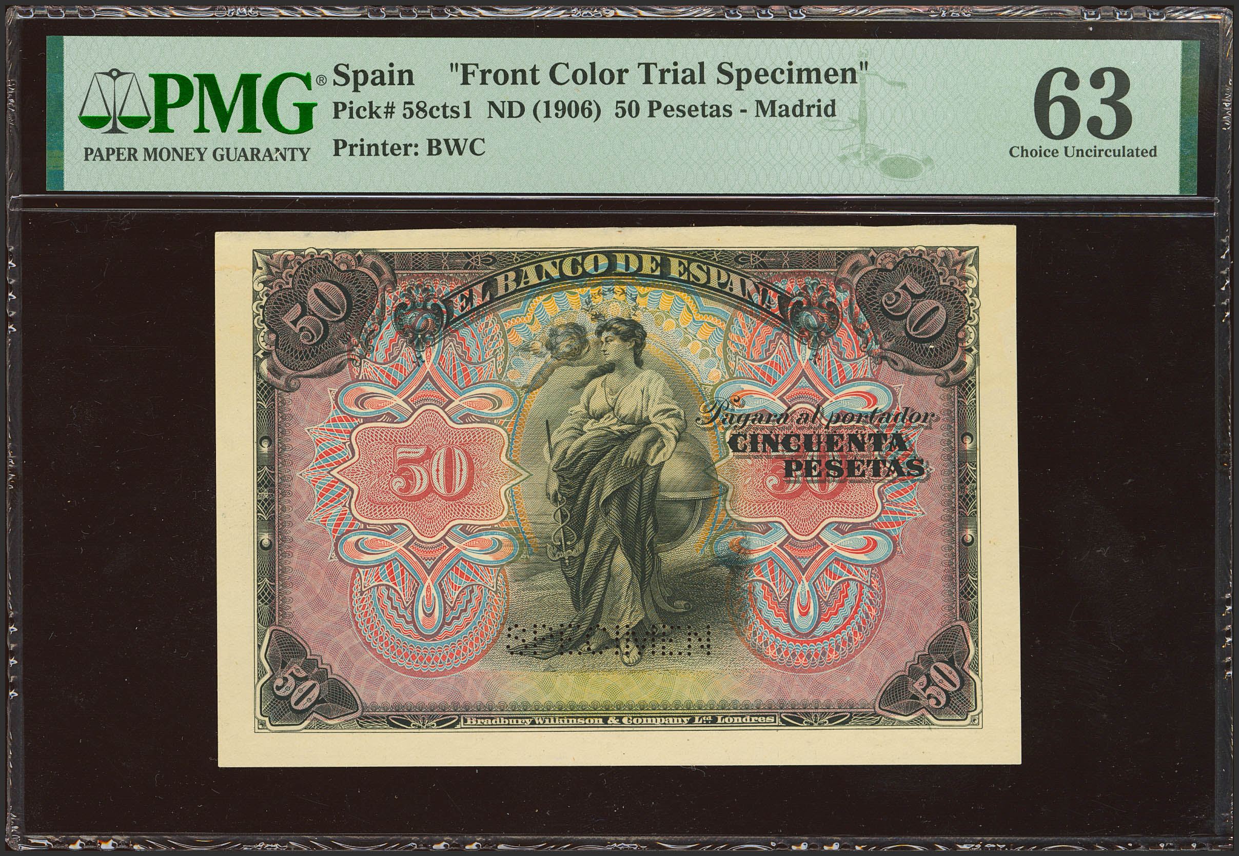 50 Pesetas. 24 de Septiembre de 1906. SPECIMEN taladrado, sin numeración y sin firmas. (Edifil 2023: 315M, Pick: 63cts1). SC. Encapsulado PMG63 (previously mounted).