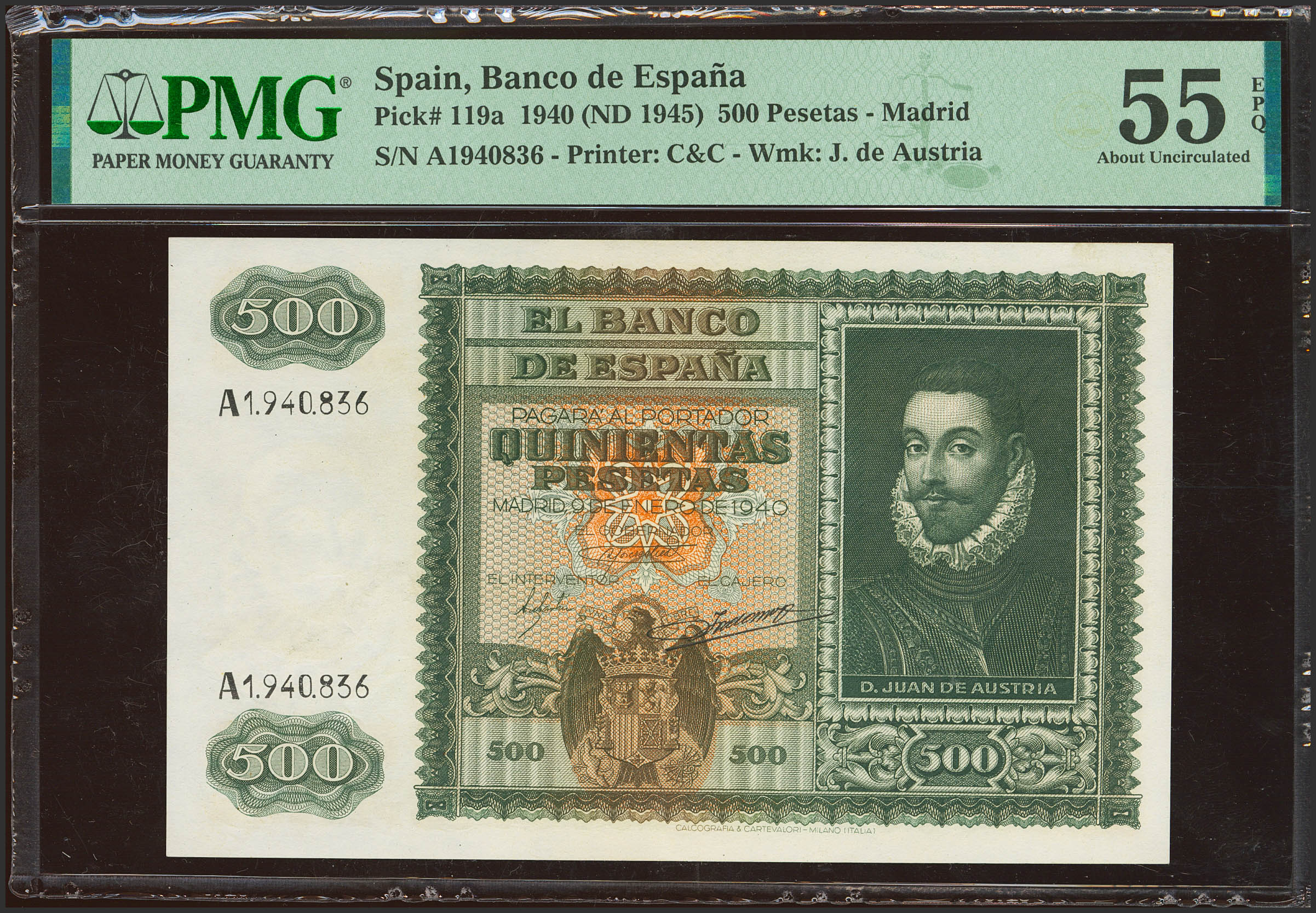 500 Pesetas. 9 de Enero de 1940. Serie A. (Edifil 2023: 439). Muy raro en esta calidad, apresto calidad. EBC+. Encapsulado PMG55EPQ.