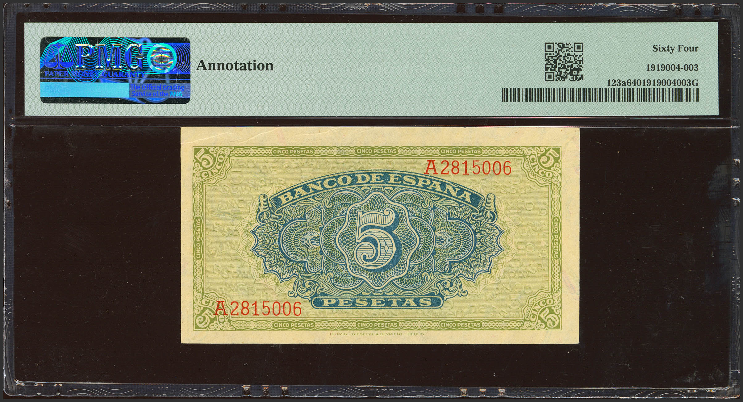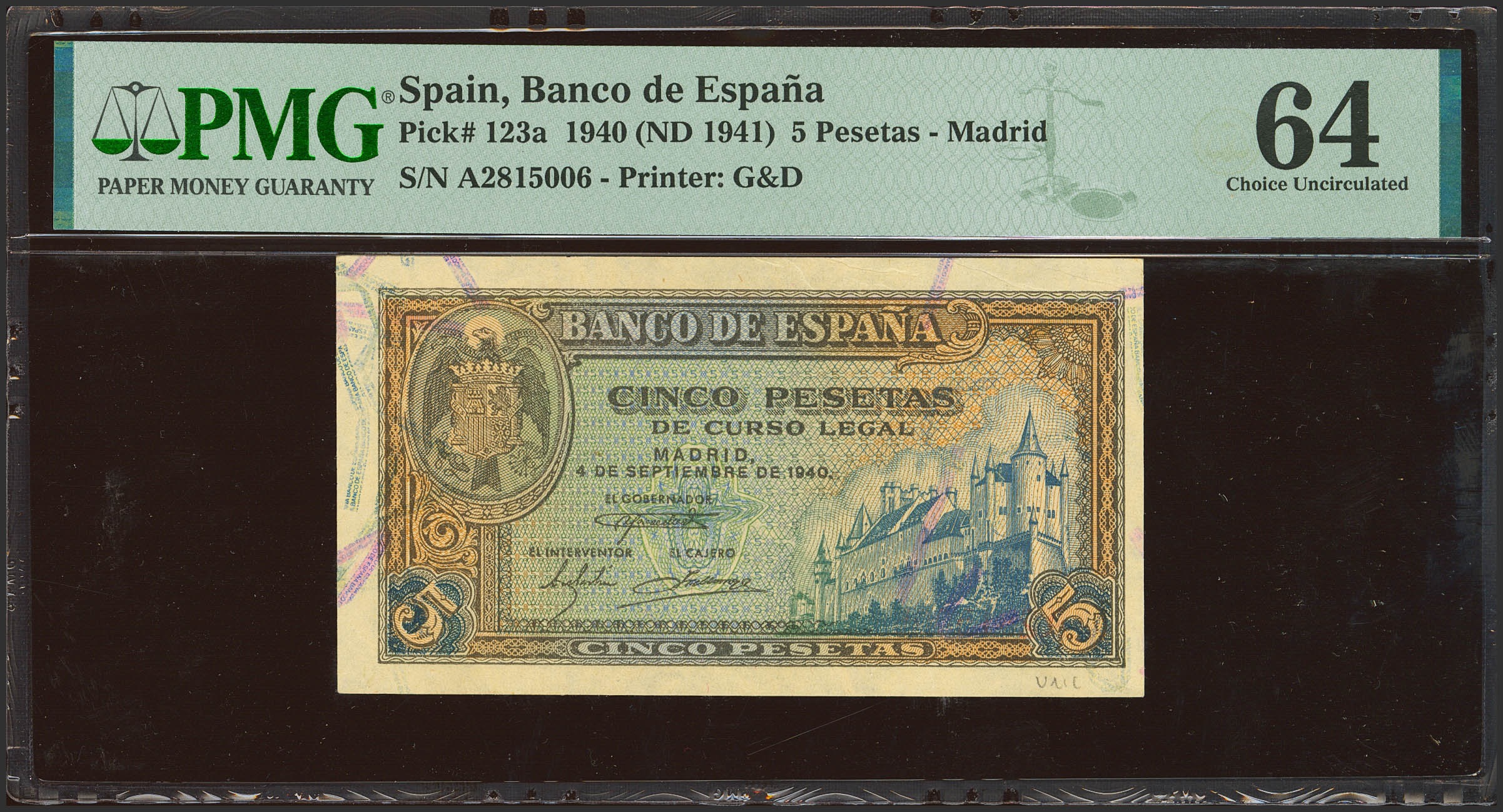 5 Pesetas. 4 de Septiembre de 1940. Serie A. (Edifil 2021: 443, Pick: 123a). Inusual. SC. Encapsulado PMG64 (annotation).