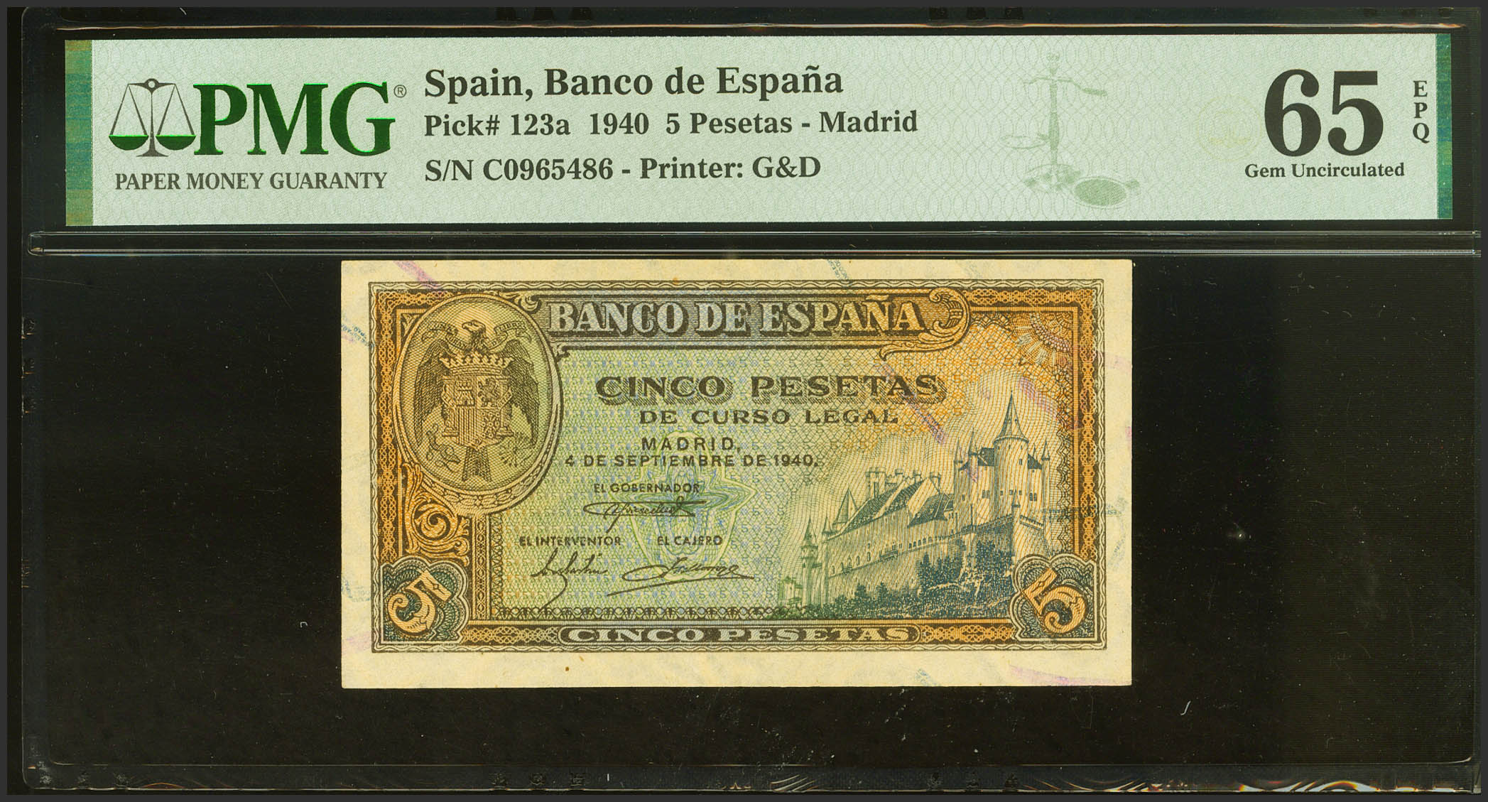 5 Pesetas. 4 de Septiembre de 1940. Serie C. (Edifil 2021: 443a, Pick: 123a). Inusual en esta calidad, conserva todo su apresto original. SC. Encapsulado PMG65EPQ.