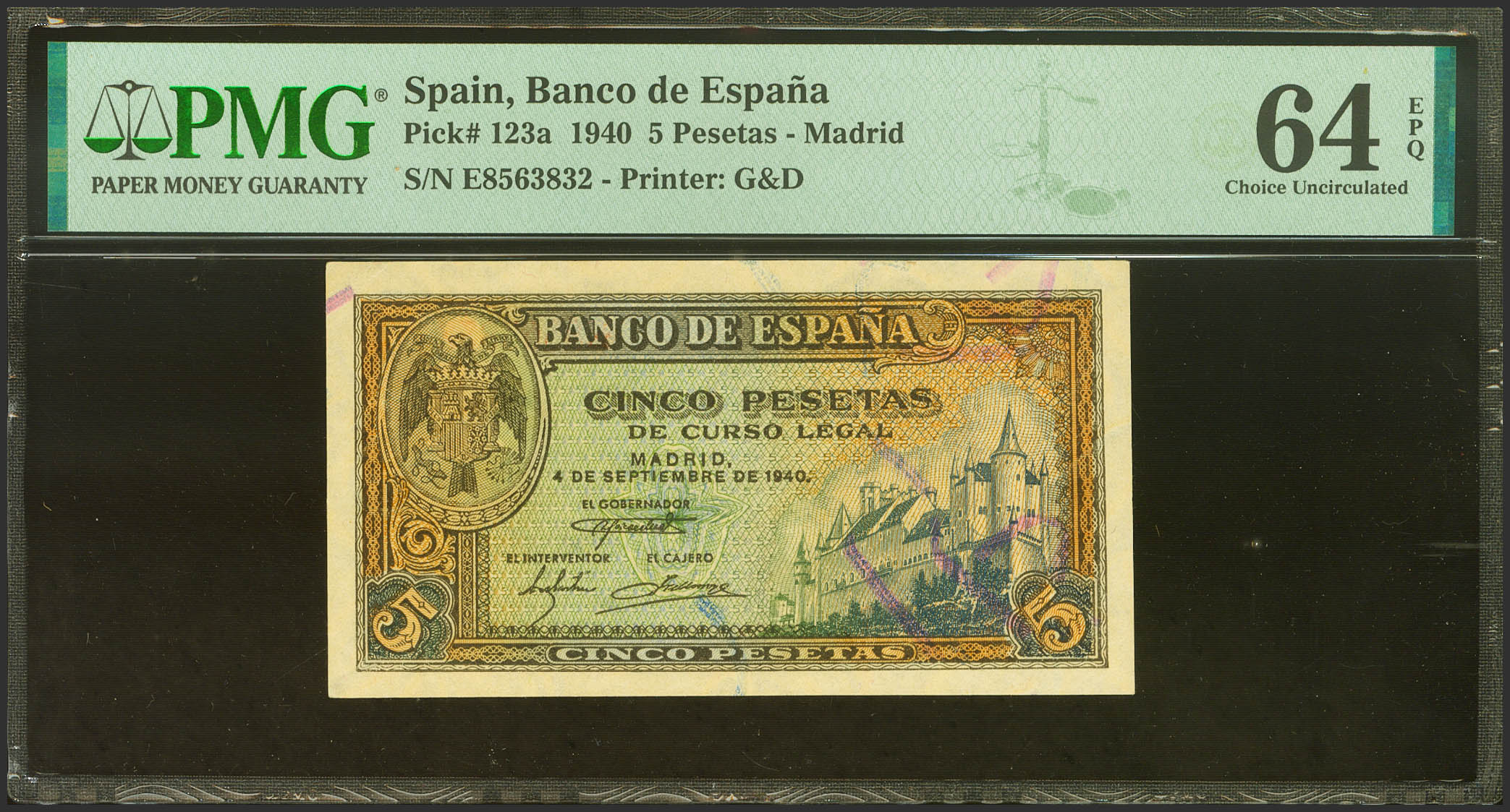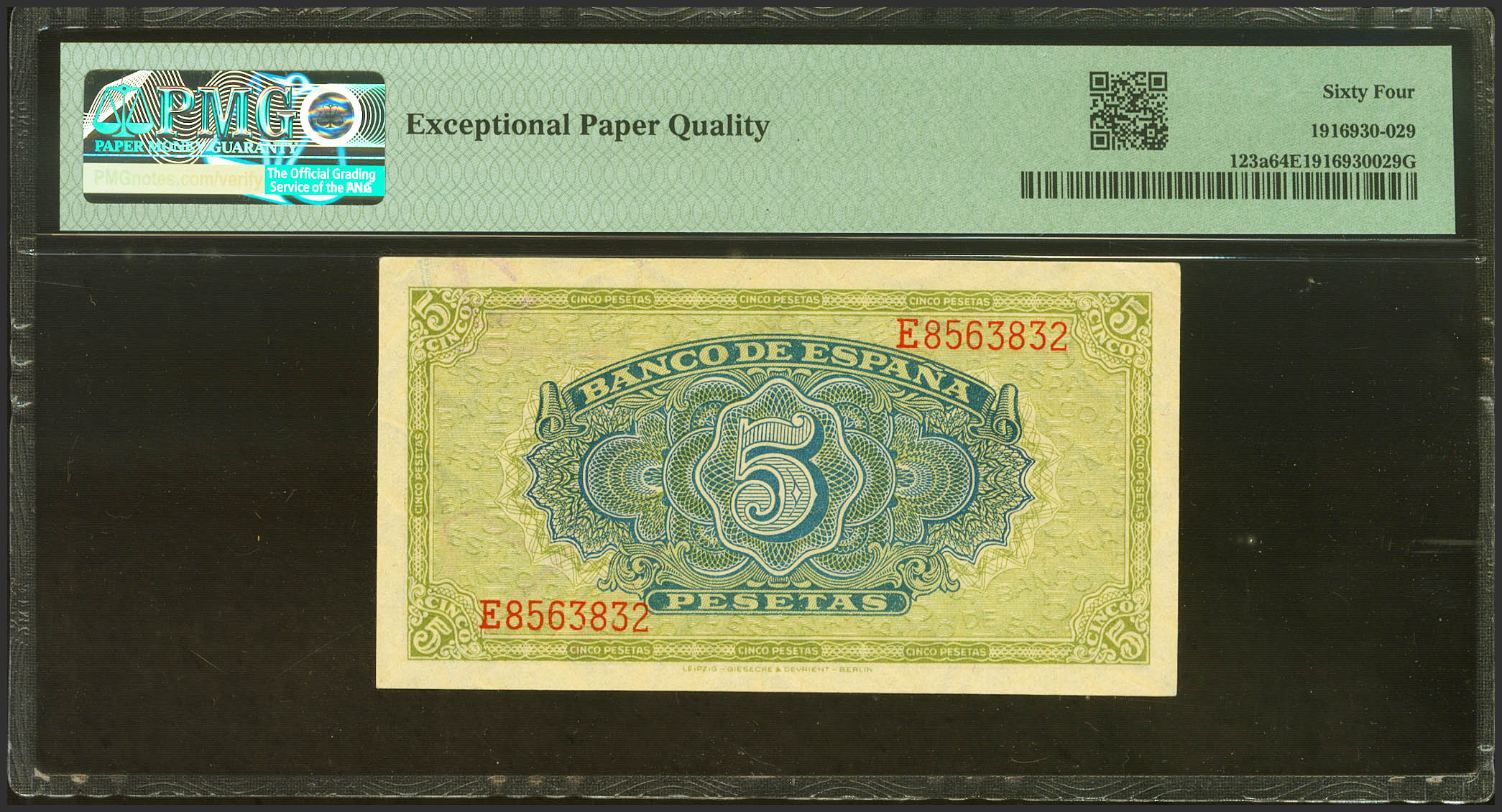 5 Pesetas. 4 de Septiembre de 1940. Serie E. (Edifil 2023: 443a, Pick: 123a). Apresto original. SC. Encapsulado PMG64EPQ.