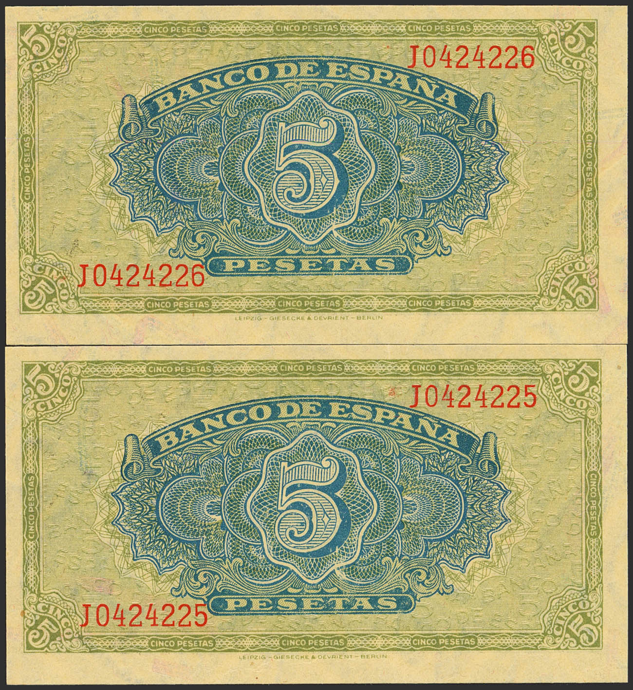 5 Pesetas. 4 de Septiembre de 1940. Pareja correlativa. Serie J. (Edifil 2023: 443a). Conserva gran parte de su apresto original. EBC+++.