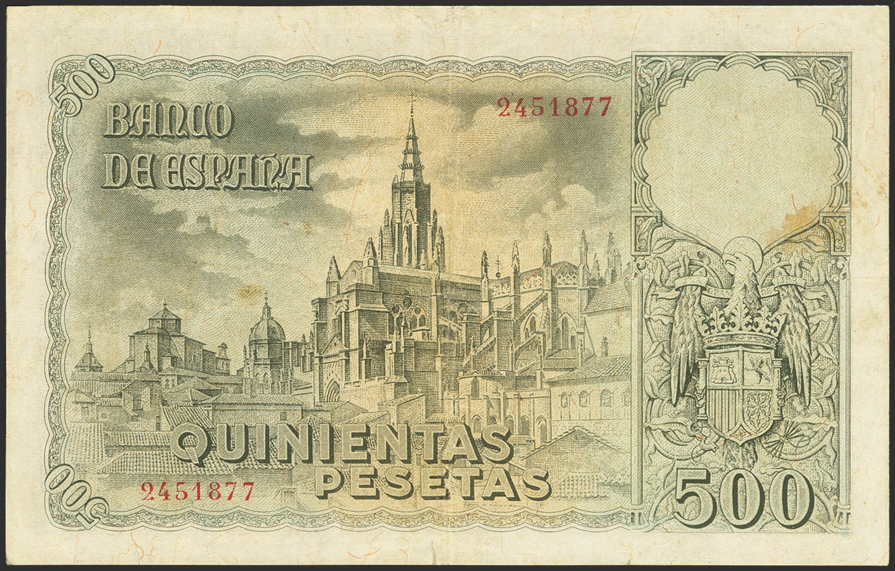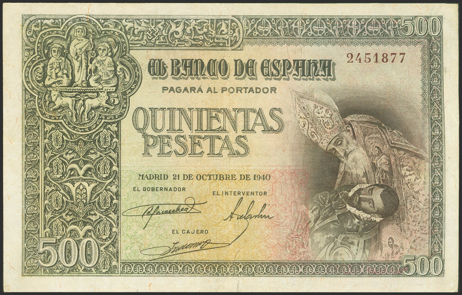 500 Pesetas. 21 de Octubre de 1940. Sin serie. (Edifil 2023: 444, Pick: 124a). Pequeña rotura en el margen inferior. MBC.