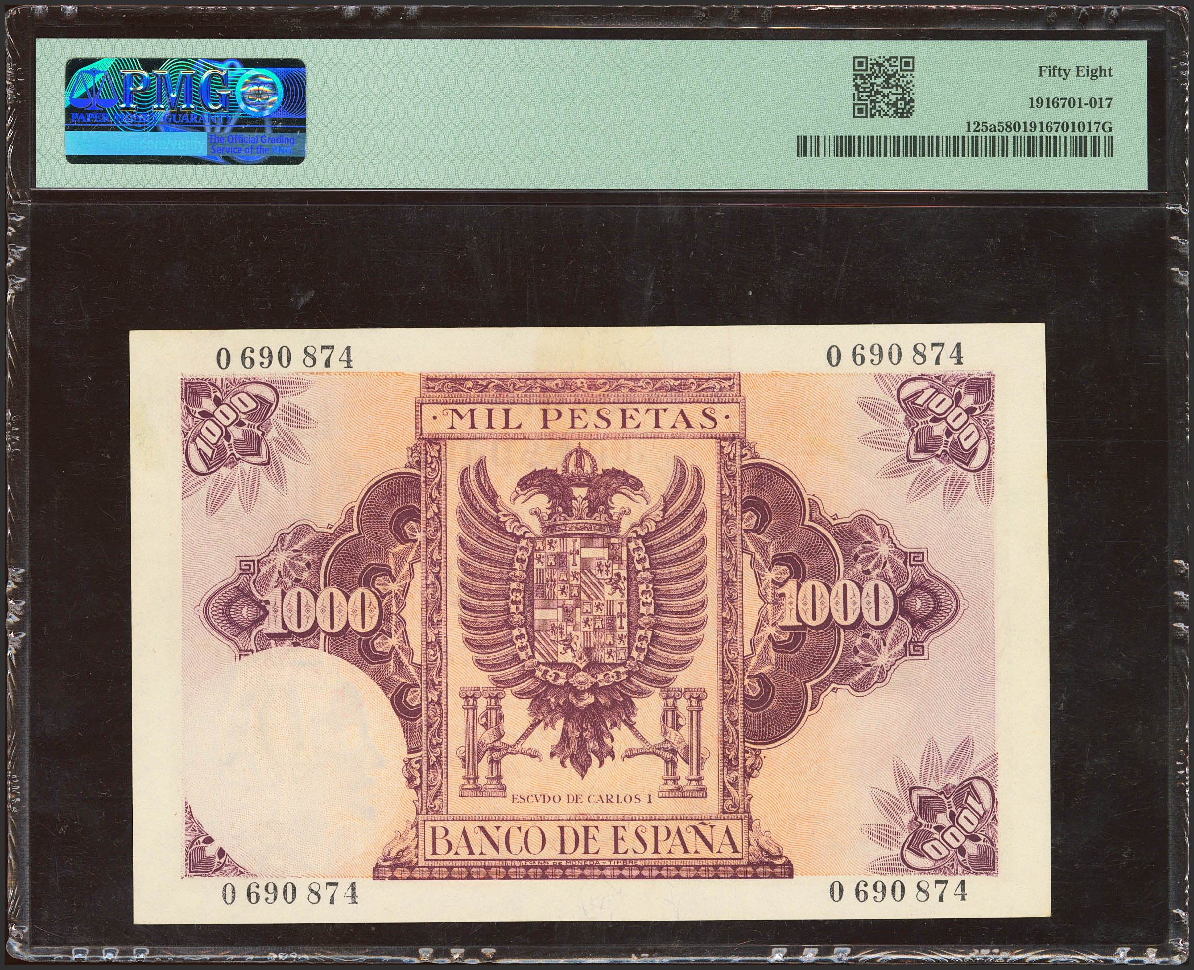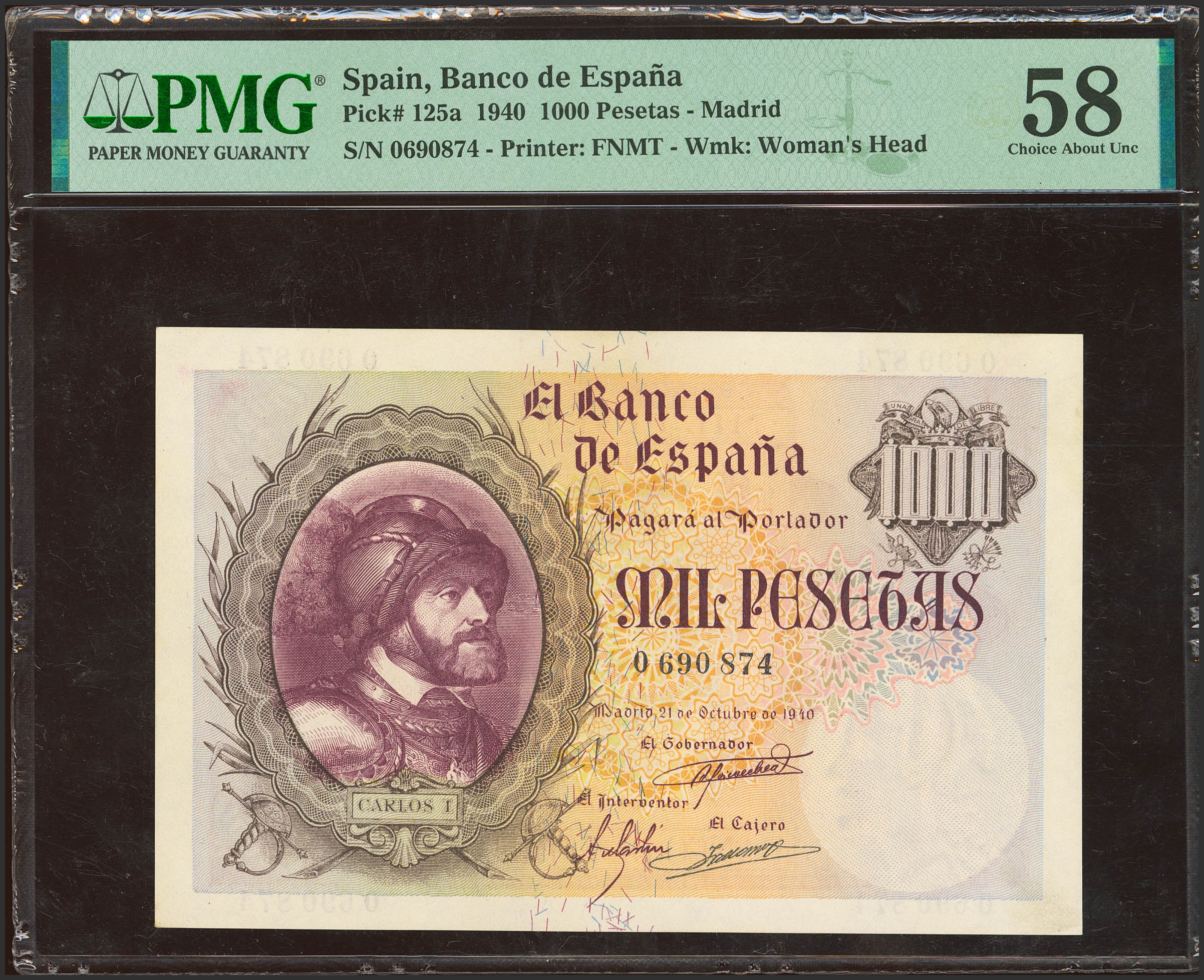1000 Pesetas. 21 de Octubre de 1940. Sin serie. (Edifil 2023: 445, Pick: 125a). Rarísimo en esta calidad. EBC+. Encapsulado PMG58.