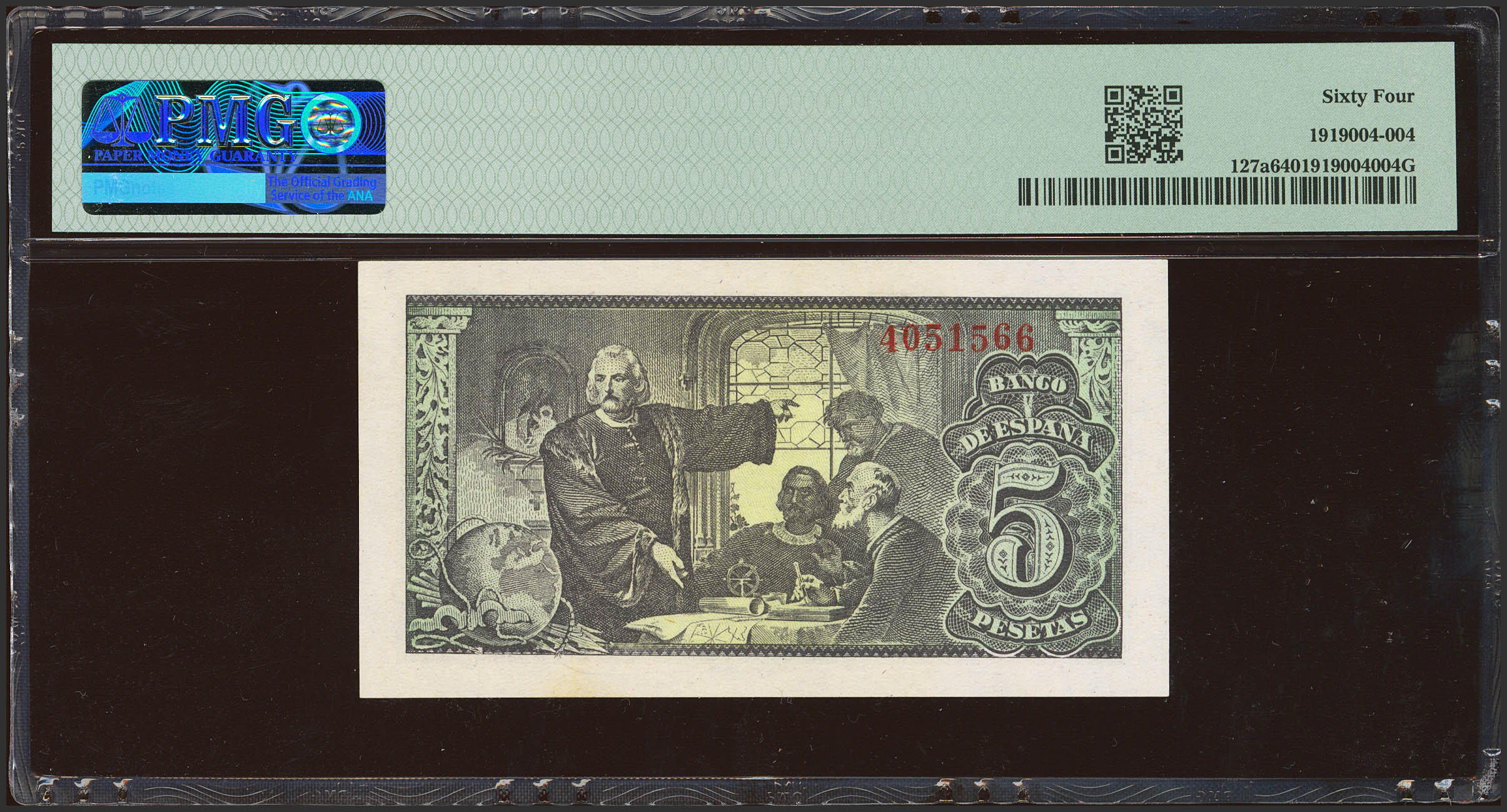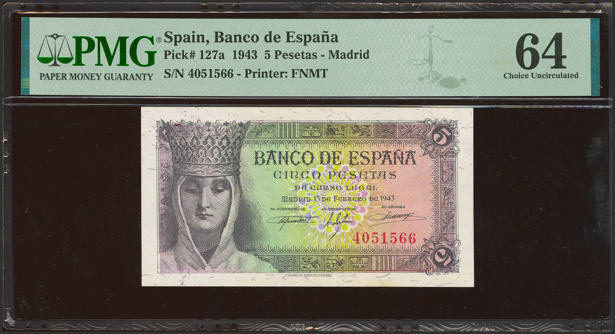 5 Pesetas. 13 de Febrero de 1943. Sin serie. (Edifil 2023: 446, Pick: 127a). Inusual en esta calidad. SC. Encapsulado PMG64.
