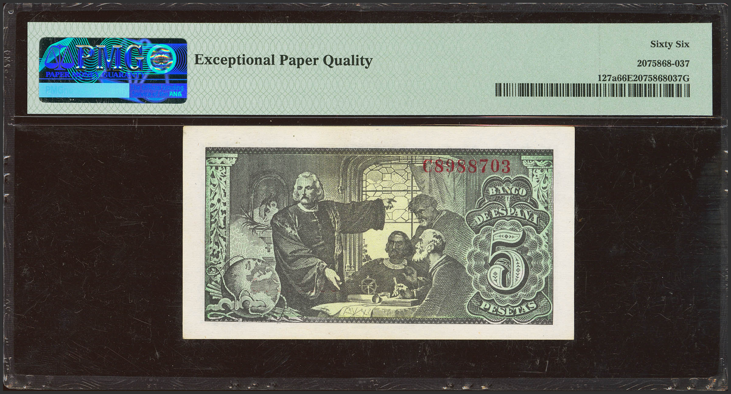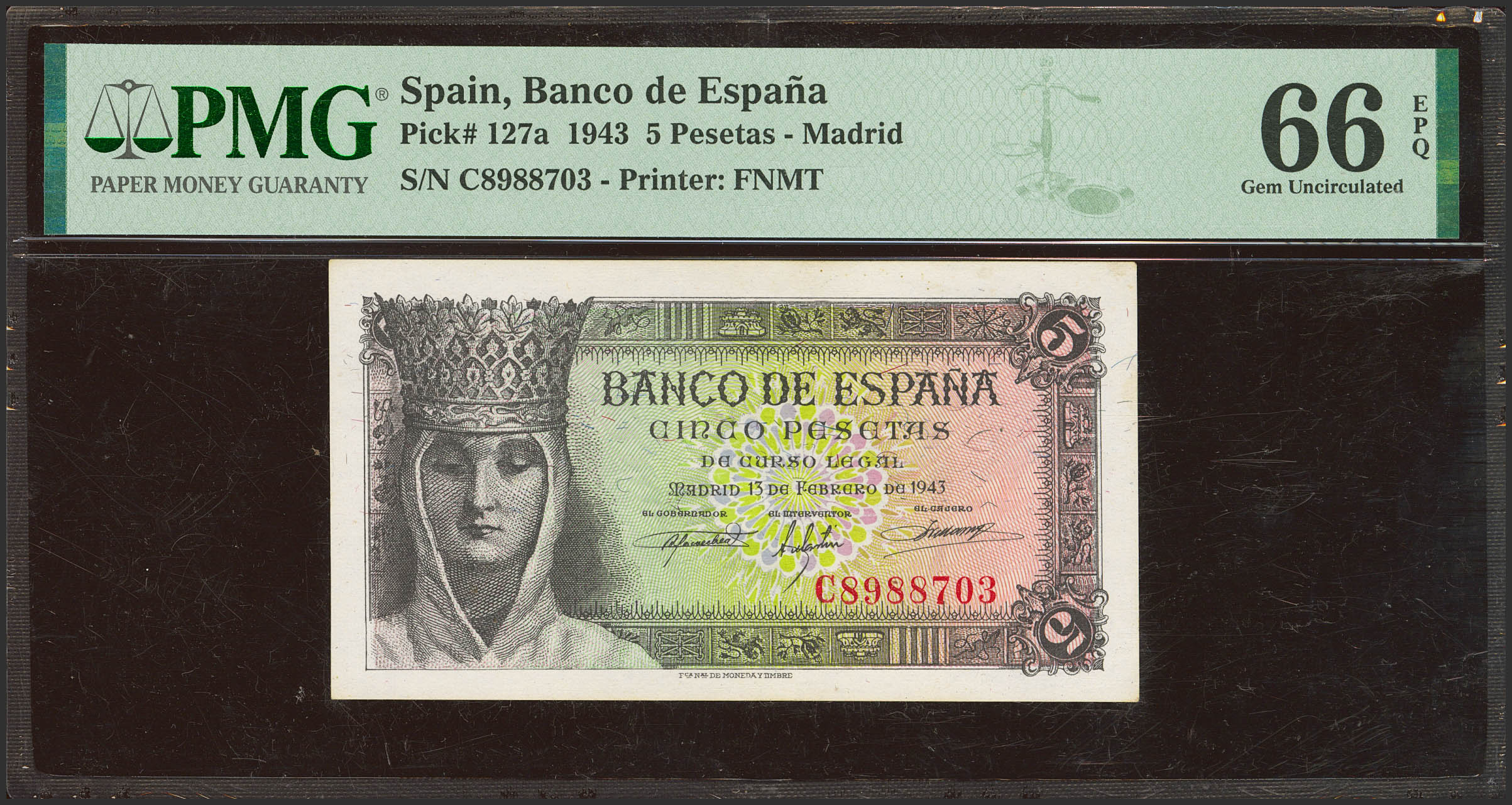 5 Pesetas. 13 de Febrero de 1943. Serie C. (Edifil 2023: 446a, Pick: 127a). Apresto original. SC. Encapsulado PMG66EPQ.