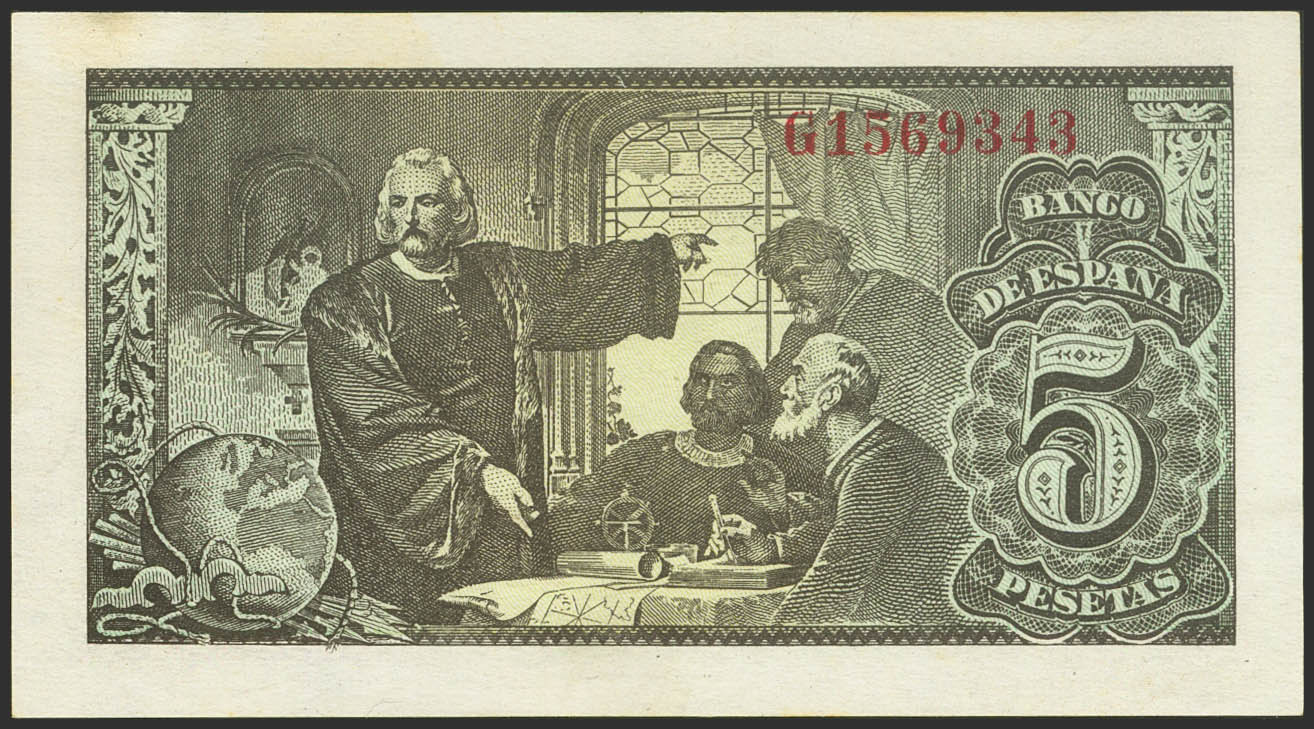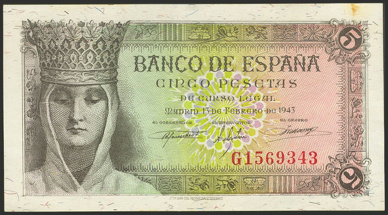 5 Pesetas. 13 de Febrero de 1943. Serie G. (Edifil 2023: 446a). Apresto original, manchita de tiempo en la esquina superior derecha. SC-.