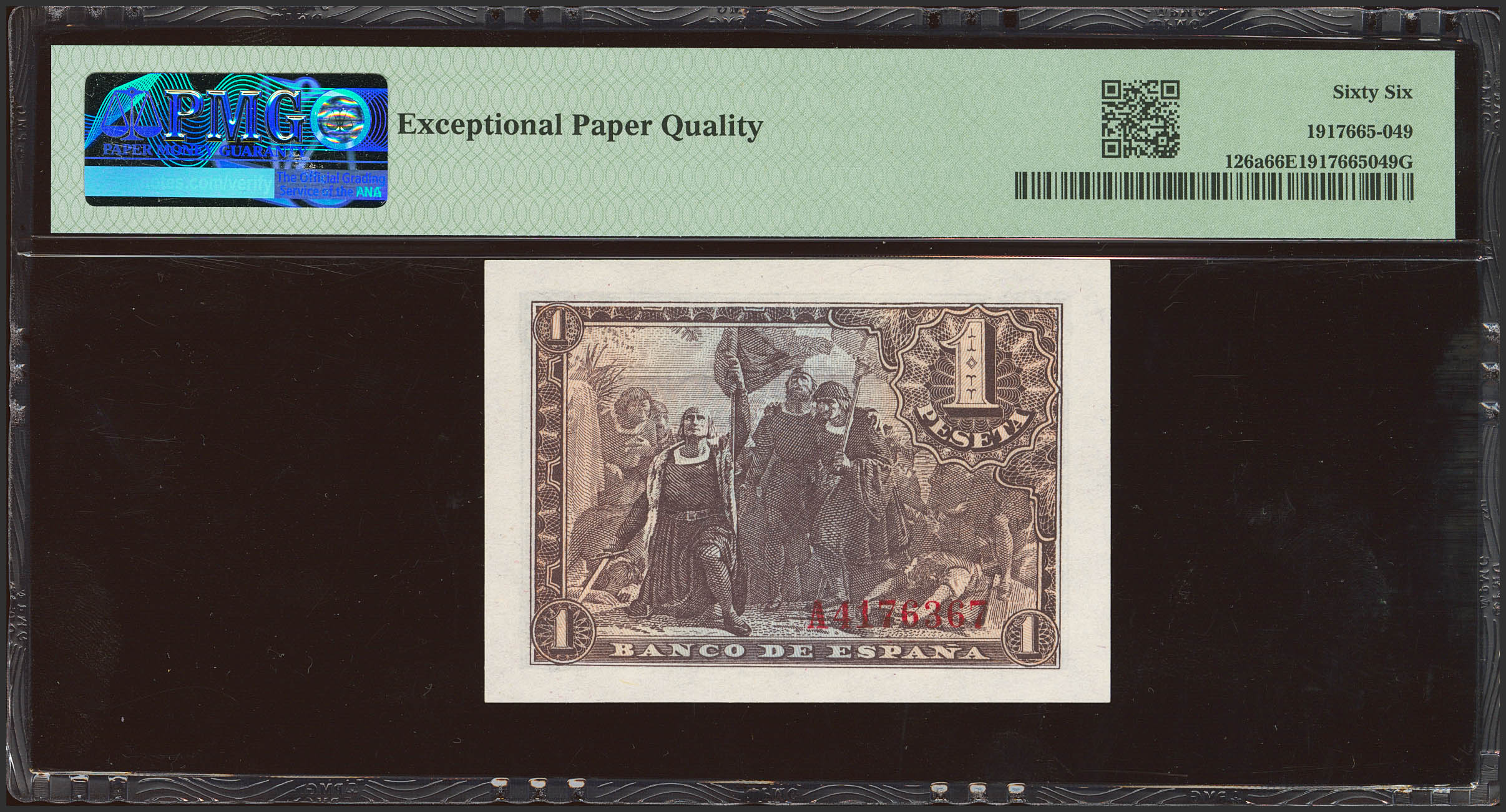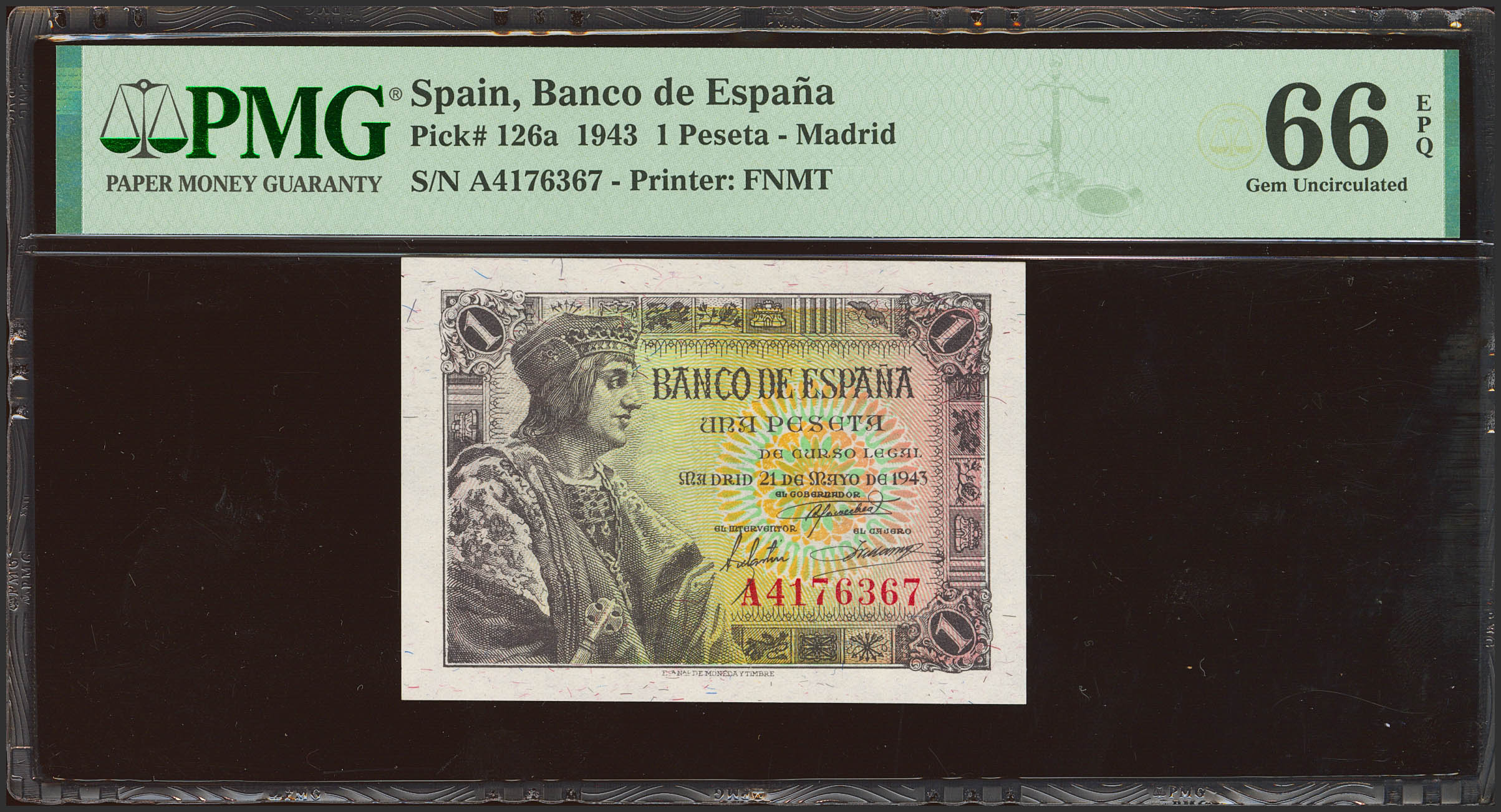 1 Peseta. 21 de Mayo de 1943. Serie A. (Edifil 2023: 447a, Pick: 126a). Apresto original. SC. Encapsulado PMG66EPQ.