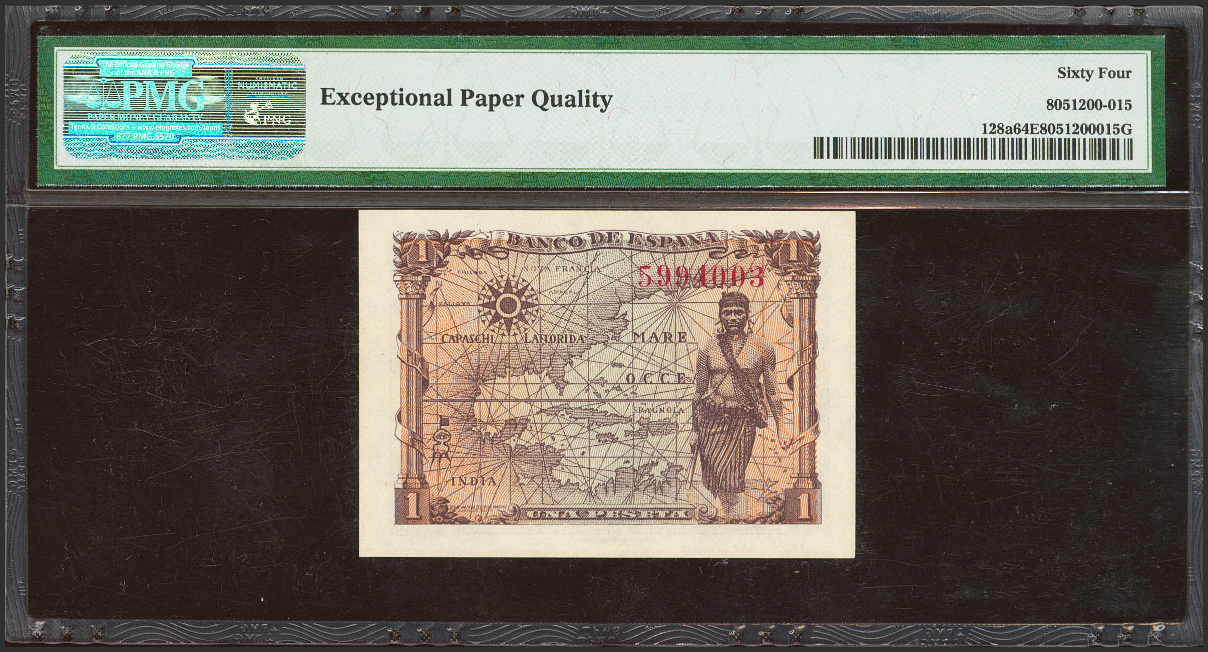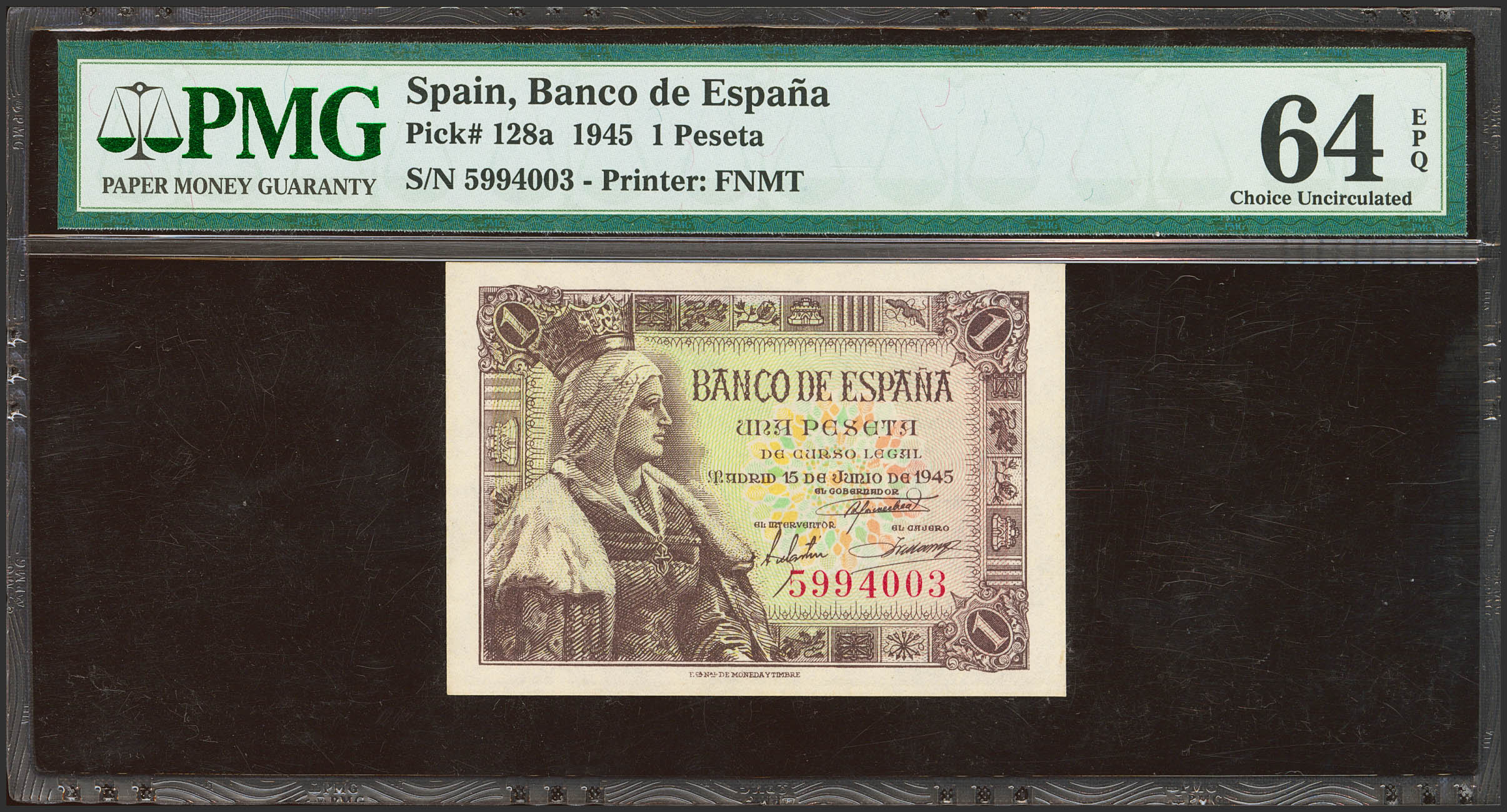 1 Pesetas. 15 de Junio de 1945. Sin serie. (Edifil 2023: 448, Pick: 128a). Inusual en esta calidad, apresto original. SC. Encapsulado PMG64EPQ.