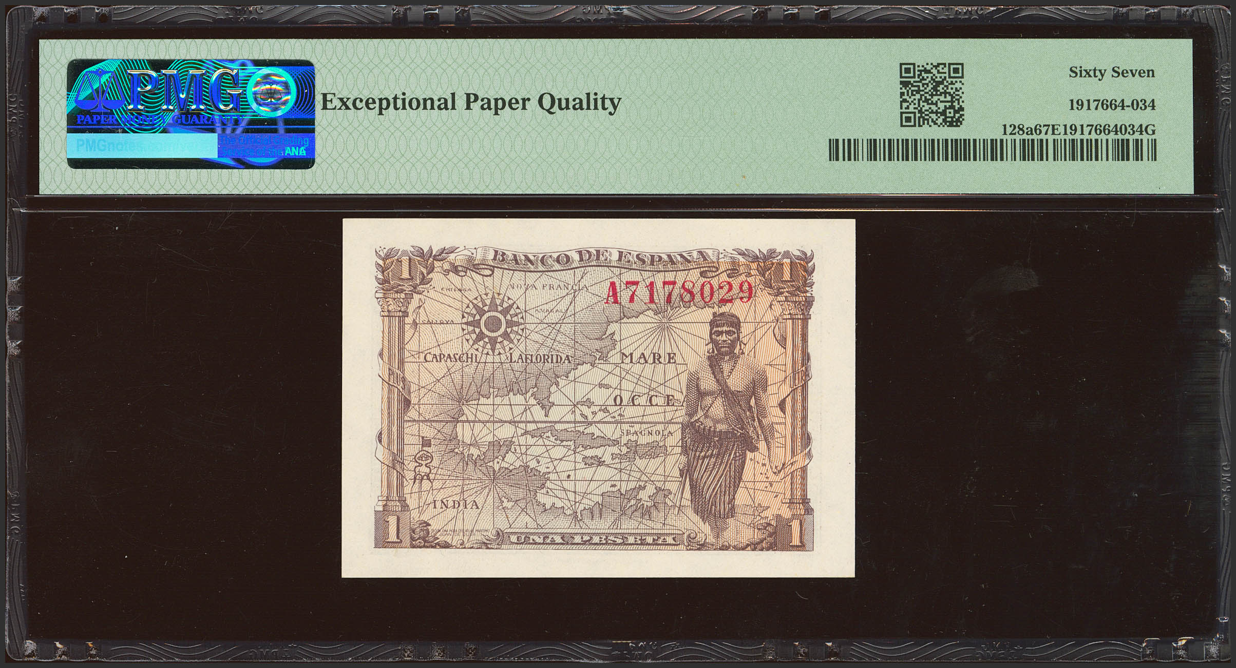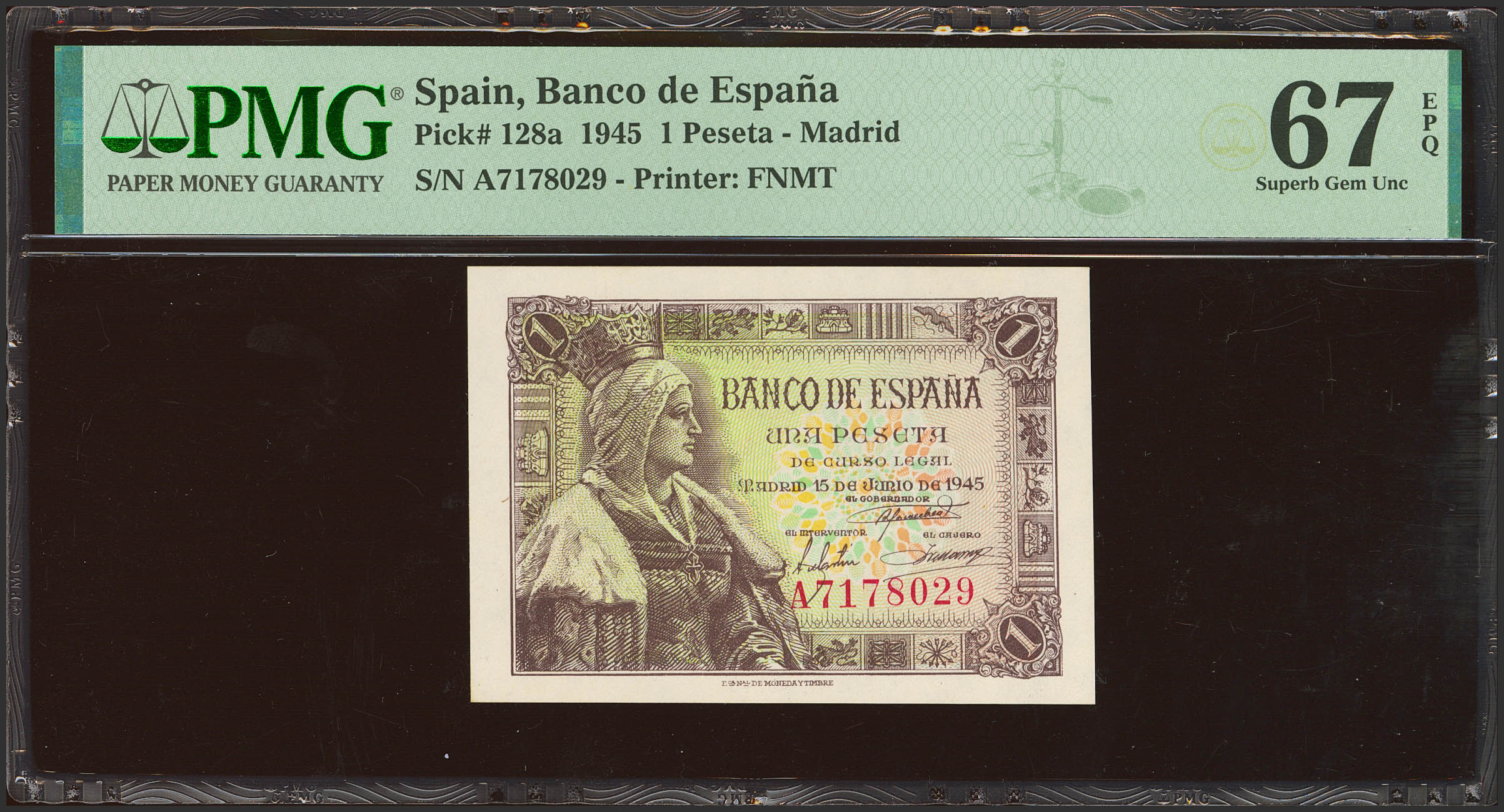 1 Peseta. 15 de Junio de 1945. Serie A. (Edifil 2023: 448a, Pick: 128a). Inusual en esta conservación, apresto original. SC. Encapsulado PMG67EPQ.