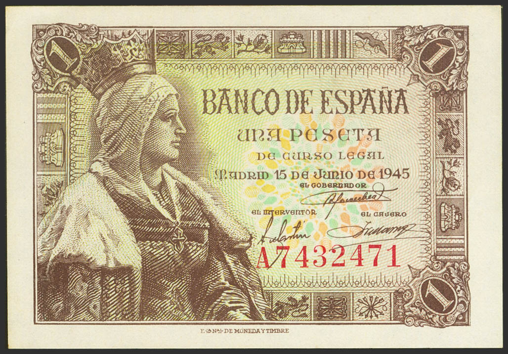 1 Peseta. 15 de Junio de 1945. Serie A. (Edifil 2021: 448a). Apresto original. SC-.