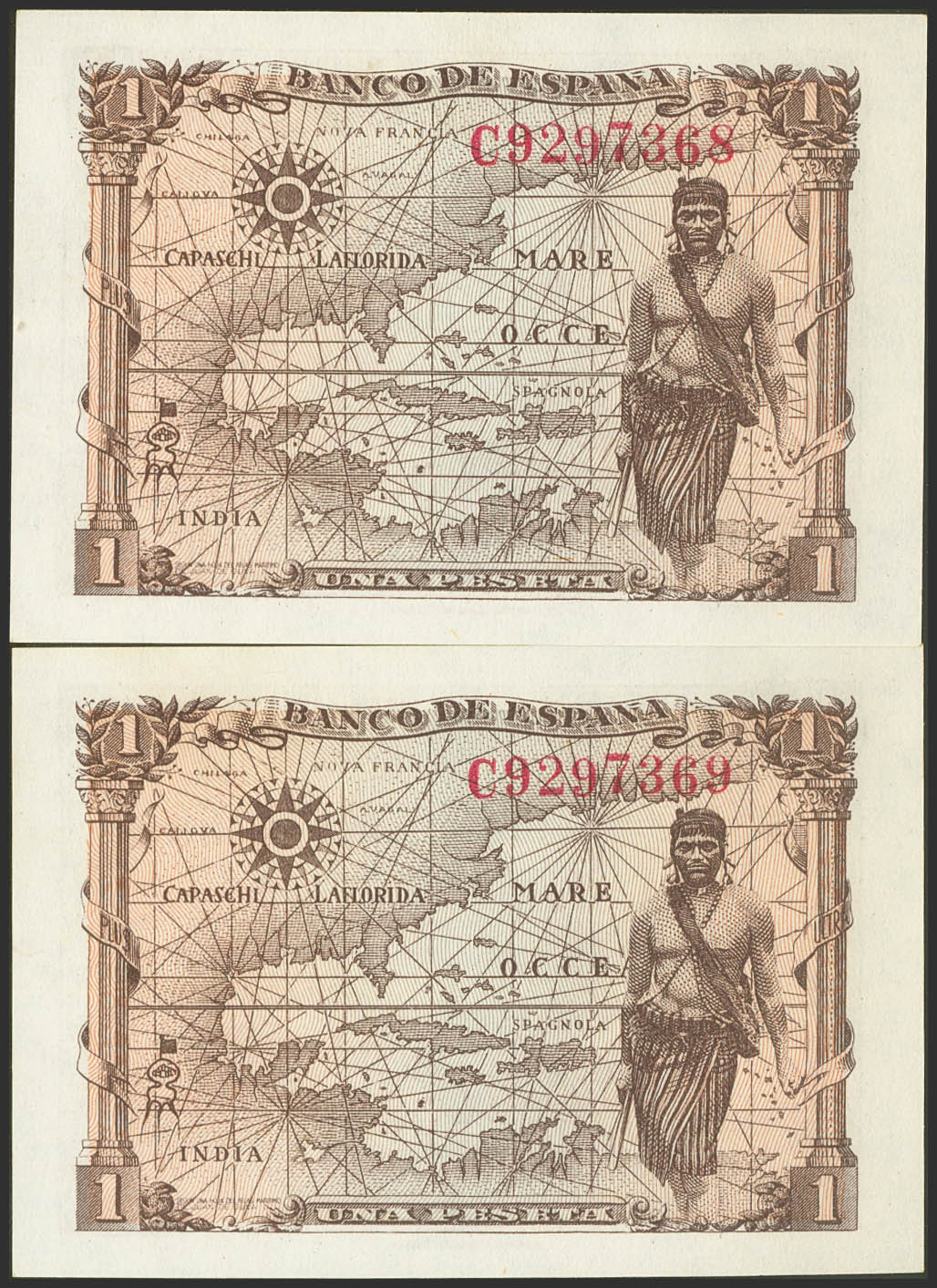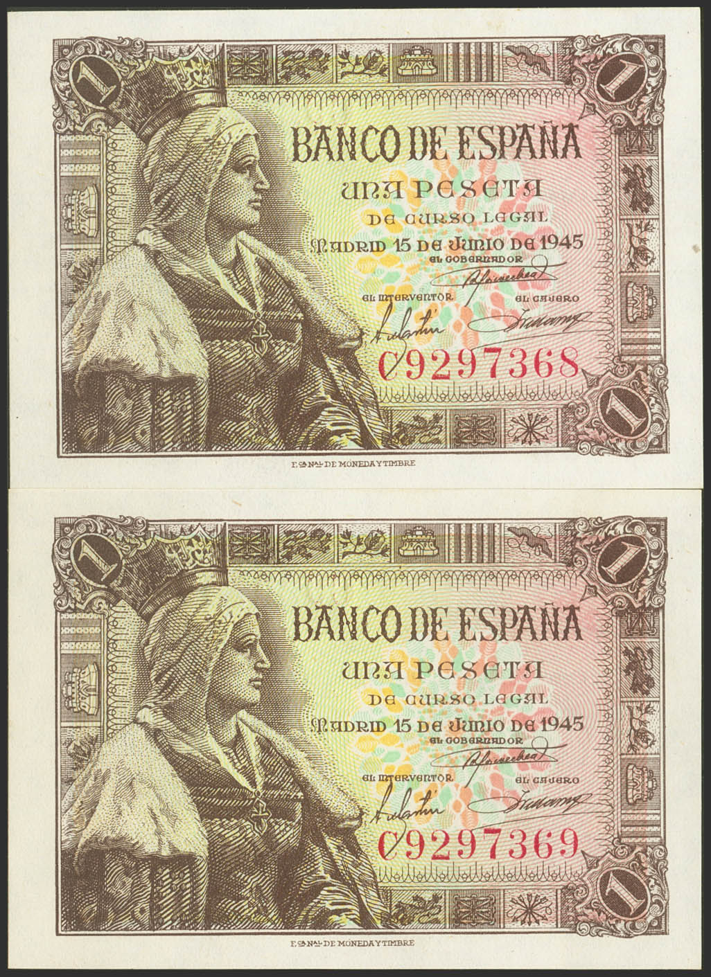 1 Peseta. 15 de Junio de 1945. Pareja correlativa. Serie C. (Edifil 2021: 448a). Apresto original. SC.