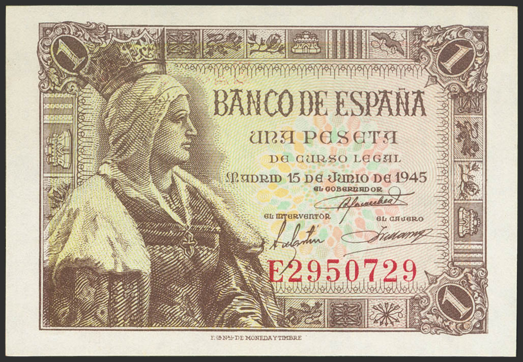 1 Peseta. 15 de Junio de 1945. Serie E. (Edifil 2023: 448a). Apresto original. SC.