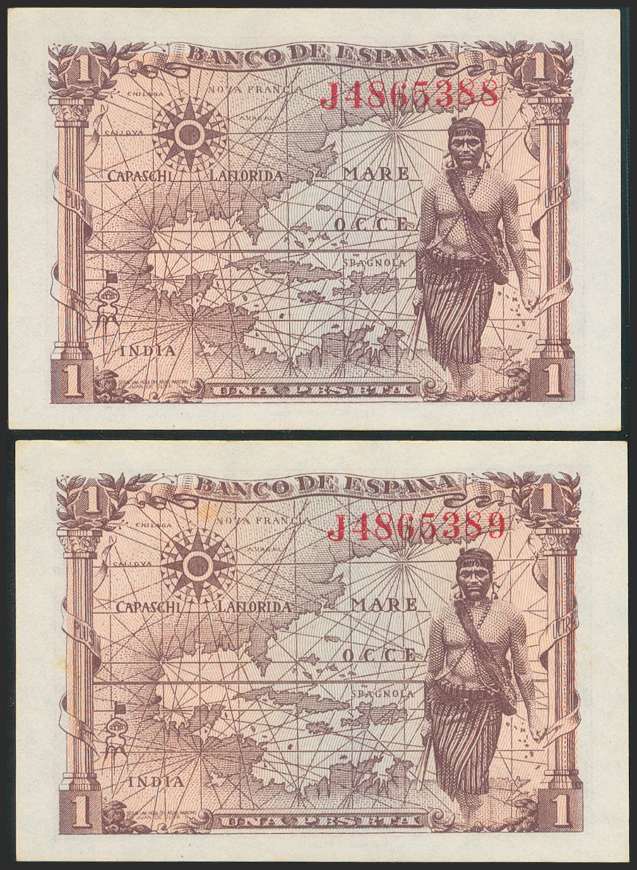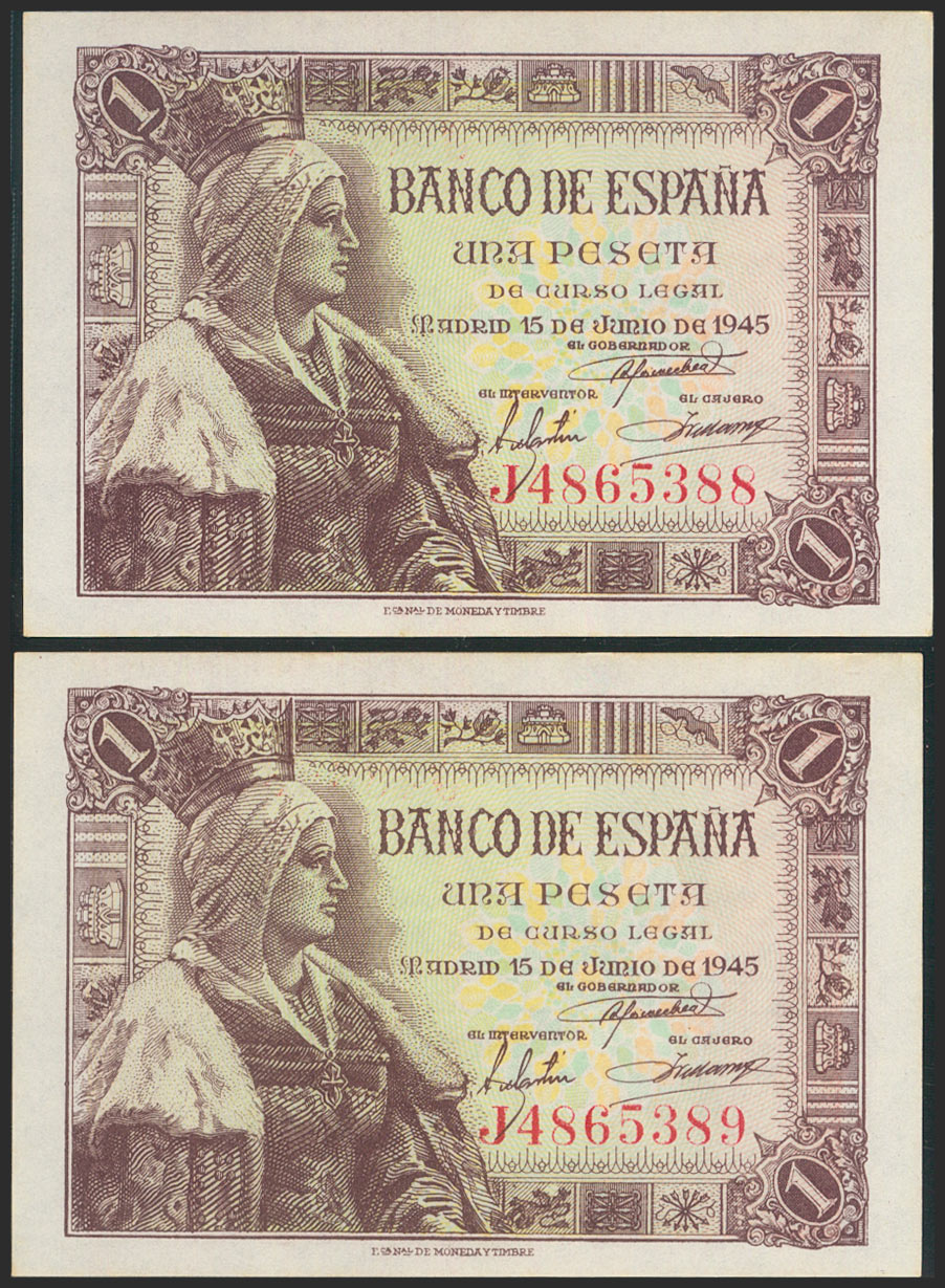 1 Peseta. 15 de Junio de 1945. Pareja correlativa. Serie J. (Edifil 2021: 448a). Conserva gran parte del apresto original. EBC+.