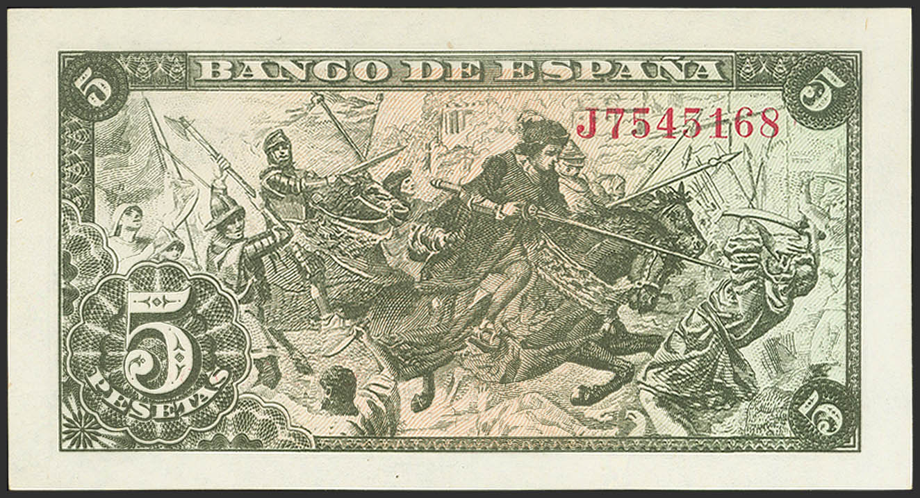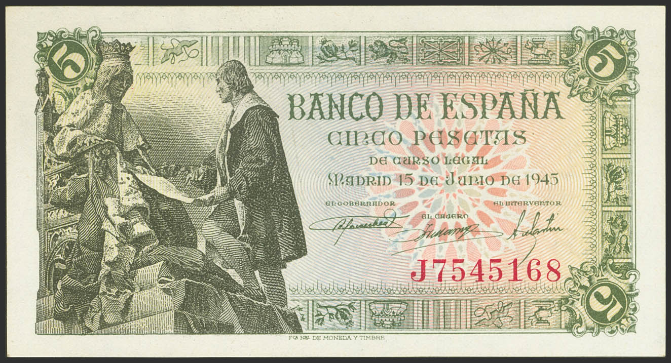 5 Pesetas. 15 de Junio de 1945. Serie J. (Edifil 2023: 449a). Apresto orignal. SC.