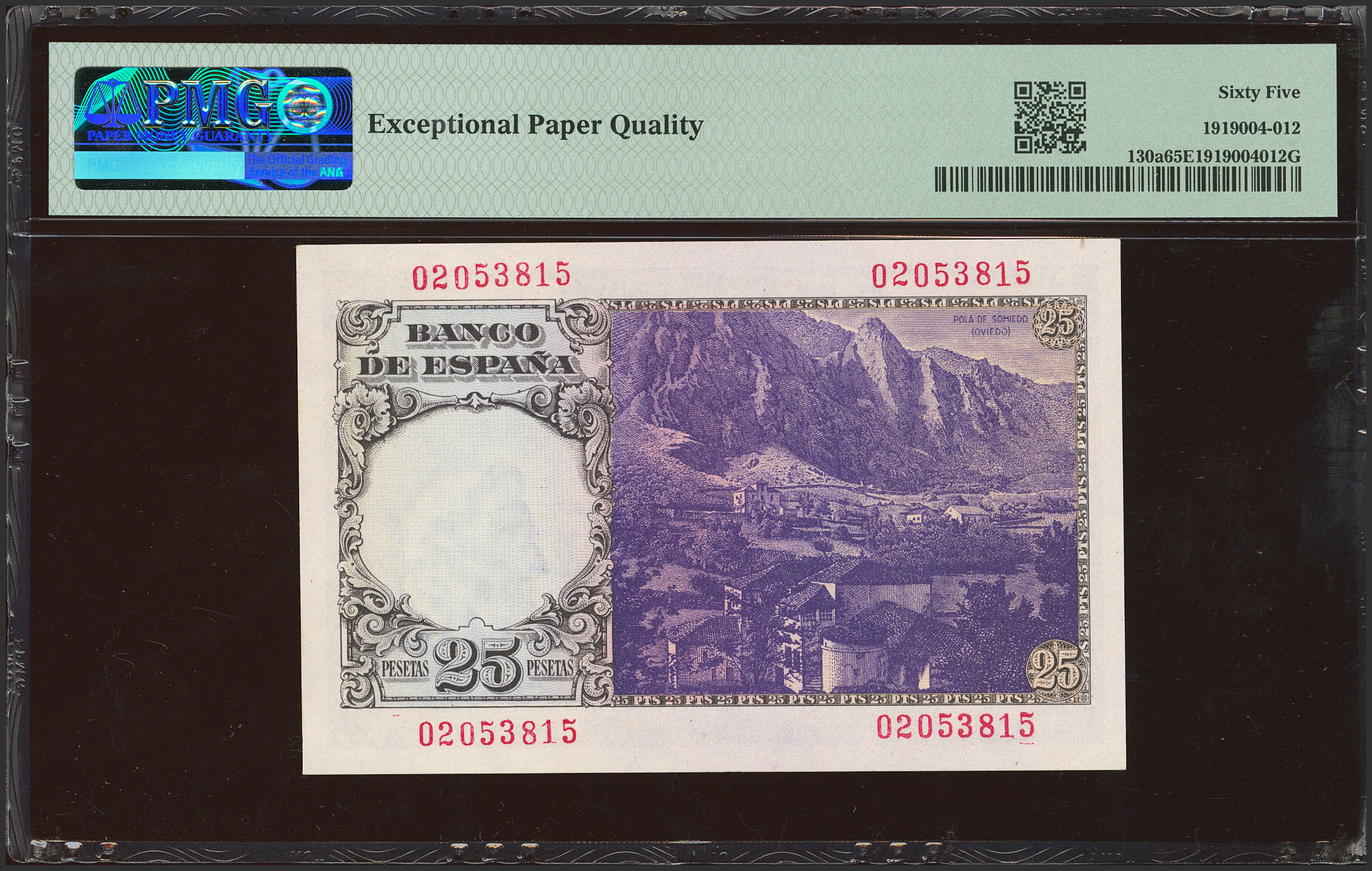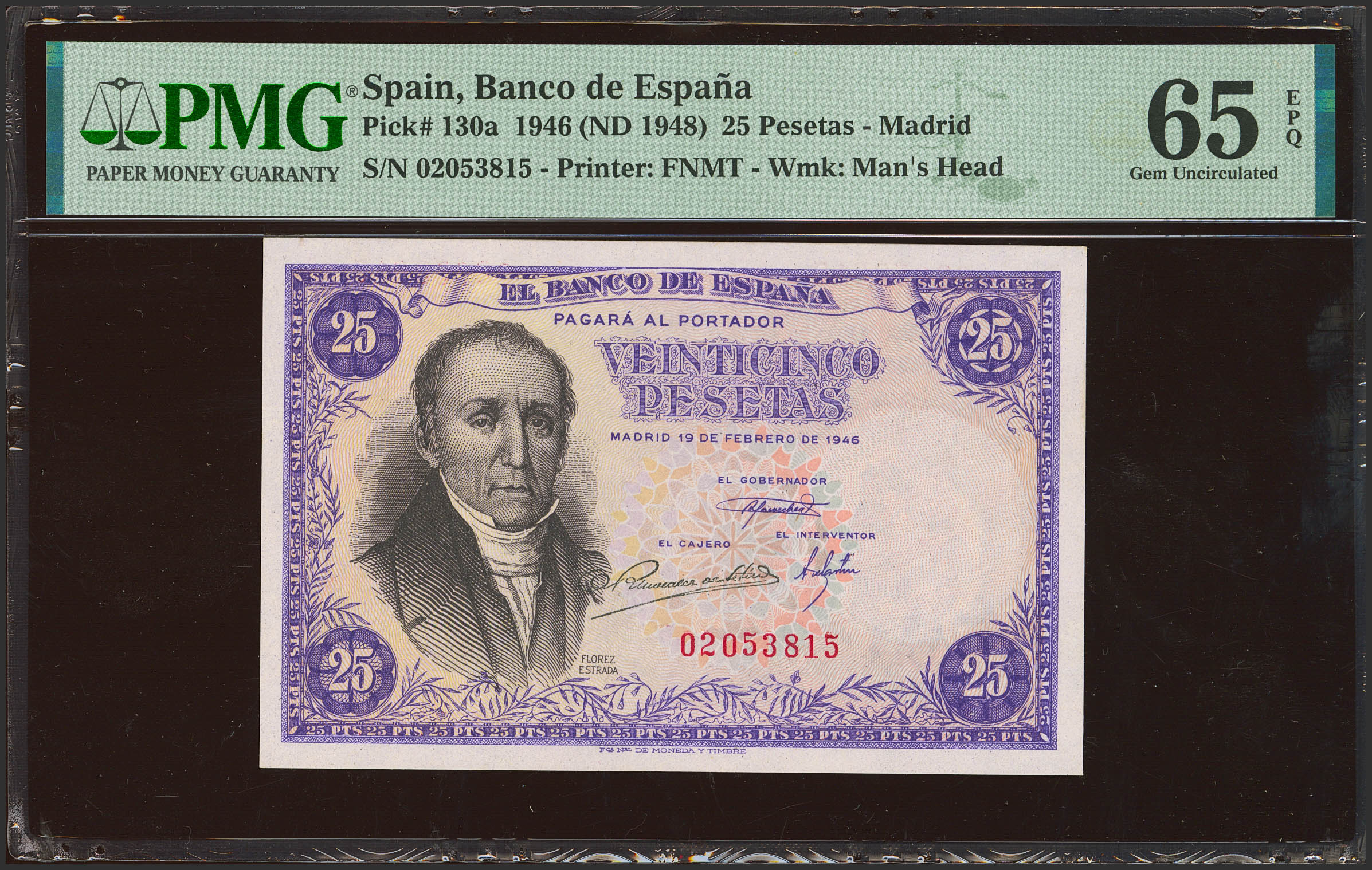 25 Pesetas. 19 de Febrero de 1946. Sin serie. (Edifil 2023: 450, Pick: 130a). Rarísimo en esta calidad, apresto original. SC. Encapsulado PMG65EPQ.