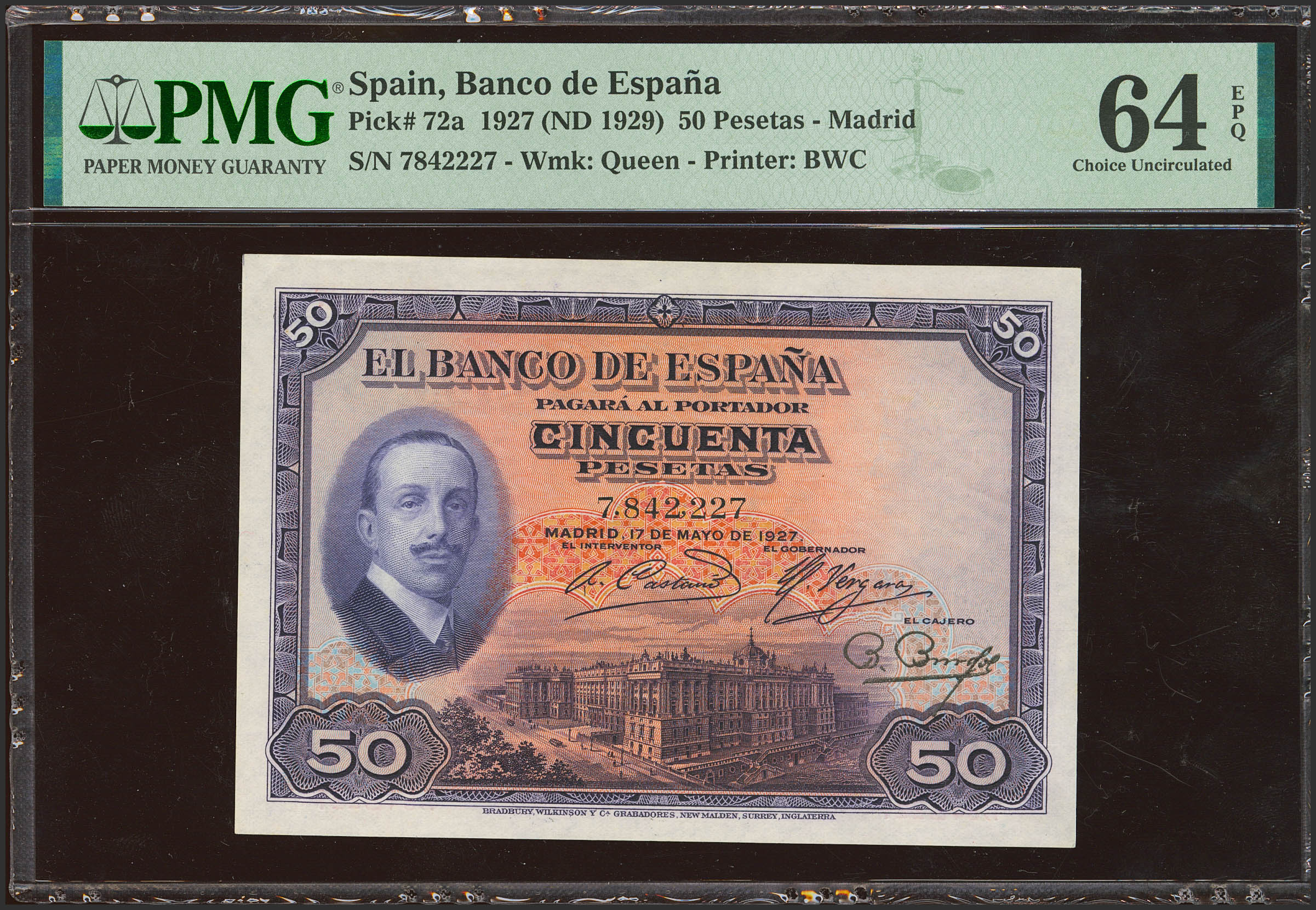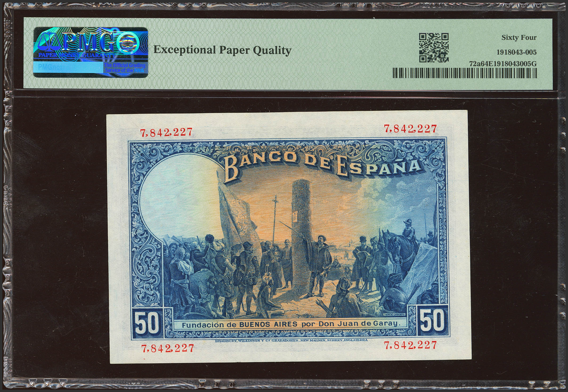 50 Pesetas. 17 de Mayo de 1927. Sin serie. (Edifil 2021: 326, Pick: 72a). Rarísimo en esta excepcional calidad, apresto original. SC. Encapsulado PMG64EPQ. (para hacernos idea de la rareza, a fecha 1 de Junio de 2024, este billete es el tercer mejor calificado en PMG, solo hay dos notas superiores a este billete que son dos 66EPQ, uno de ellos tiene puntitos de aguja, por lo que se trata de la segunda mejor nota en perfecto estado)