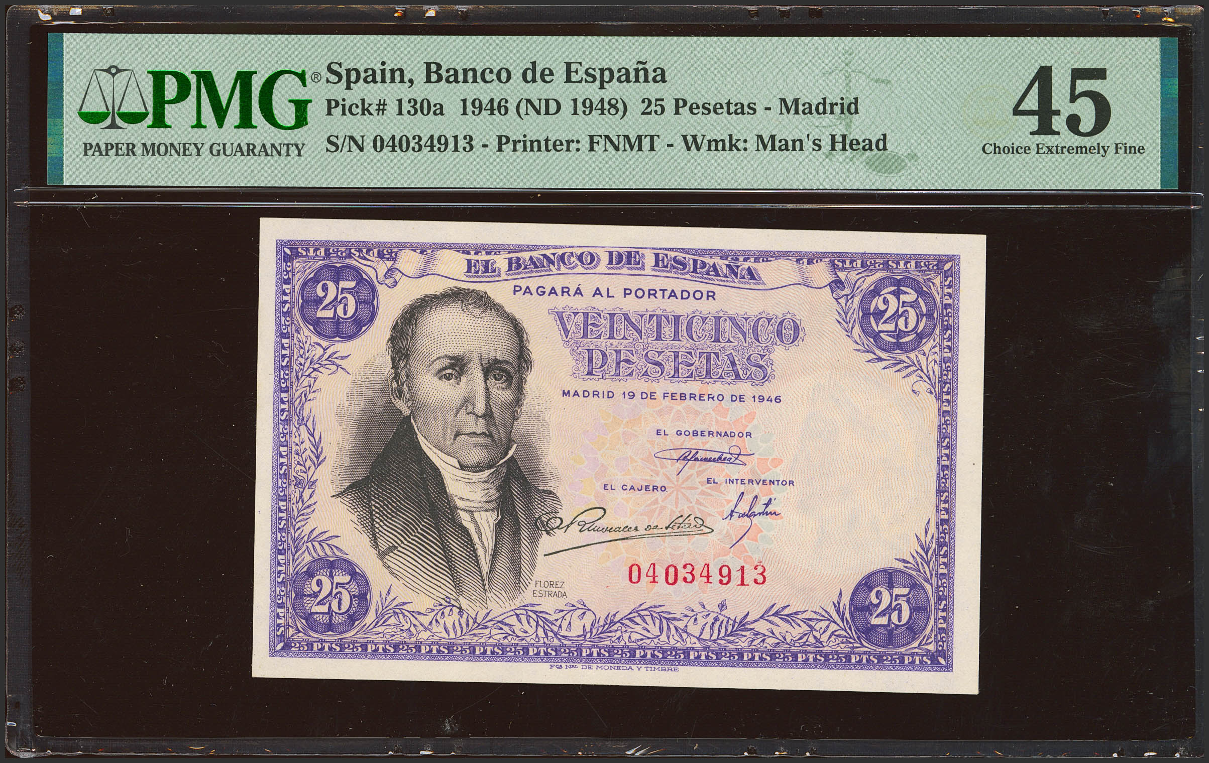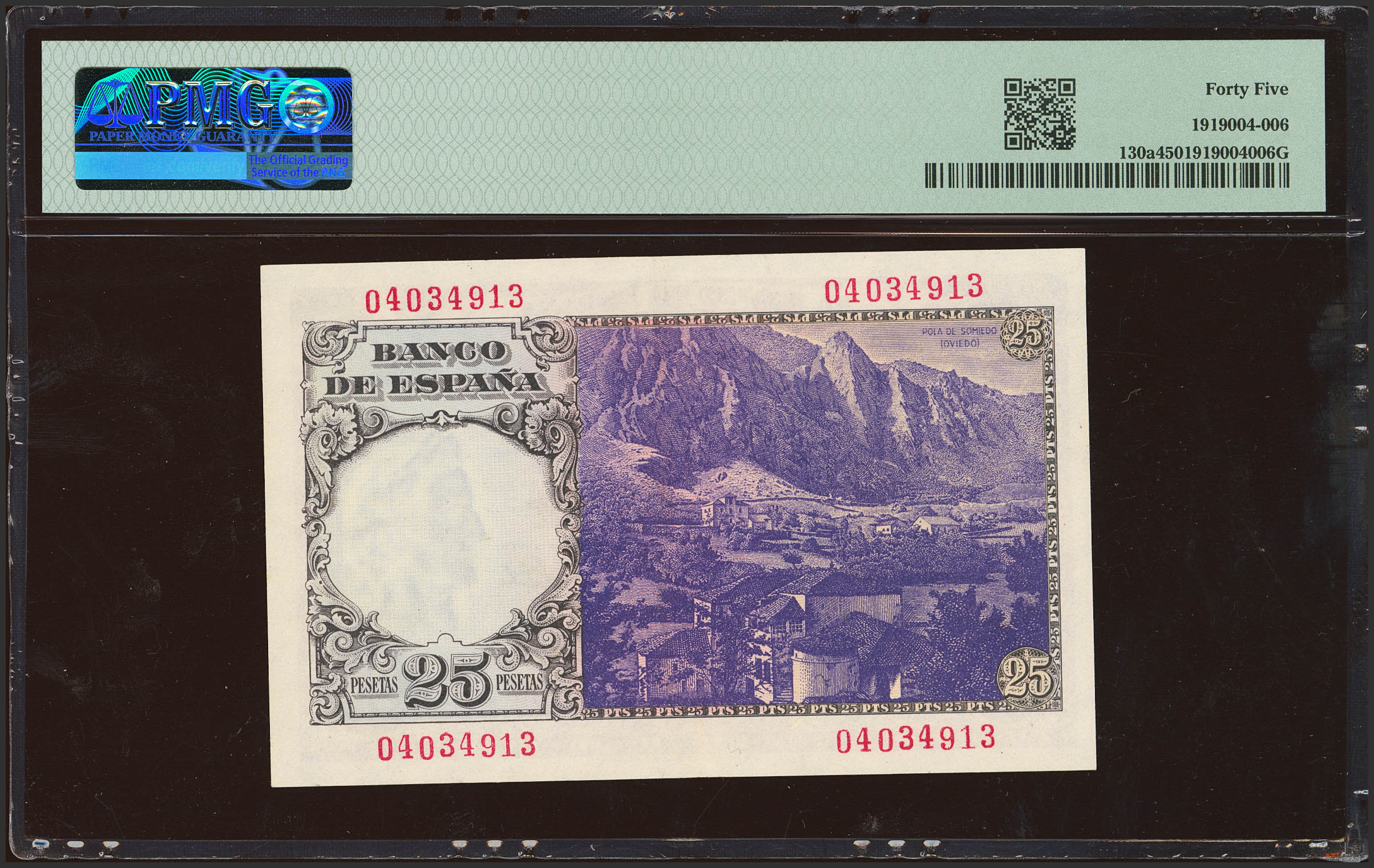 25 Pesetas. 19 de Febrero de 1946. Sin serie. (Edifil 2023: 450, Pick: 130a). EBC-. Encapsulado PMG45.