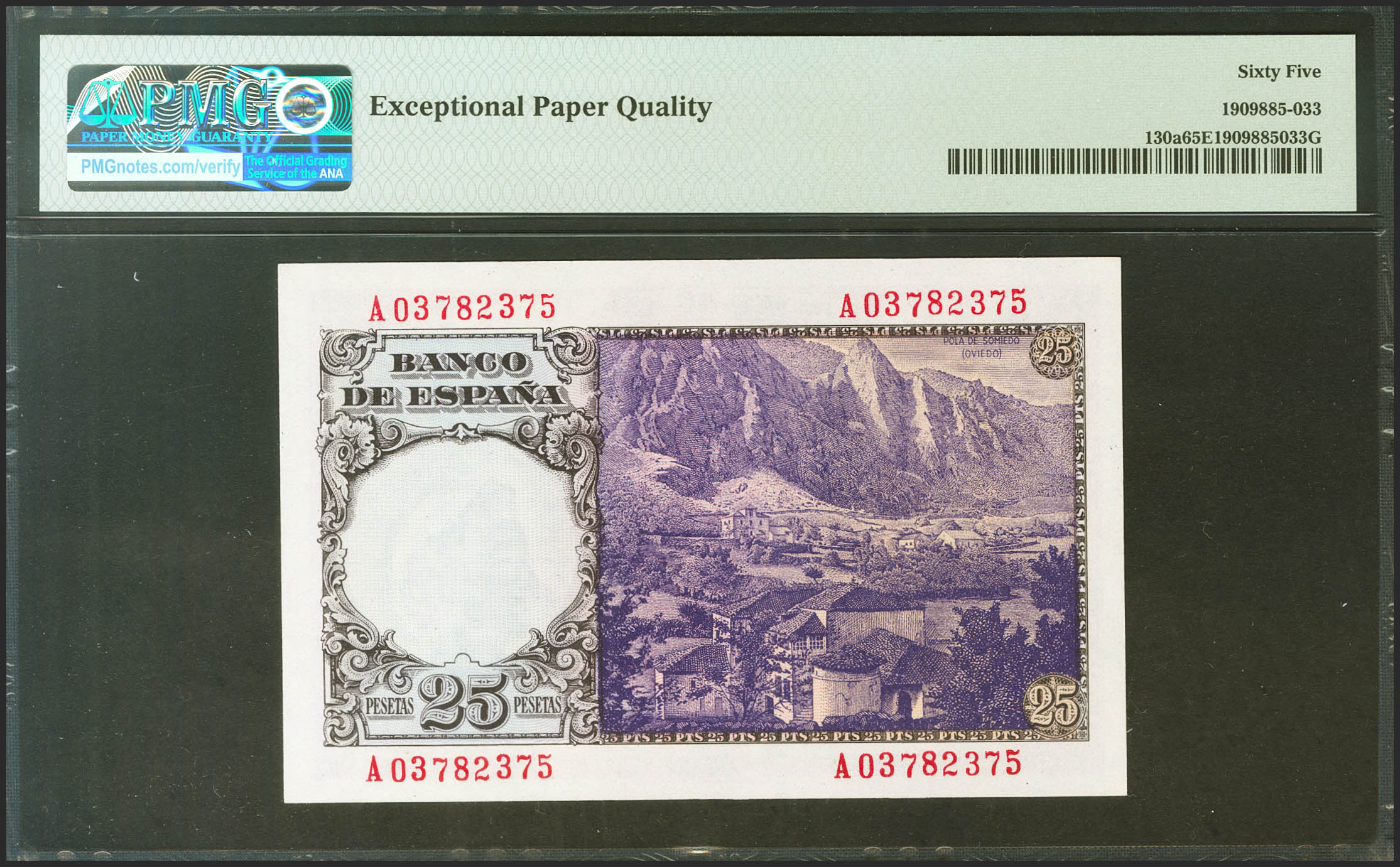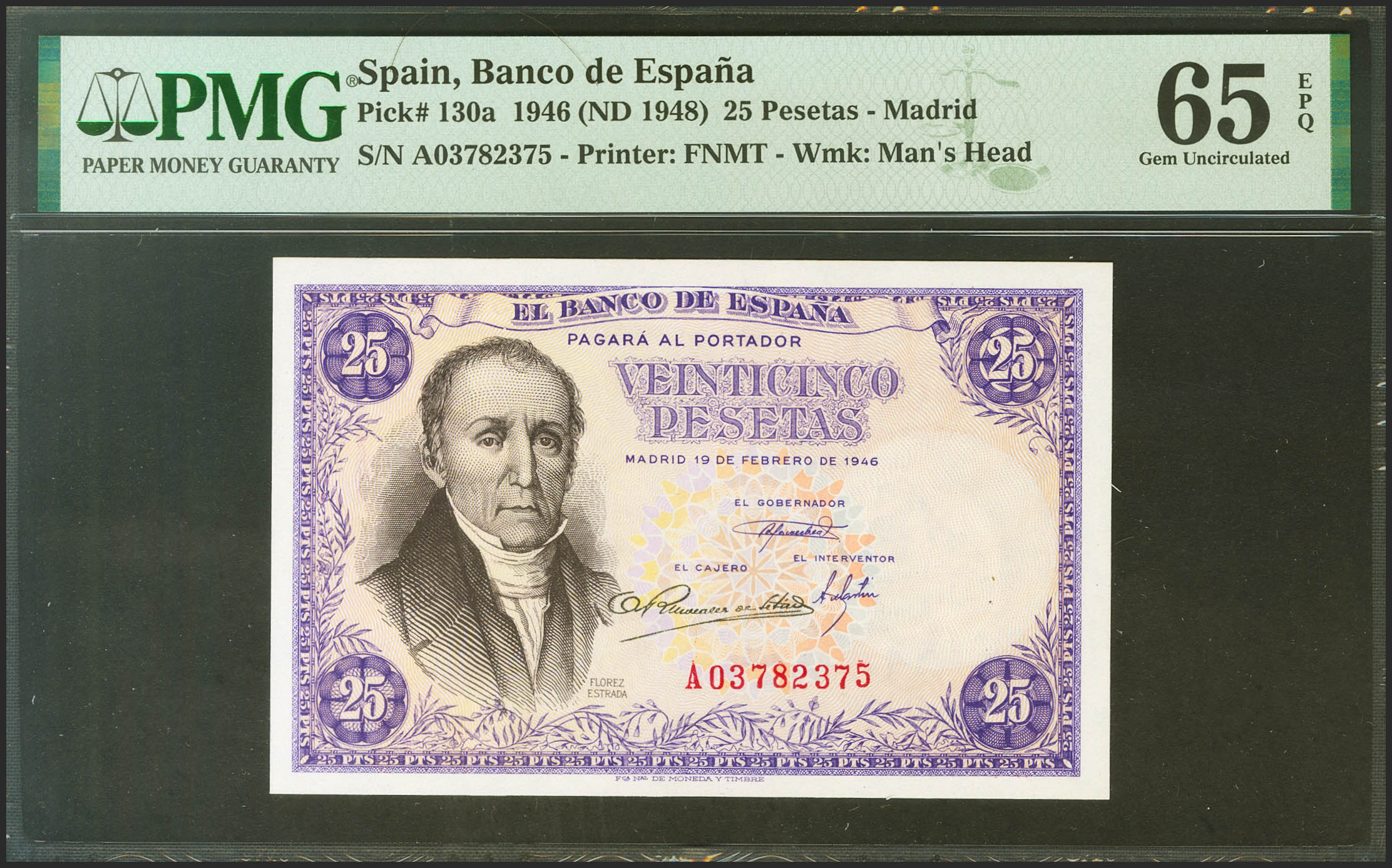 25 Pesetas. 20 de Febrero de 1946. Serie A. (Edifil 2021: 450a, Pick: 130a). Raro en esta calidad, apresto original. SC. Encapsulado PMG65EPQ.